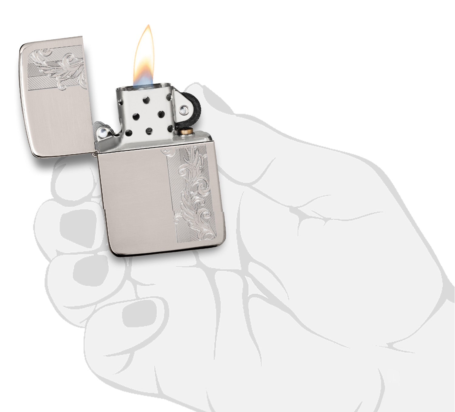 El complejo diseño en forma de chevrones y filigrana se ha creado mediante el proceso de grabado rotativo de Zippo, lo que le da un toque Art Nouveau a la parte delantera y trasera de este encendedor de plata de ley con acabado satinado a mano, réplica de 1941. Se entrega en una caja de regalo. Para un rendimiento óptimo, rellénelo con combustible para encendedores Zippo.