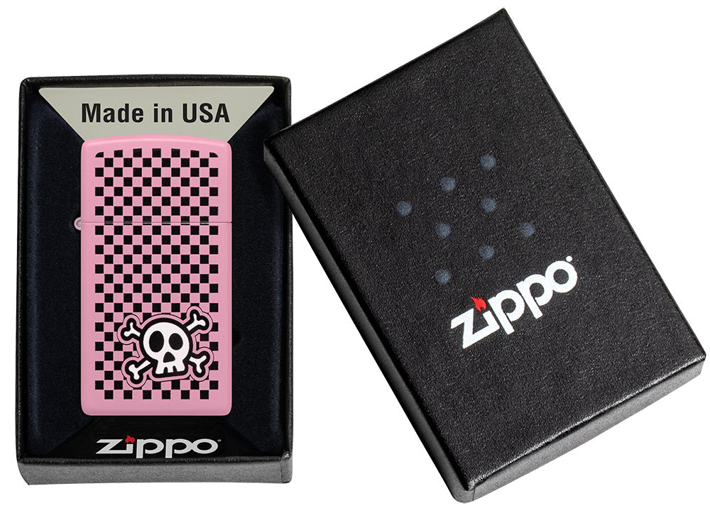 Este encendedor Slim® Pink Matte es igual de bonito que oscuro. Una calavera inspirada en un tatuaje se asienta dulcemente sobre un diseño de cuadros en un diseño Color Image natural y divertido.