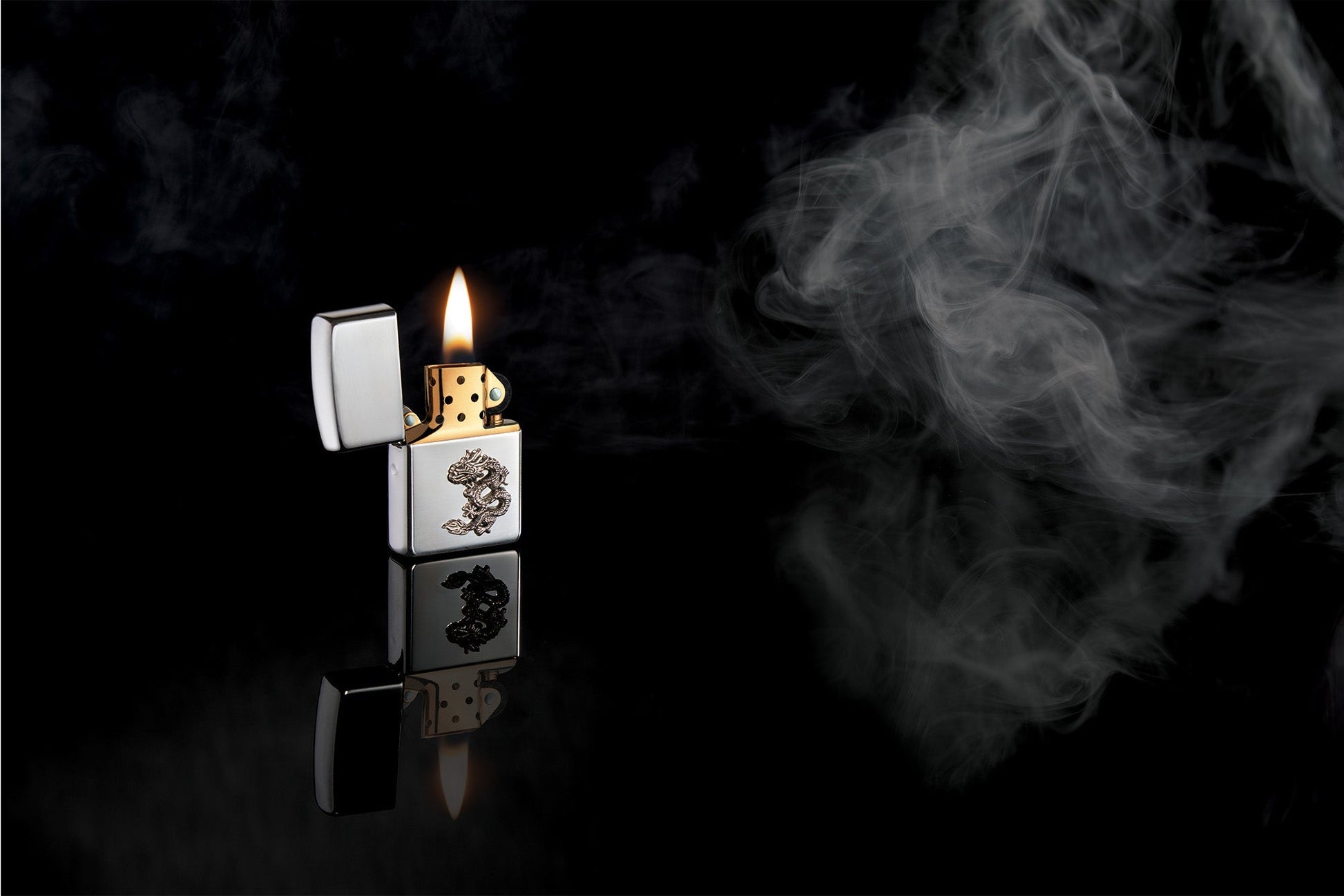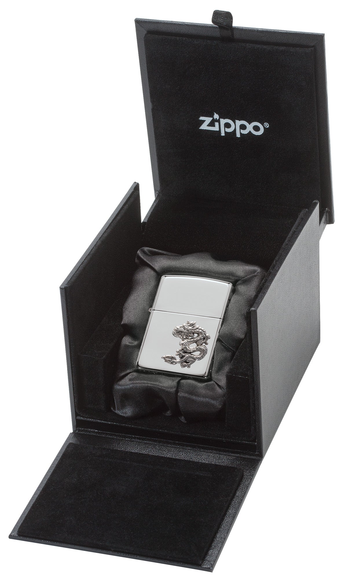 Un dragón oriental de buen augurio, símbolo de poder, fuerza y suerte, se despliega sobre un emblema de plata de ley colocado en el encendedor a prueba de viento Armor® de plata de ley altamente pulida, brillante como un espejo. Se entrega en una caja de regalo. Para un rendimiento óptimo, rellénelo con combustible para encendedores Zippo.