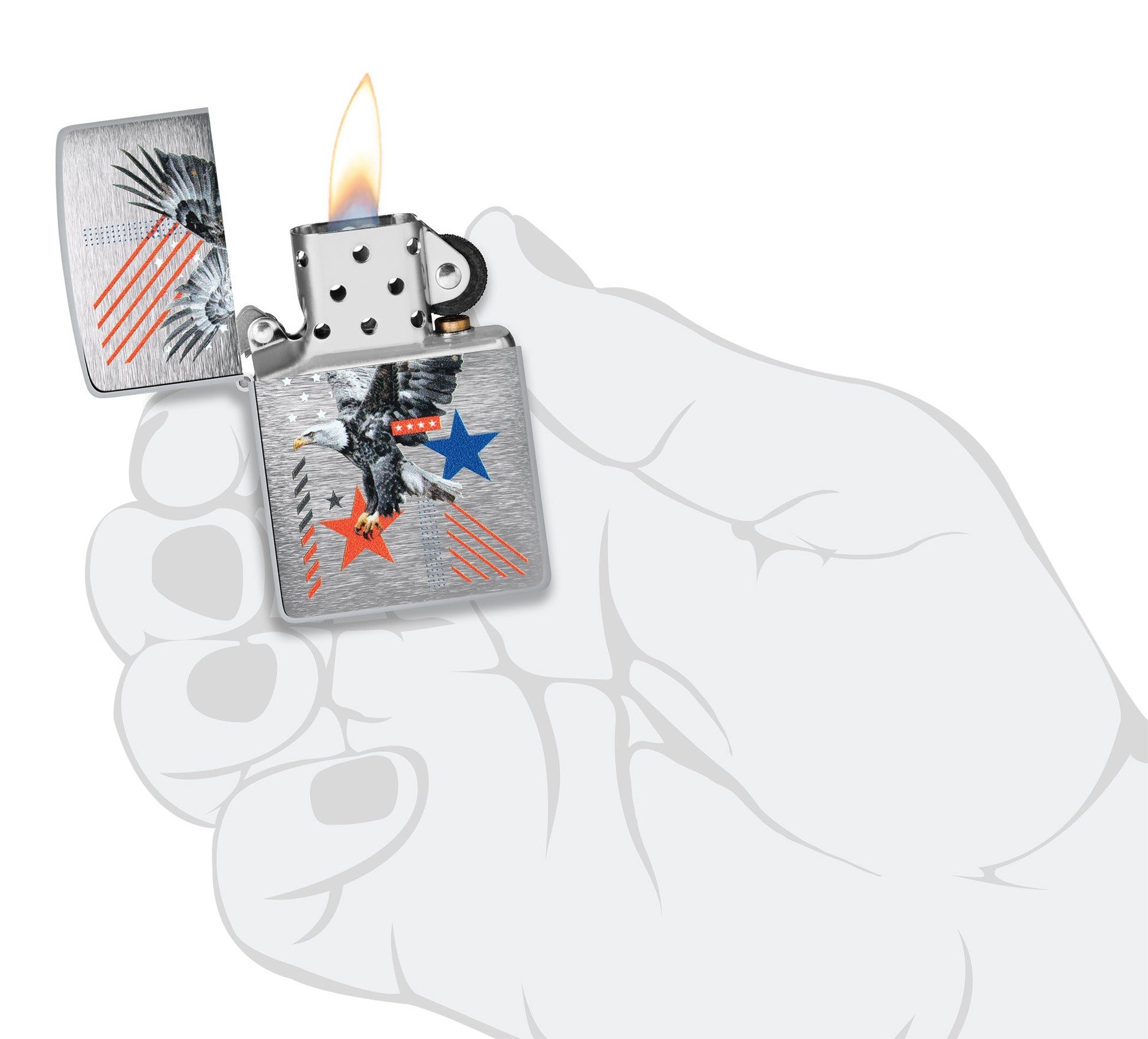 Con un fondo de estrellas y rayas patrióticas, una majestuosa águila sobrevuela la superficie de este encendedor clásico de cromo cepillado en un diseño audaz a todo color.