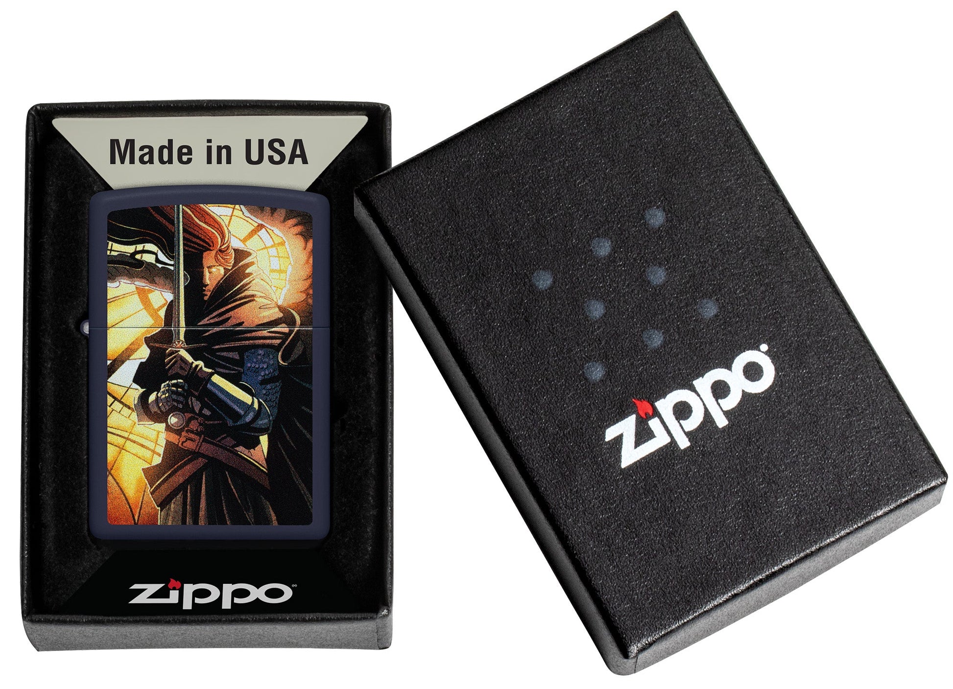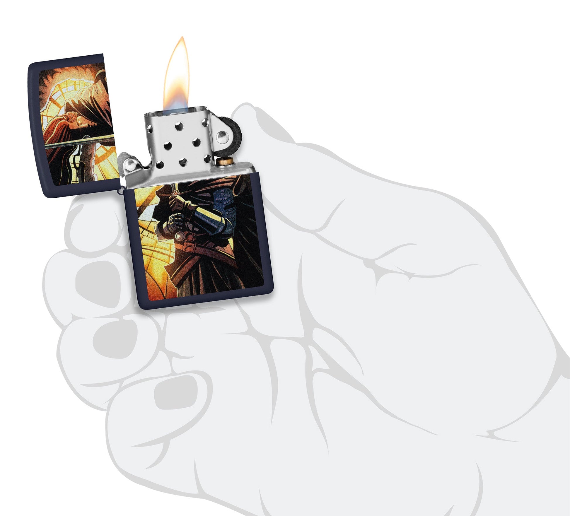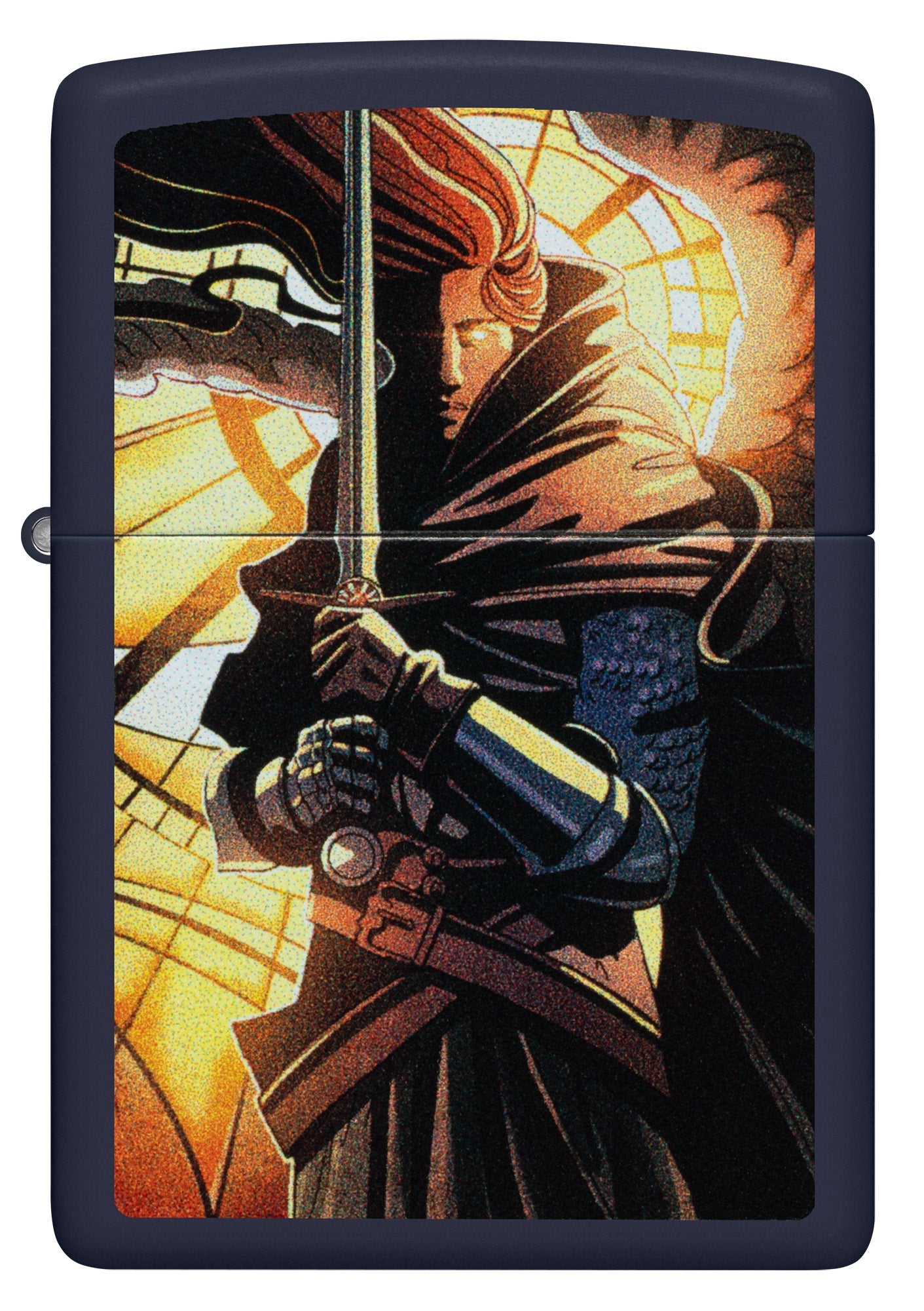 Lo moderno se une con lo medieval en este encendedor clásico Nave Matte. Iluminado por una luz resplandeciente, un guerrero con armadura se prepara para la batalla en diseño abstracto a todo color.