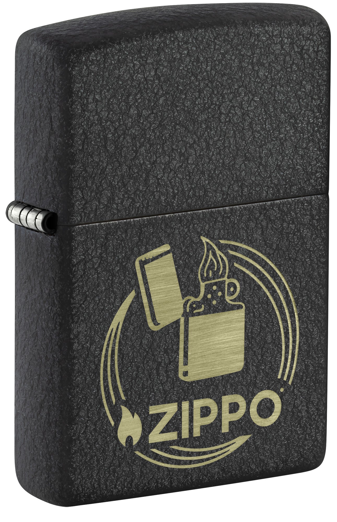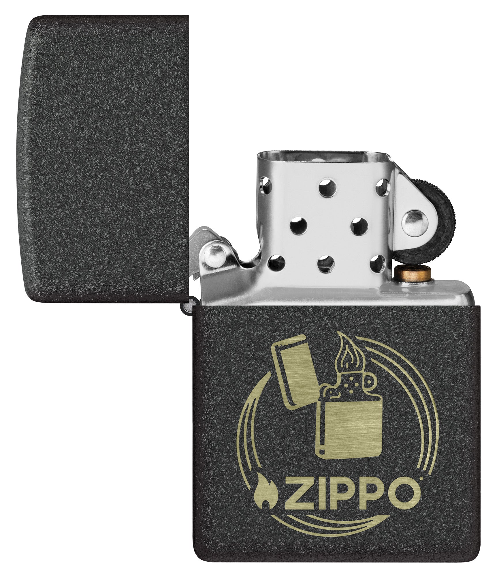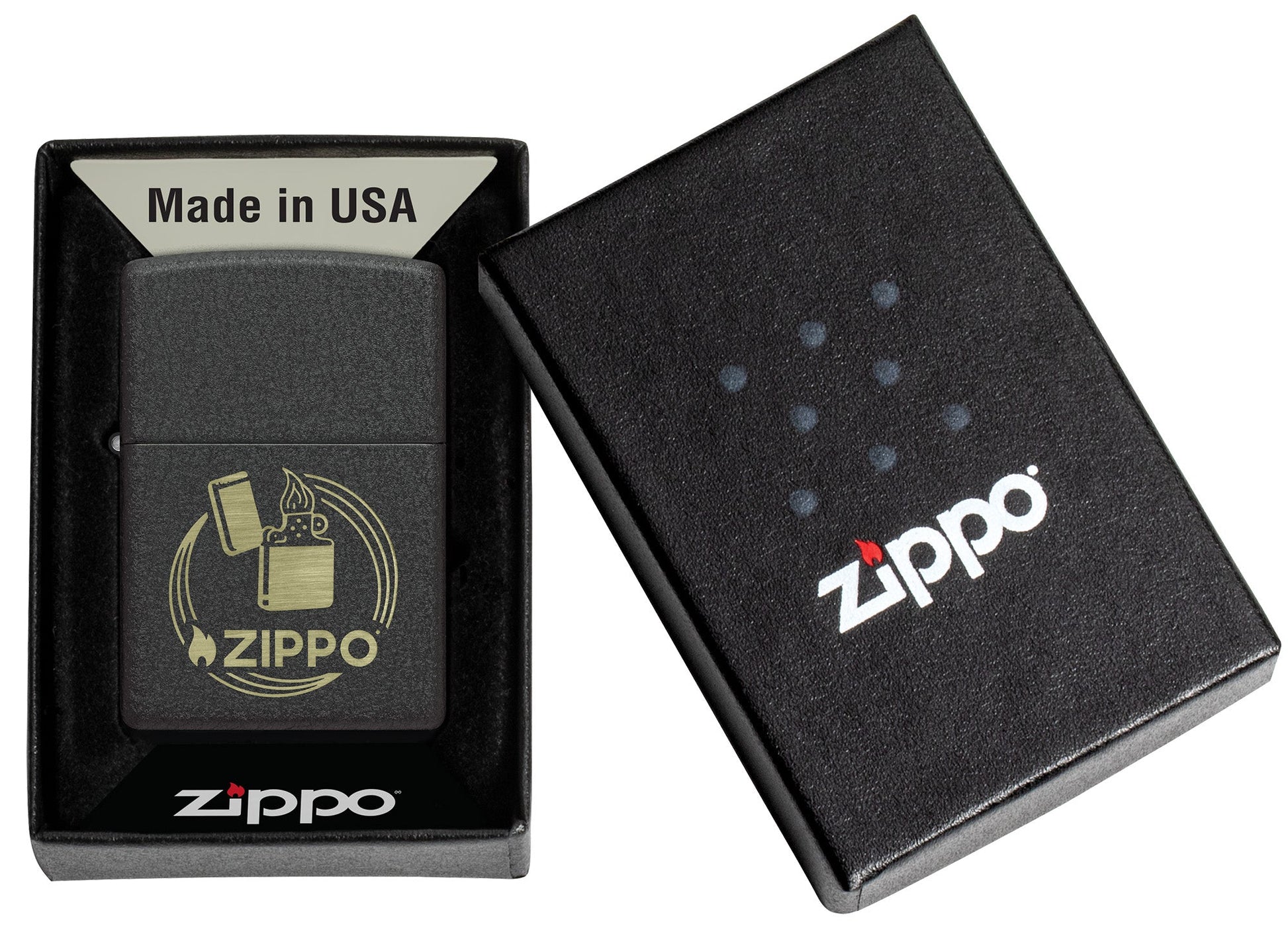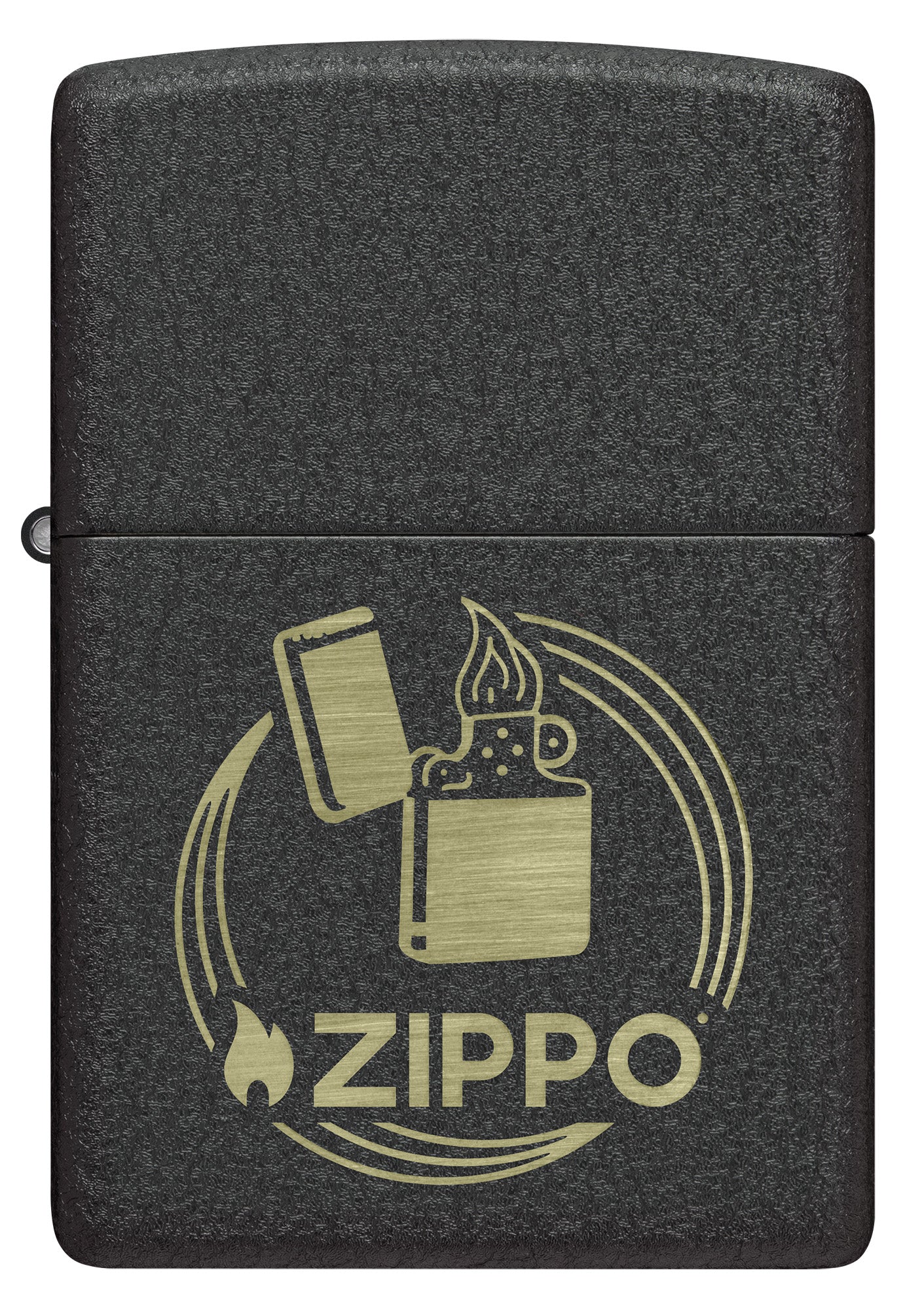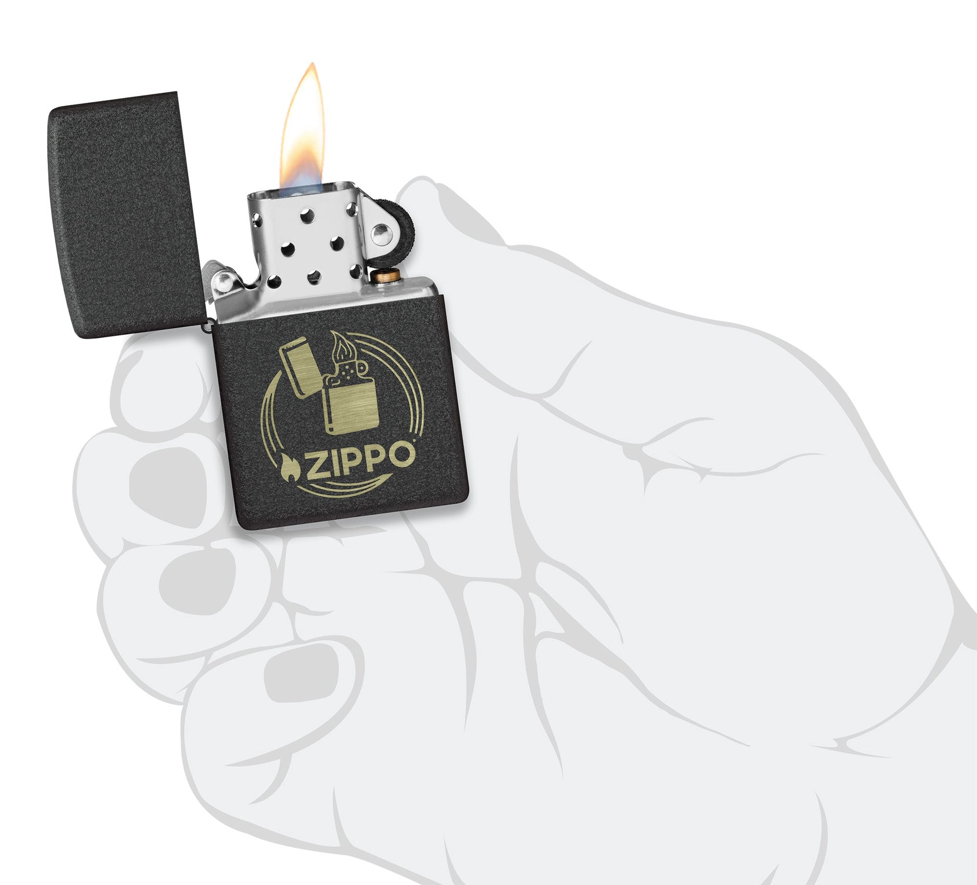 Un clásico encendedor cortavientos y el logotipo de Zippo aparecen en un diseño atemporal Laser Engrave, que contrasta a la perfección con nuestro icónico acabado Black Crackle®.