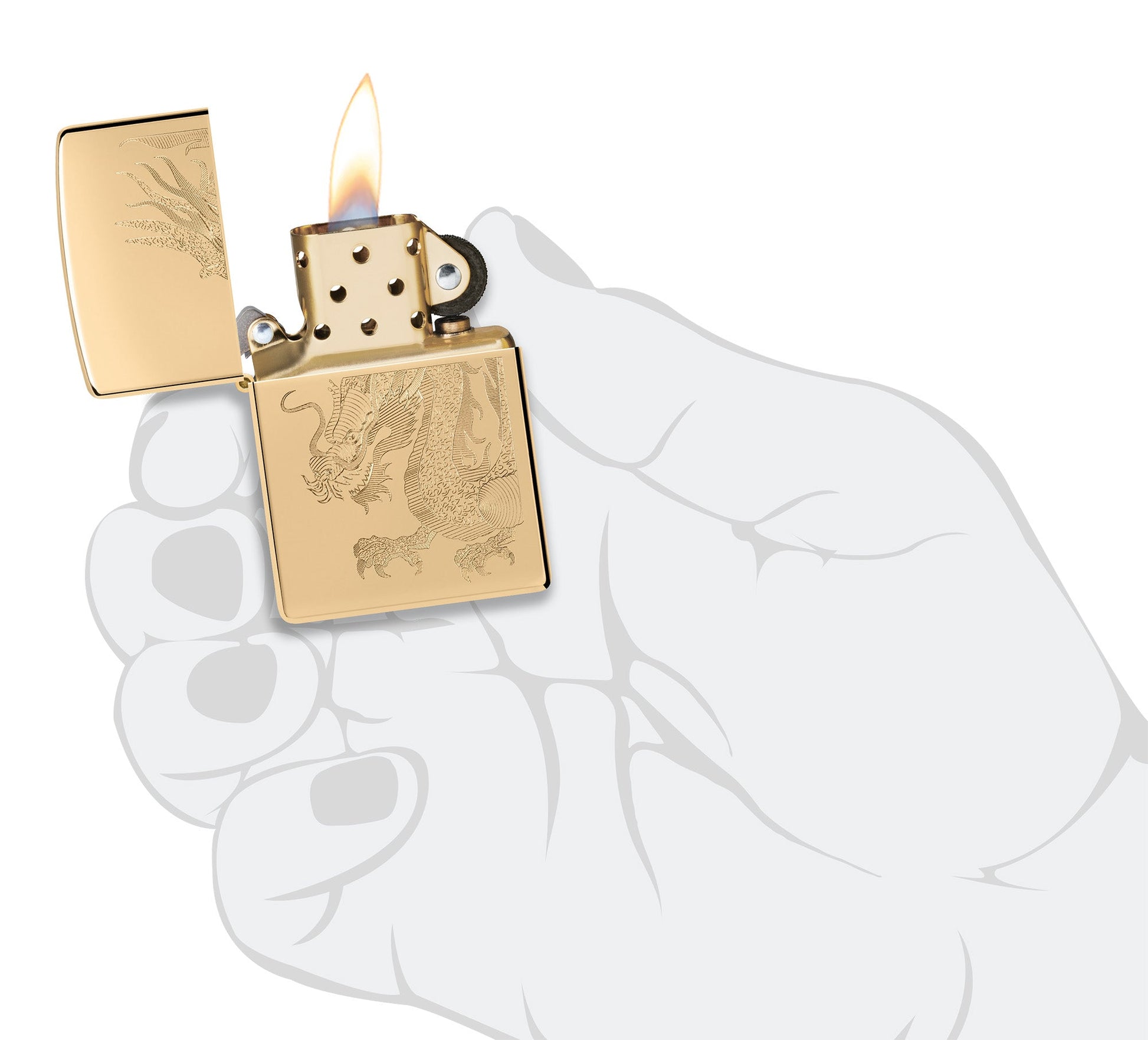 Símbolo de poder, fuerza y sabiduría, un feroz dragón se alga con fiereza sobre la superficie de este clásico encendedor High Polish Brass en un intrincado diseño Auto Engrave.