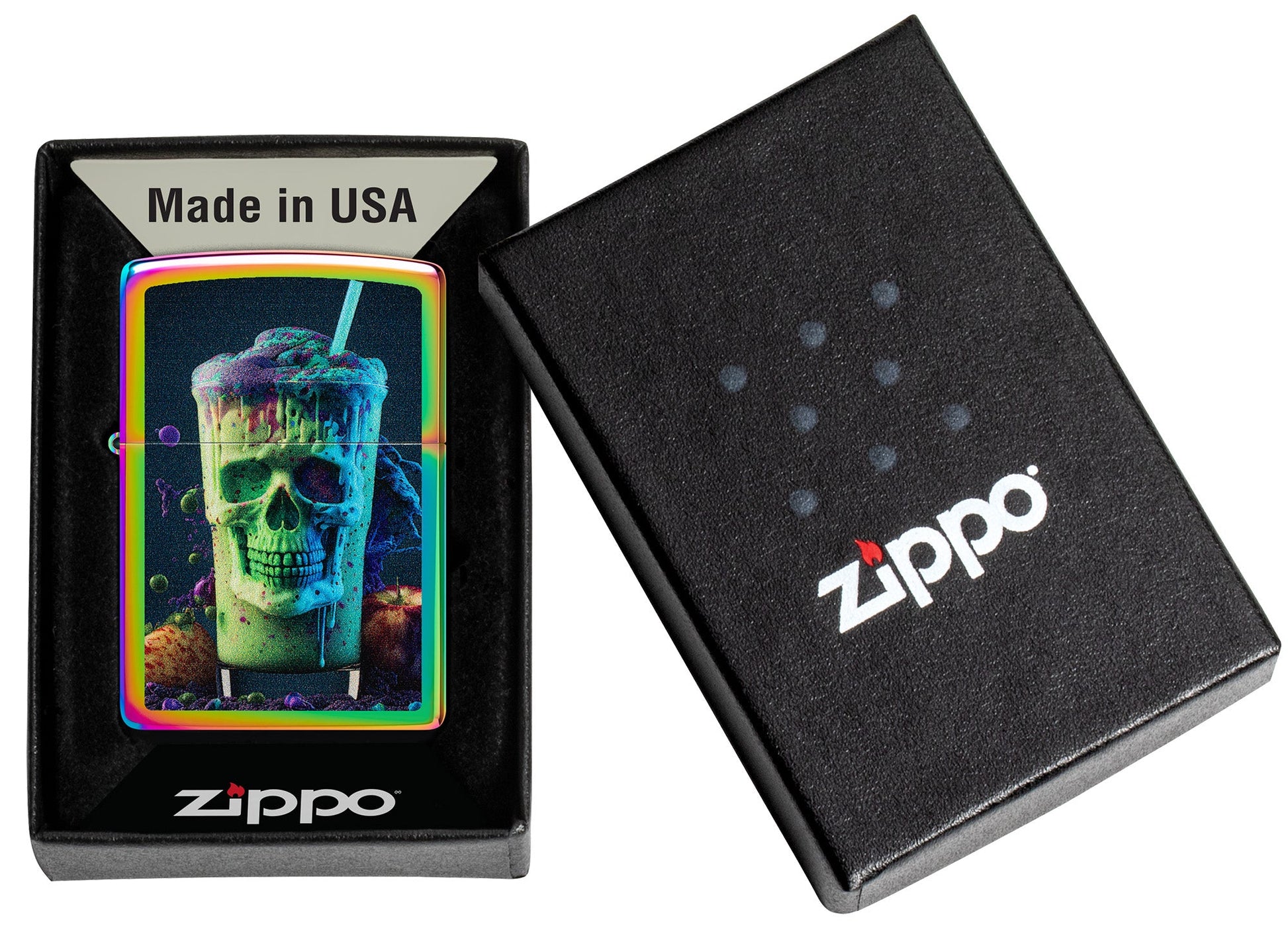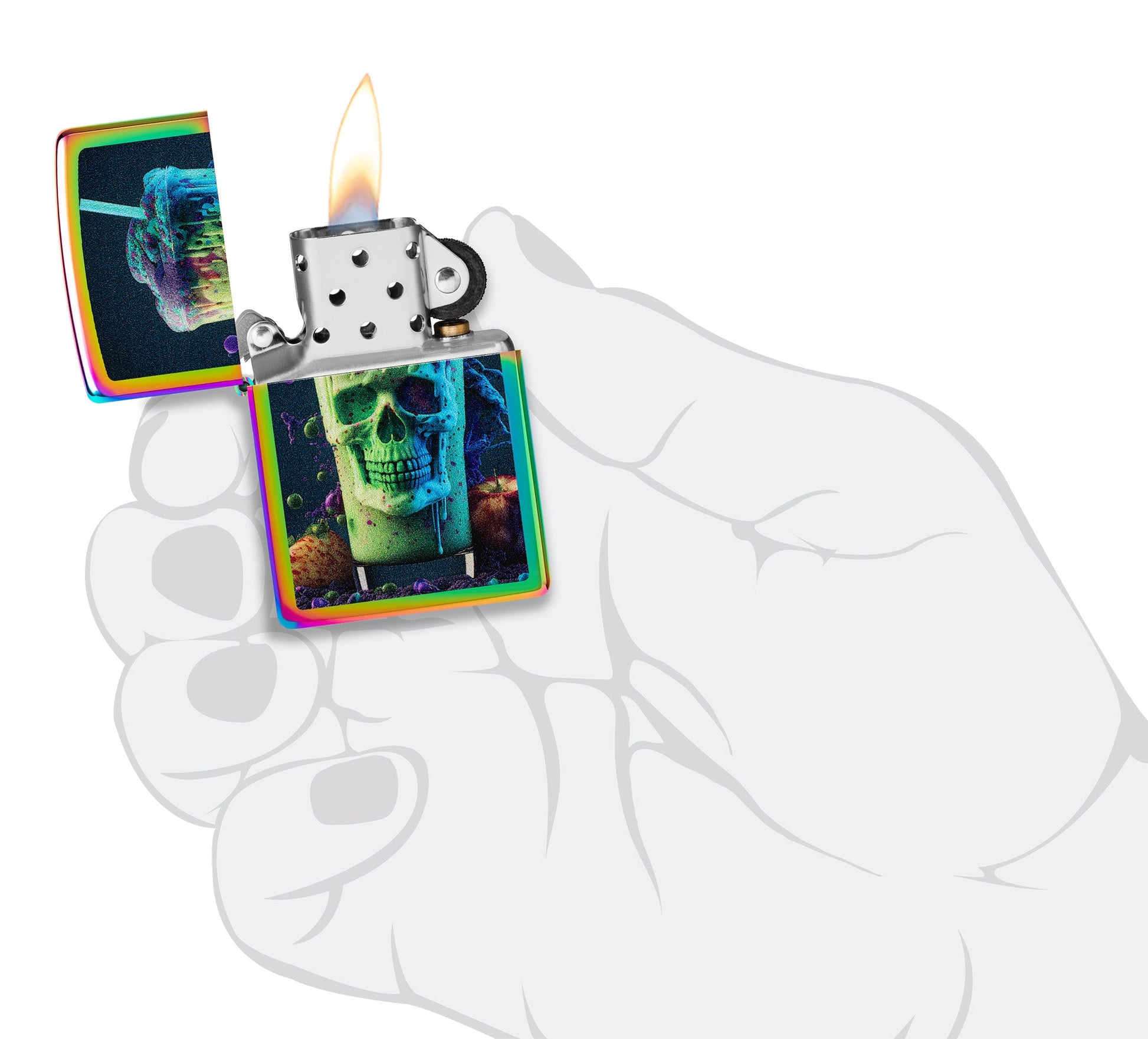 Dese un capricho con este clásico encendedor Multi Color. Una calavera amenazante se convierte en un terrorífico batido mediante un vibrante diseño Color Image.