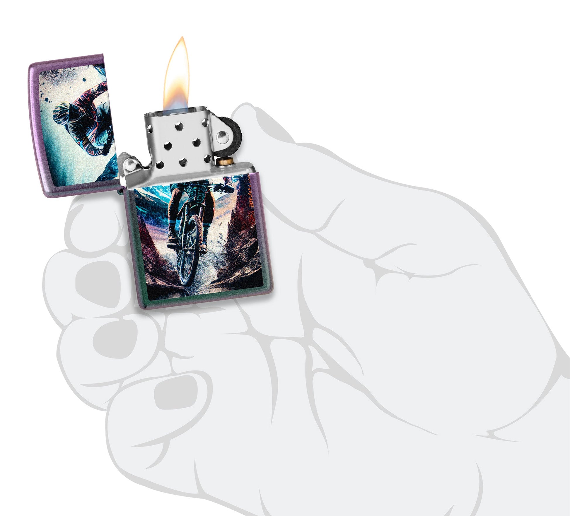 Lleve este clásico encendedor Iridescent en su próxima aventura. El emocionante diseño Color Image muestra a un ciclista descendiendo por un sendero de montaña, con colores vibrantes que combinan a la perfección con el hipnotizante acabado del encendedor.