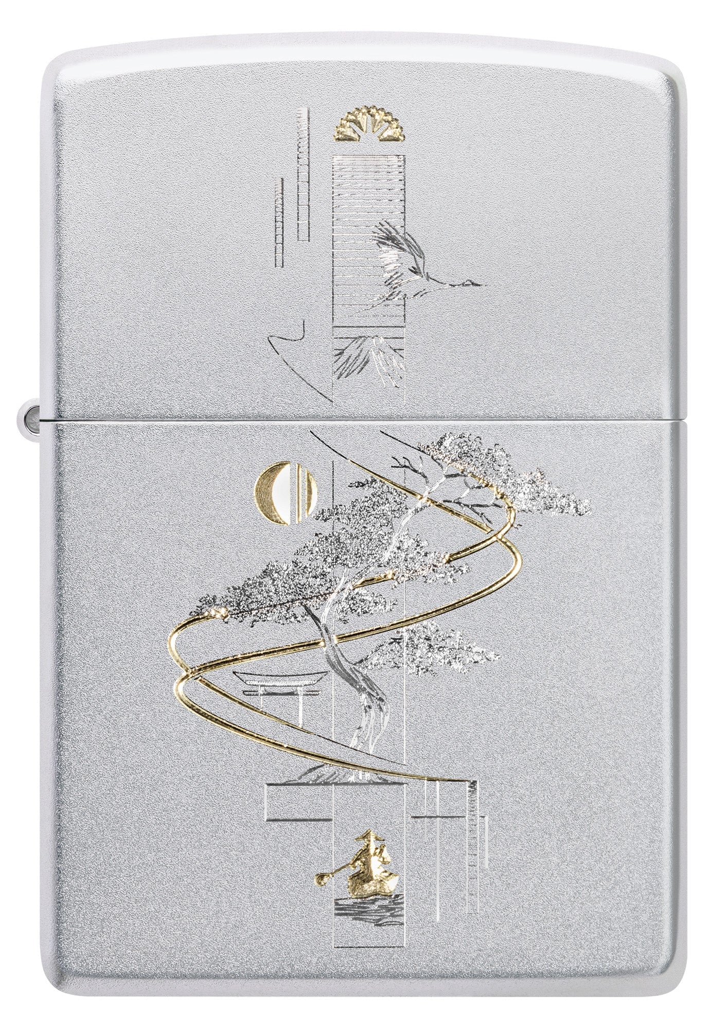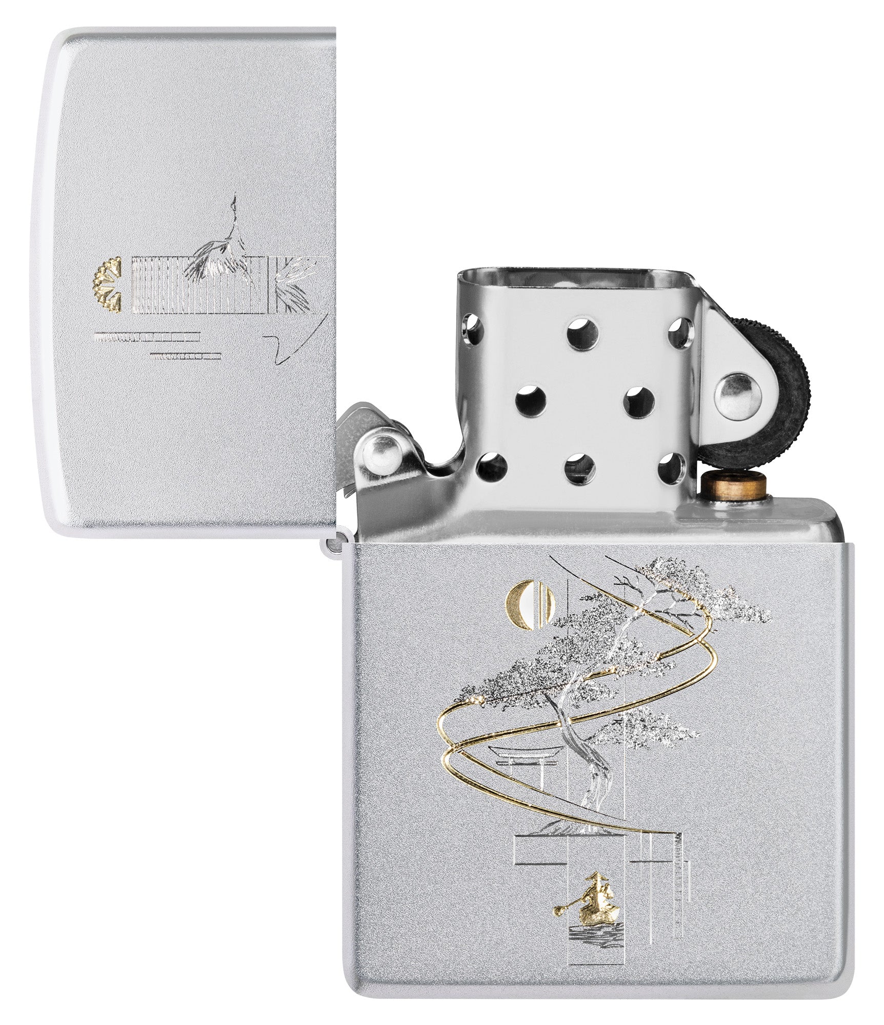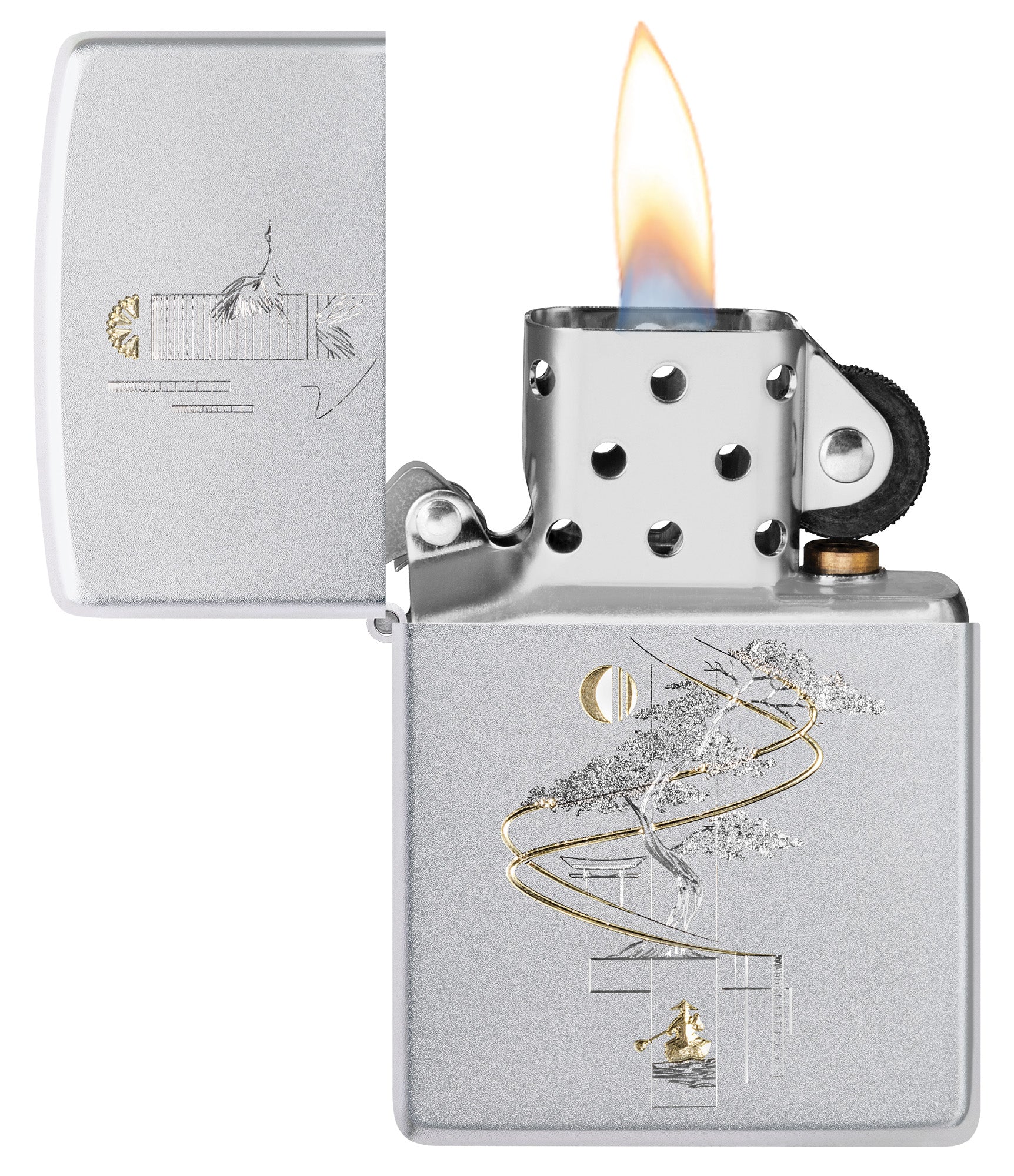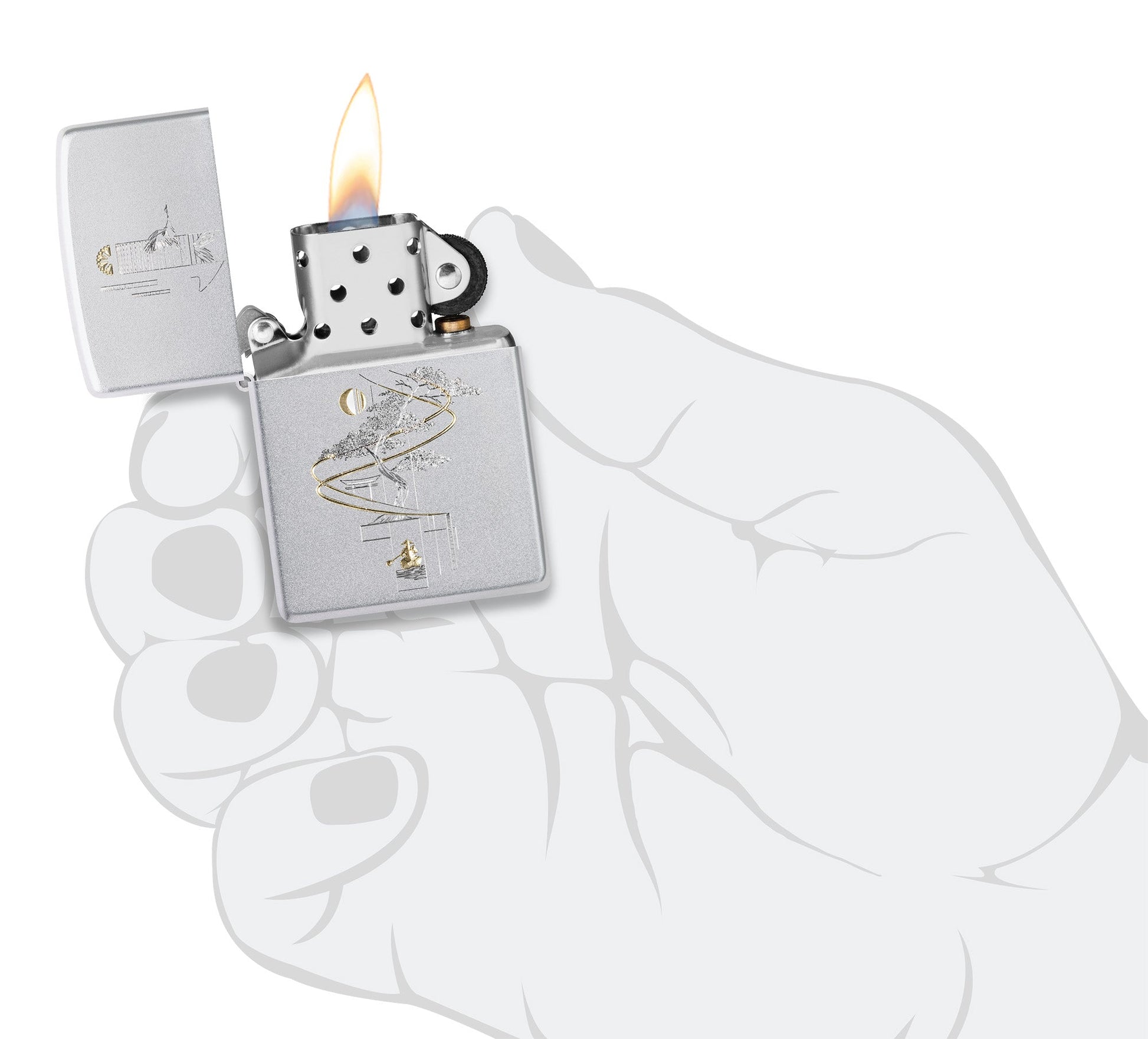 Representando la armonía entre el arte y la naturaleza, un delicado bonsái está representado en este encendedor clásico de cromo satinado en un diseño relajante Auto Two-Tone.