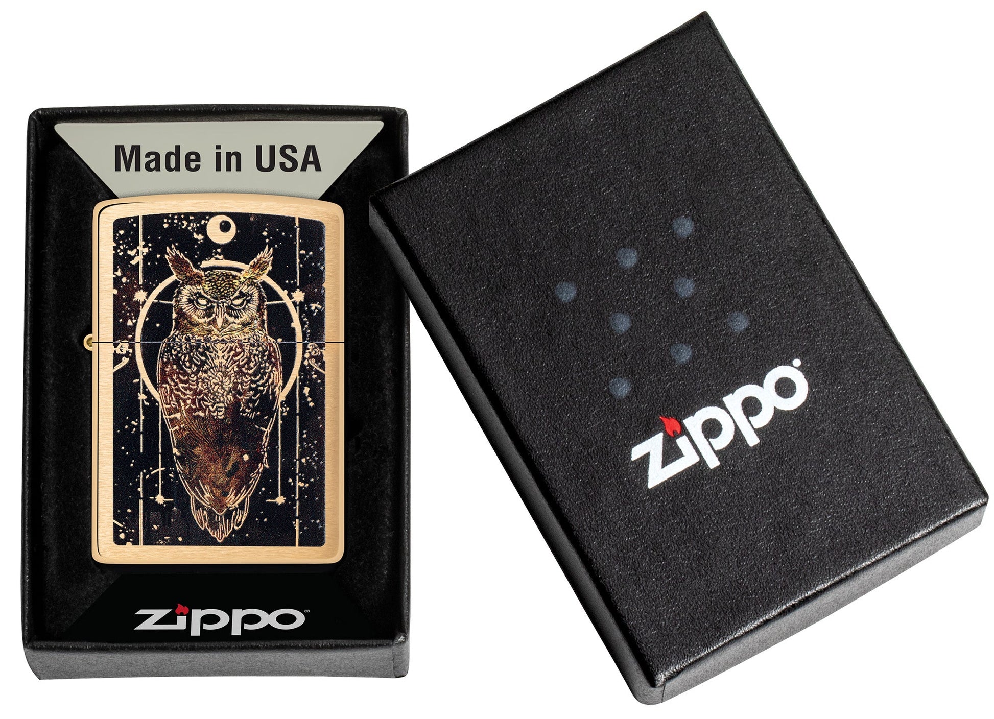 Representando sabiduría, prosperidad y buena fortuna, un intrincado búho se posa sobre la superficie de este encendedor clásico de latón cepillado en un diseño místico a todo color.