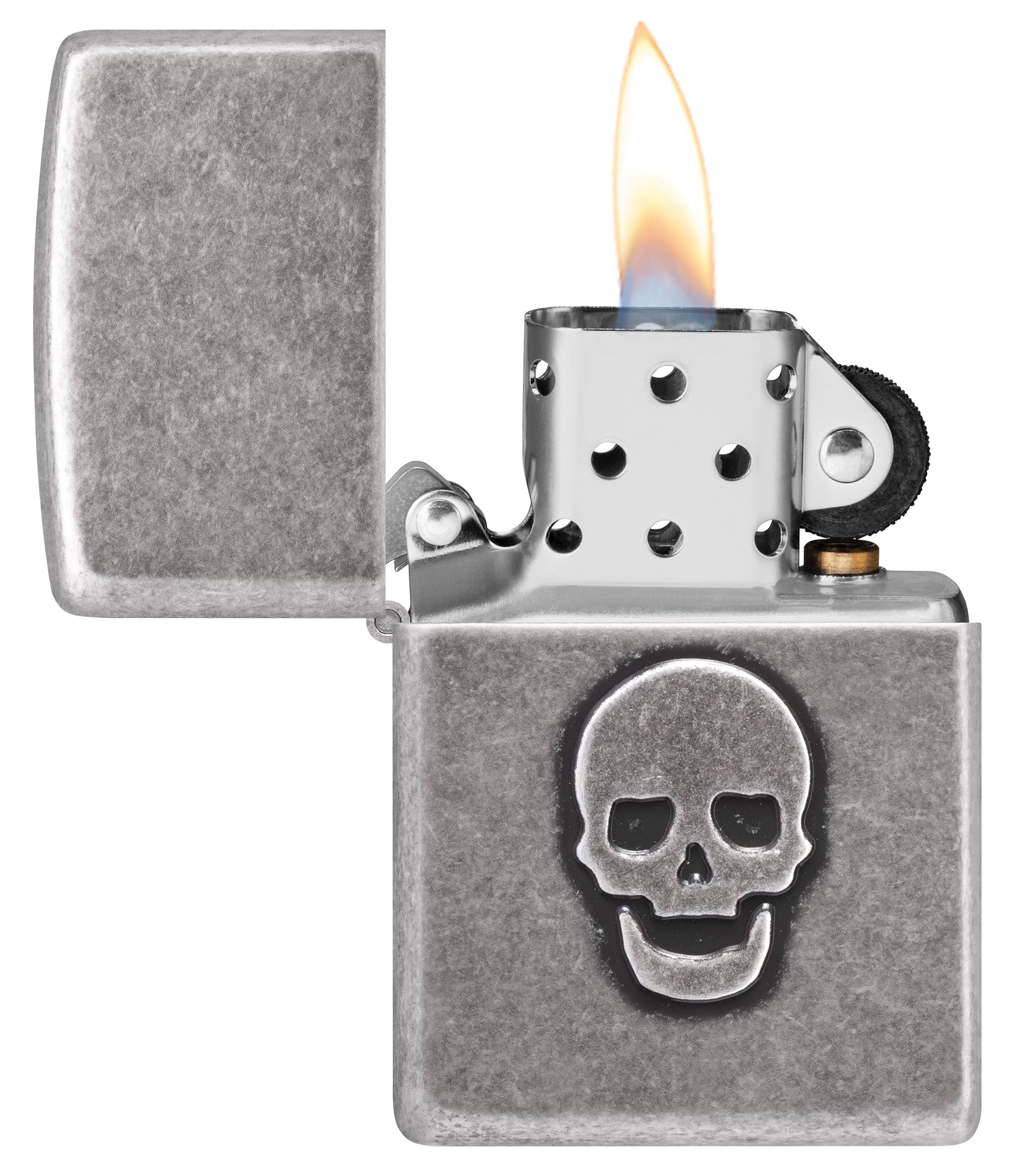 Una calavera sencilla aparece estampada en la superficie de este encendedor clásico de plata antigua, añadiendo una sutil textura y profundidad al elegante acabado.