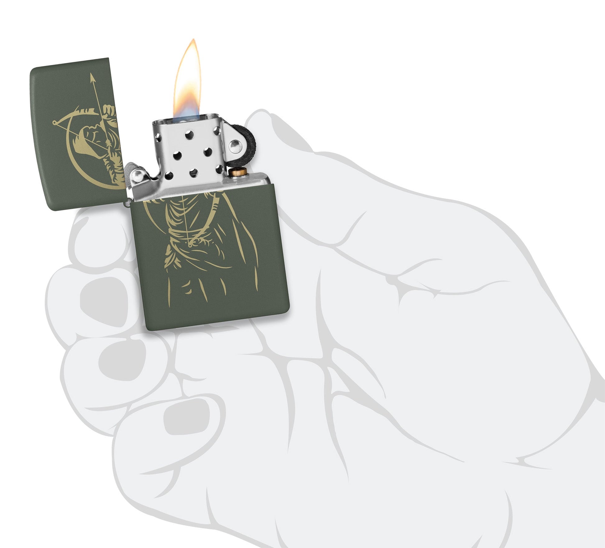 Set your sight on this classic Green Matte lighter. A hooded archer is depicted with a bow and arrow in a crisp Laser Engrave design, which reveals the brass tones of the lighter case beneath the sleek matte finish.