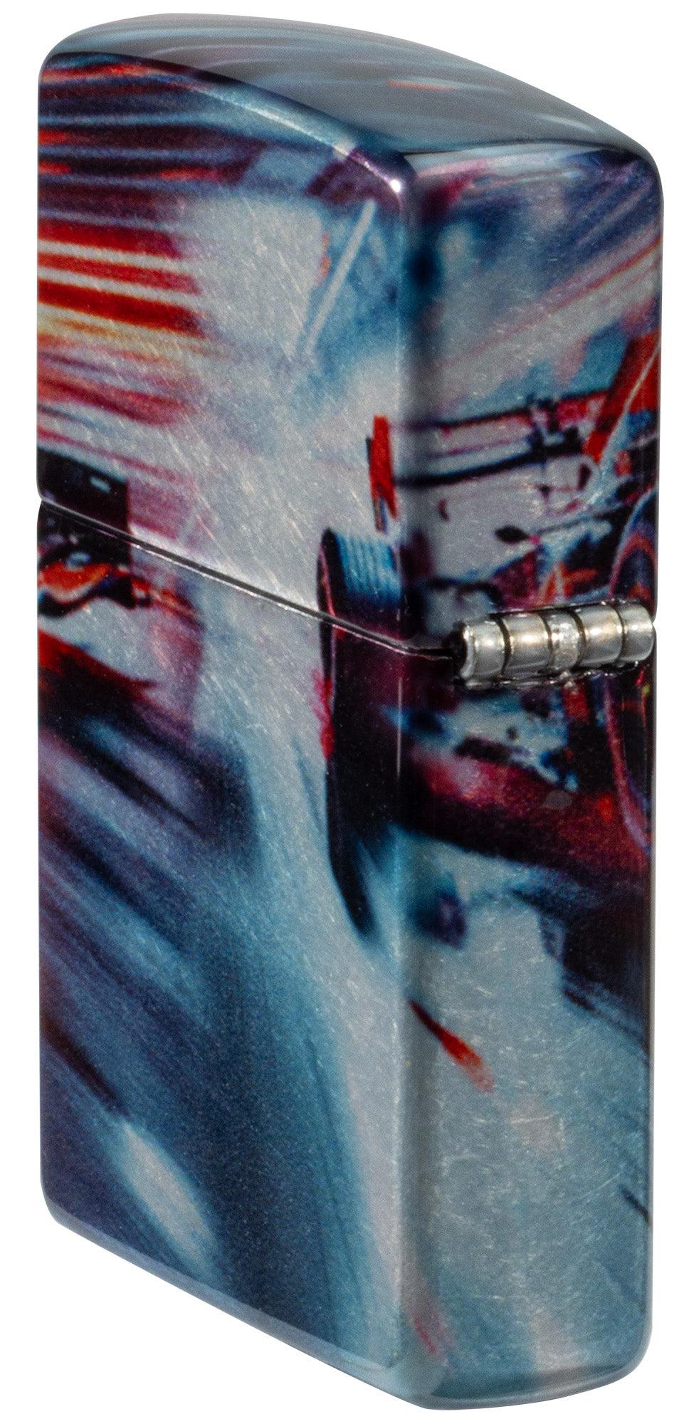 Un coche de carreras a toda velocidad cruza la superficie de este clásico encendedor Tumbled Chrome en un emocionante diseño 540 Fusion, que se extiende de manera continua por todos los lados e incorpora los tonos metálicos de la carcasa.
