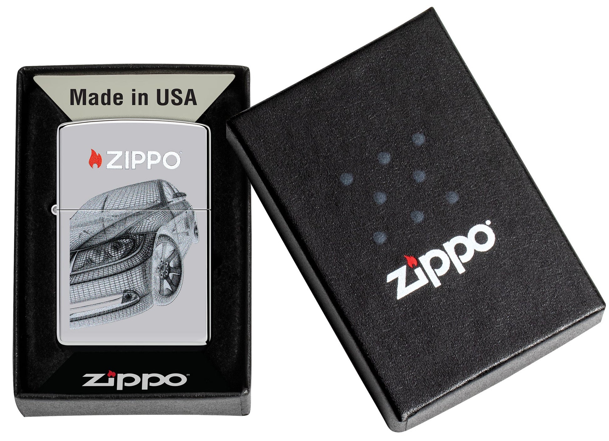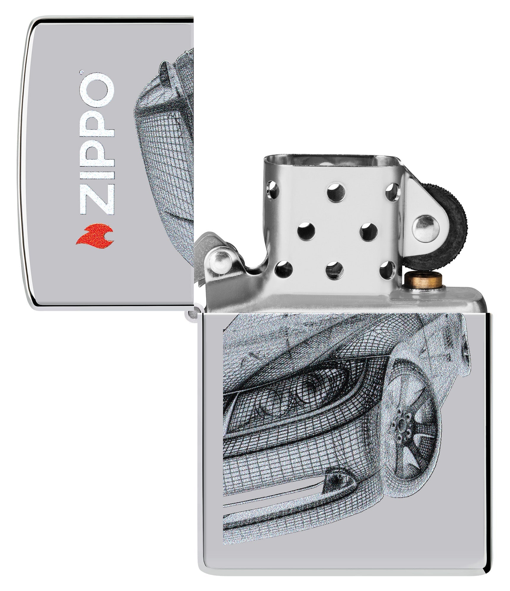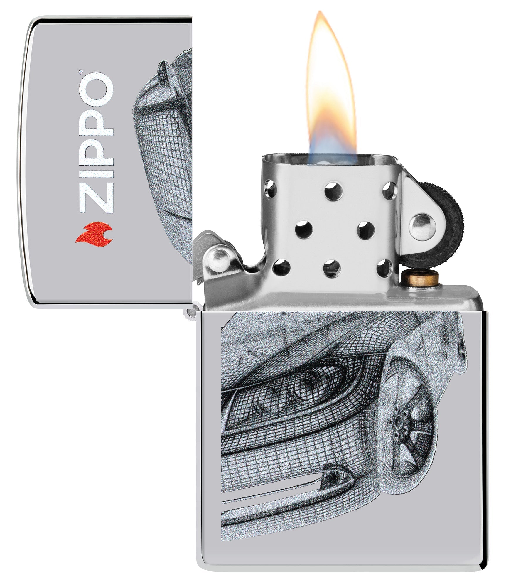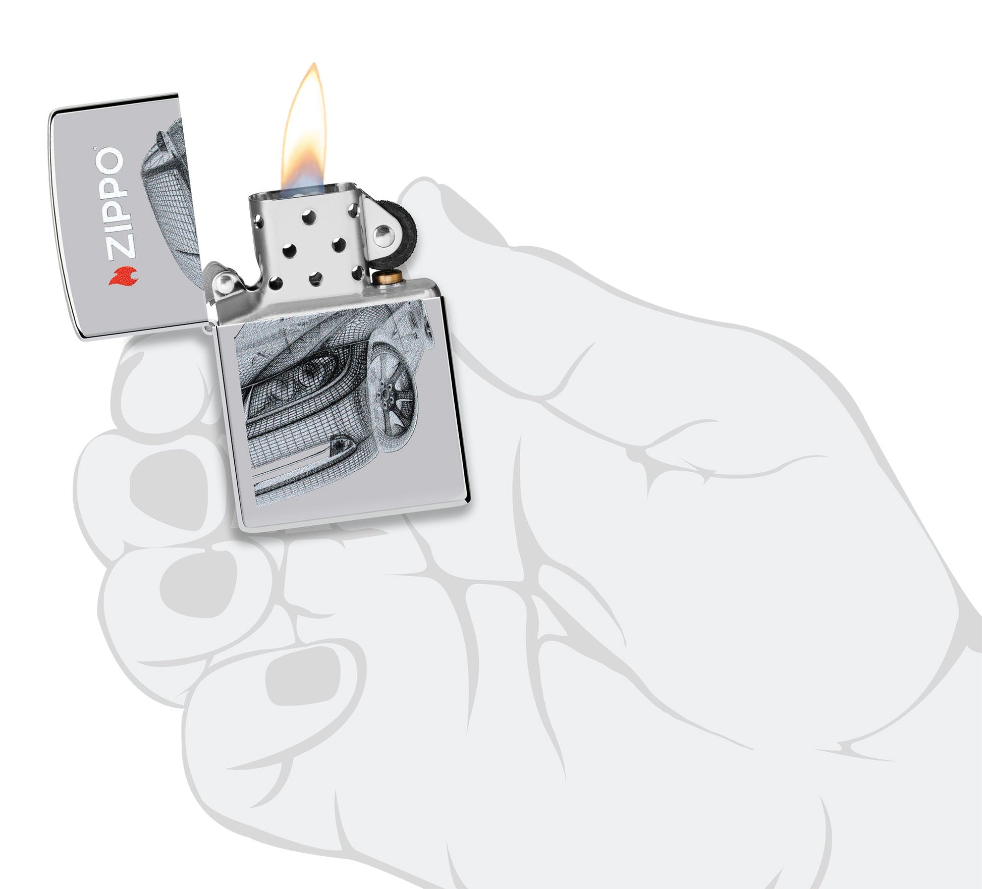 Representado en un estilo moderno y digitalizado, un coche deportivo avanza hacia el primer plano de este encendedor clásico en cromo de alto brillo en un diseño futurista a todo color.