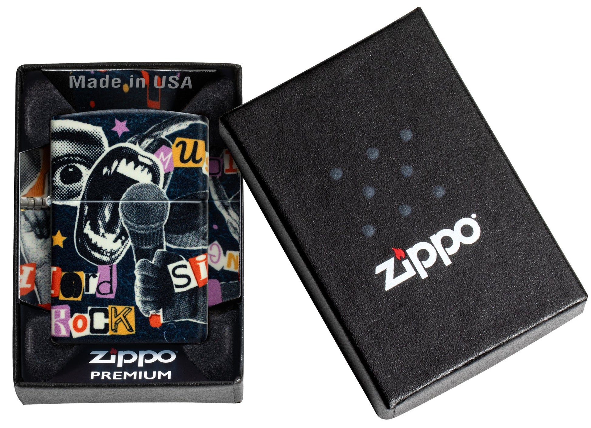 Abrace su amor por la música con este encendedor 540 Color. El diseño continuo muestra un collage abstracto de géneros musicales y símbolos del rock and roll con un toque retro.