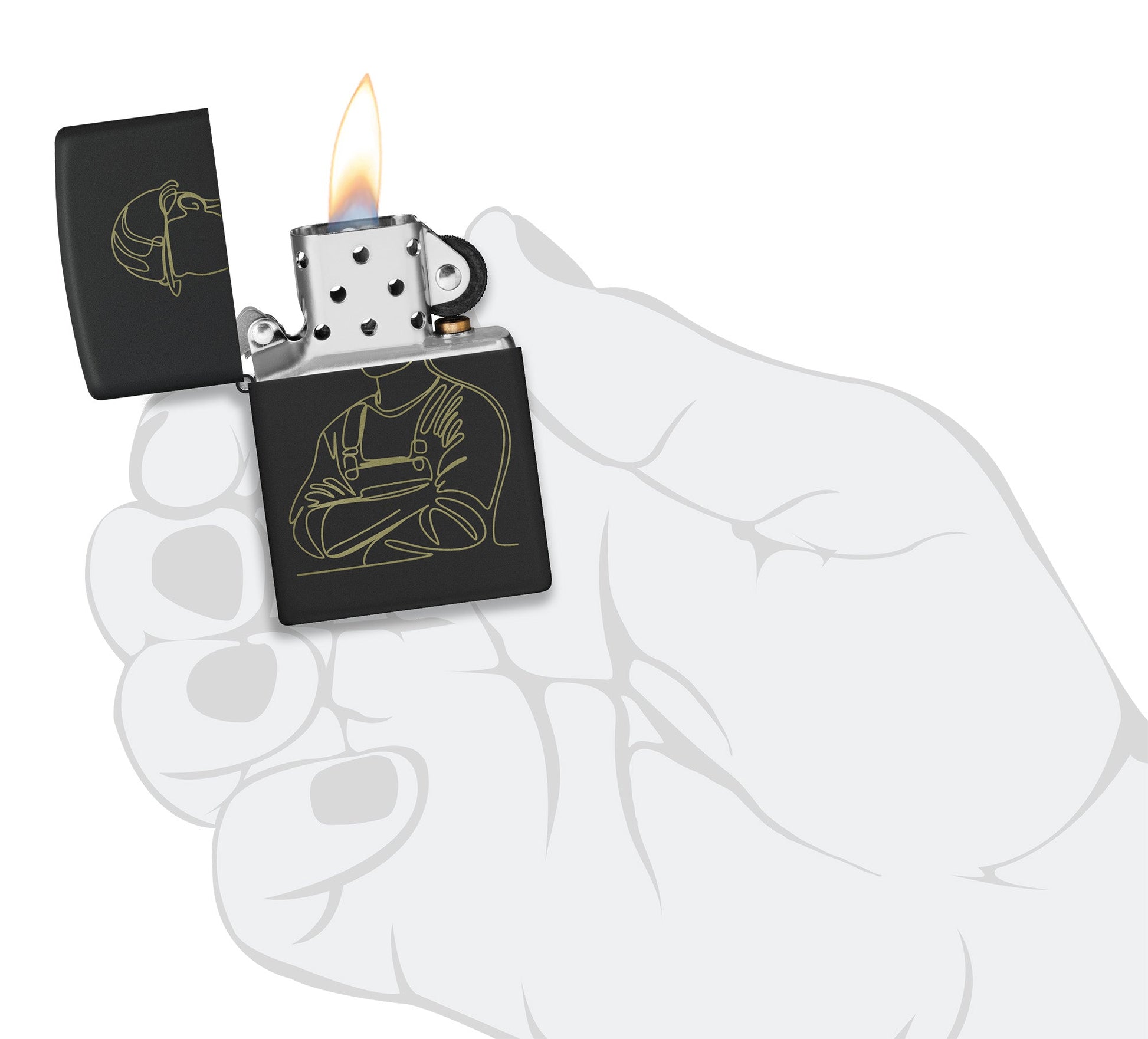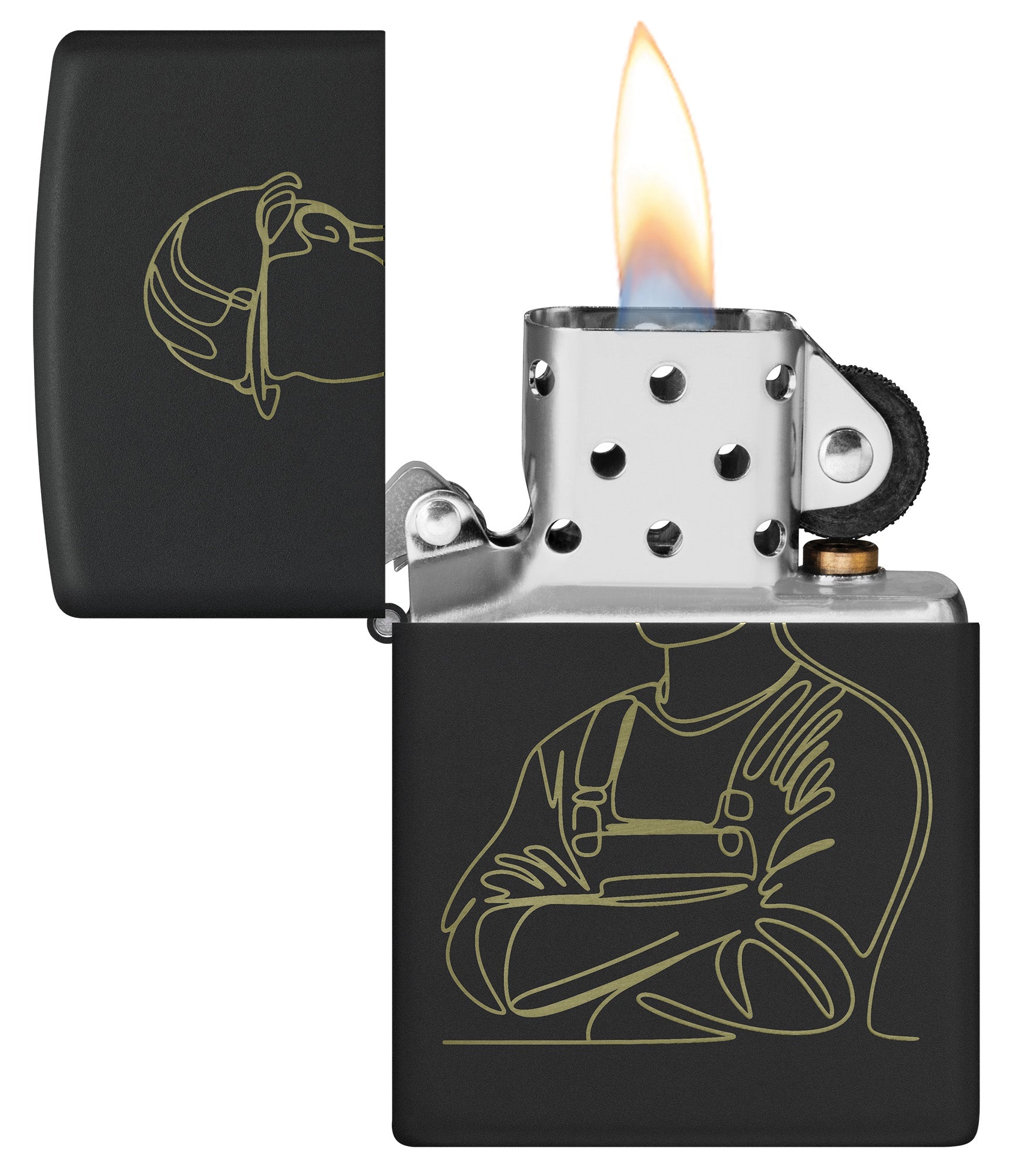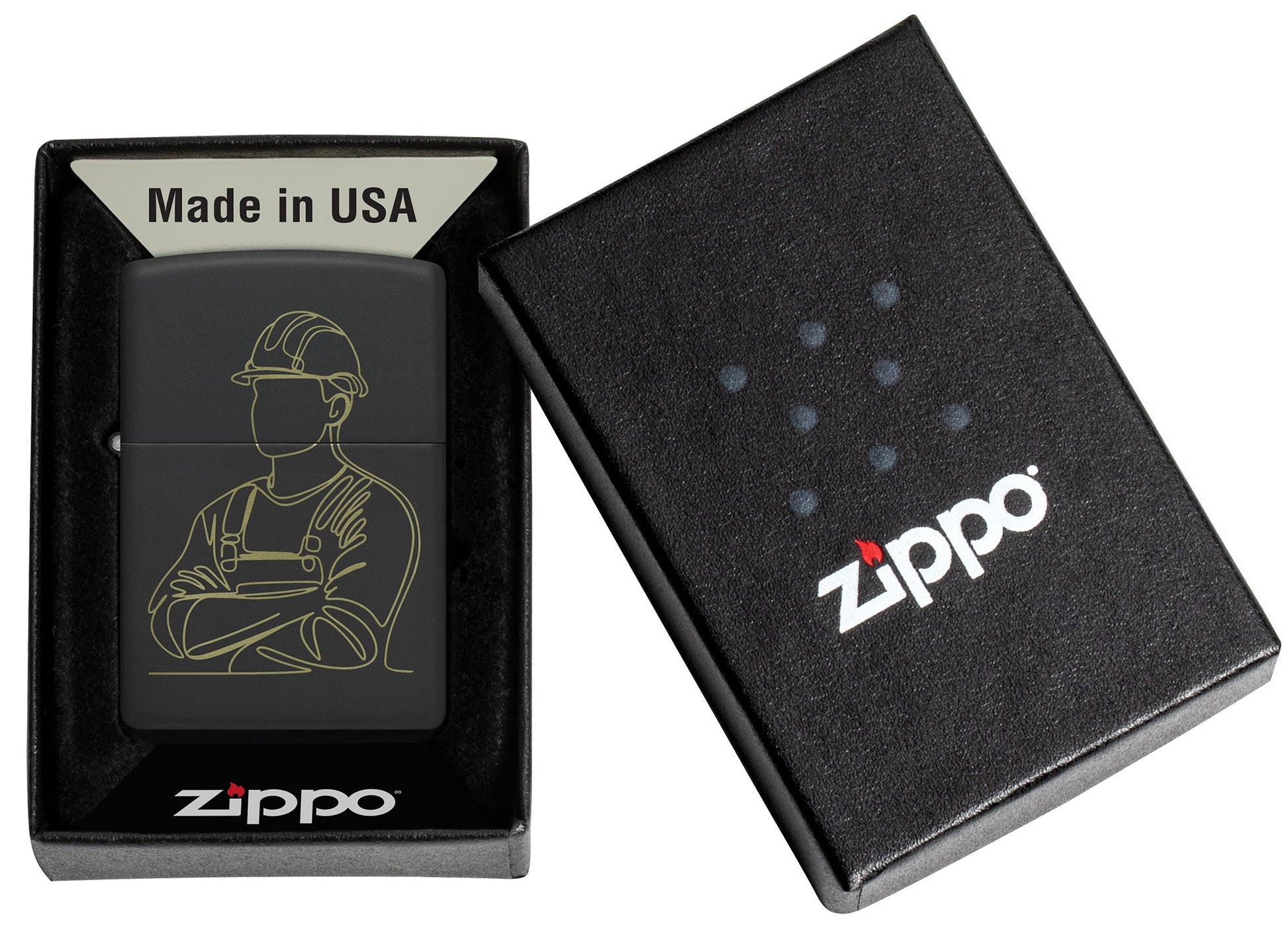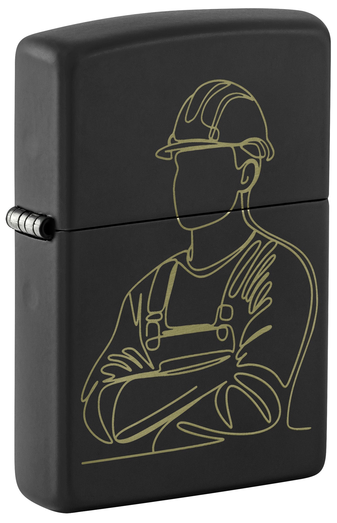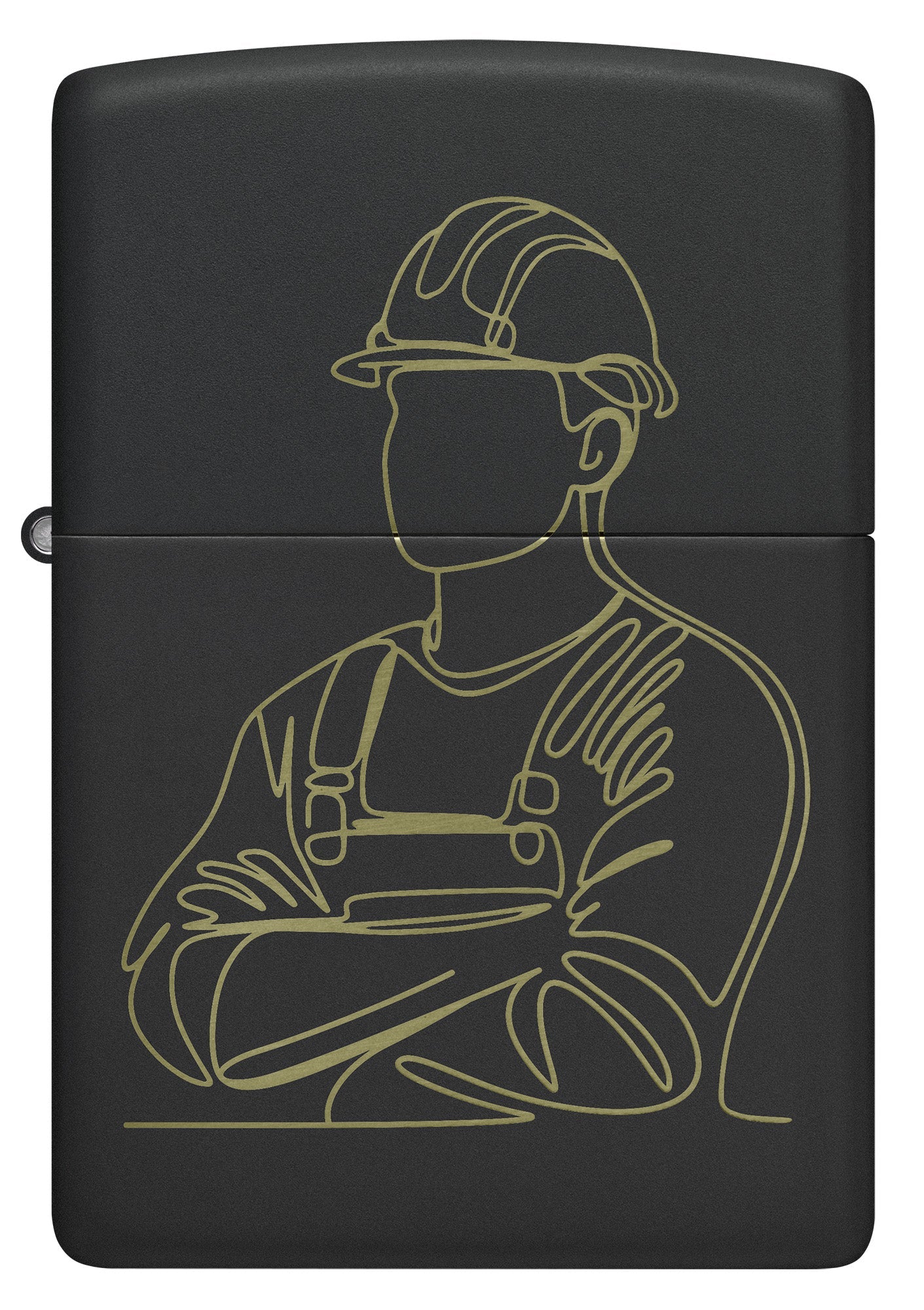 Perfecto para cualquier profesional del oficio, este clásico encendedor Black Matte rinde homenaje a su labor con un diseño minimalista Laser Engrave que representa a un trabajador con casco de seguridad.