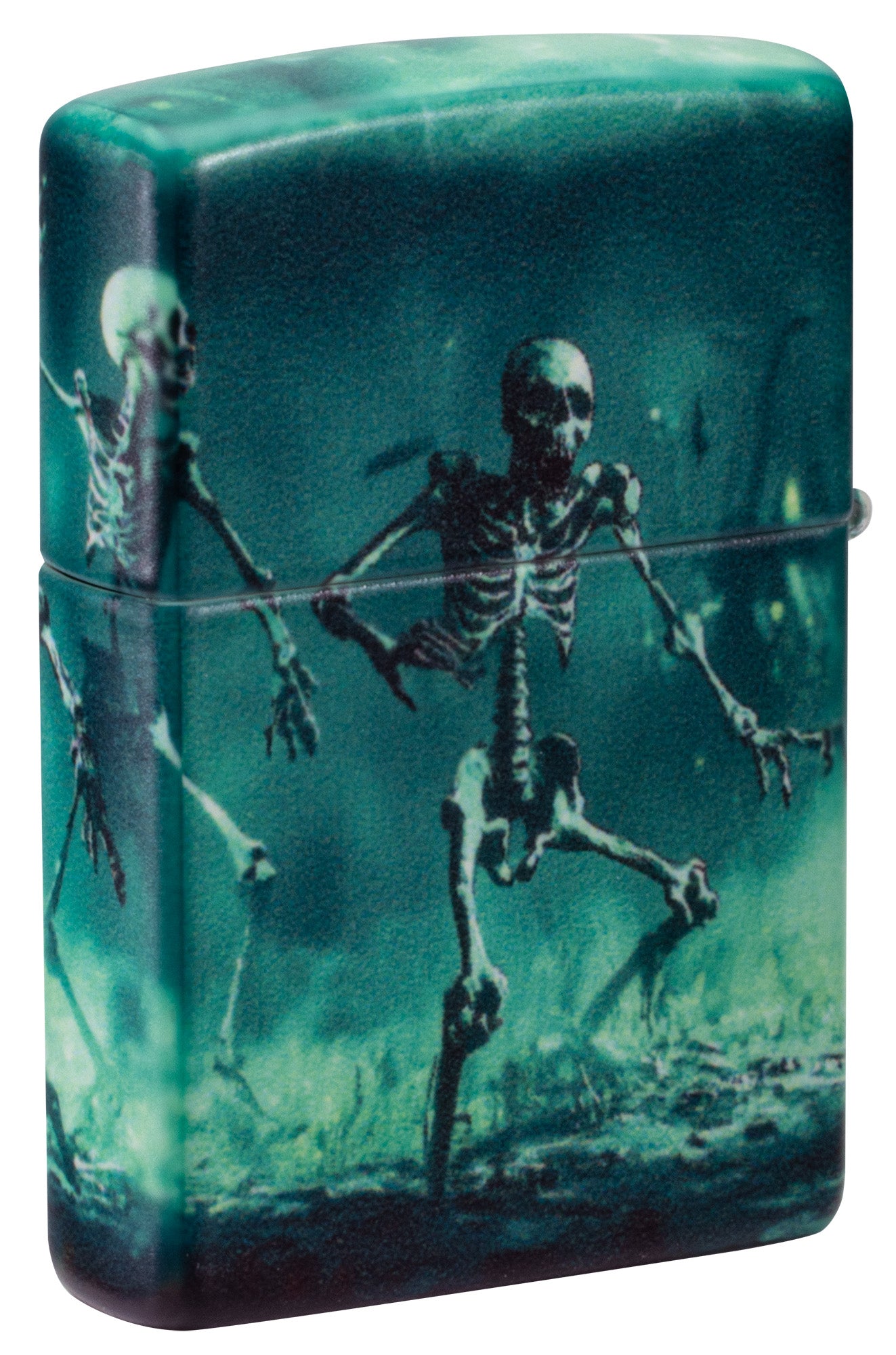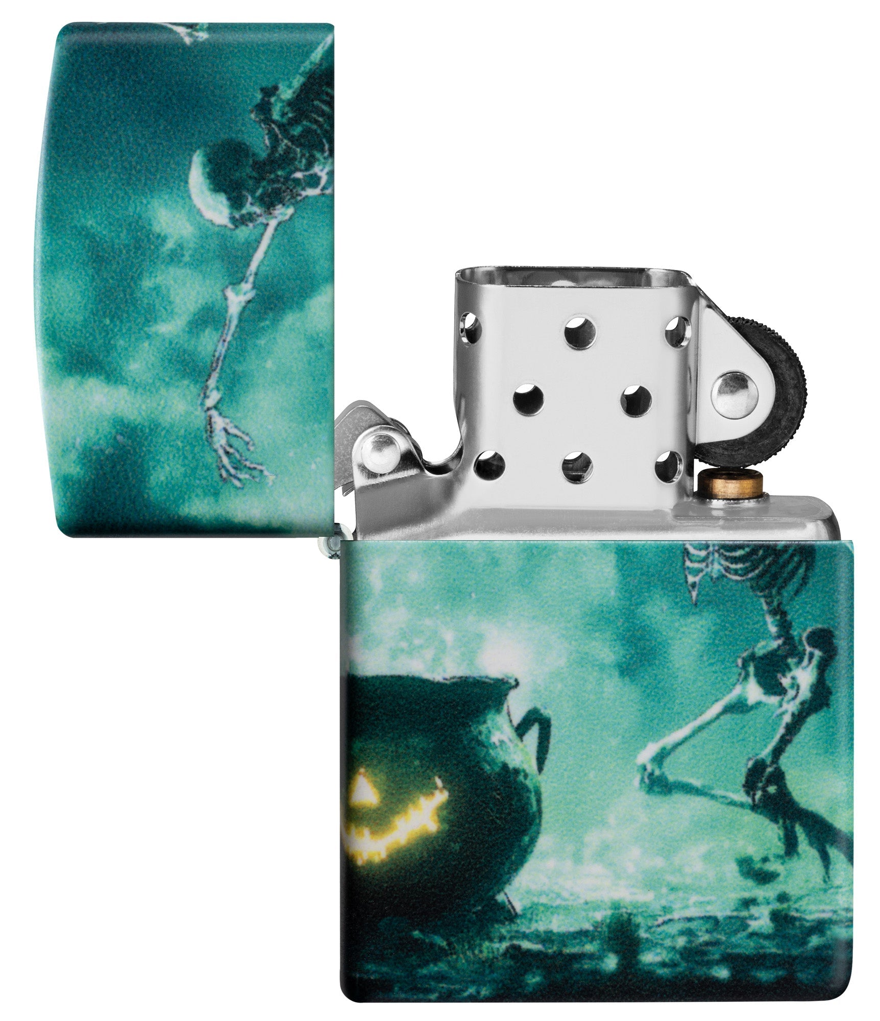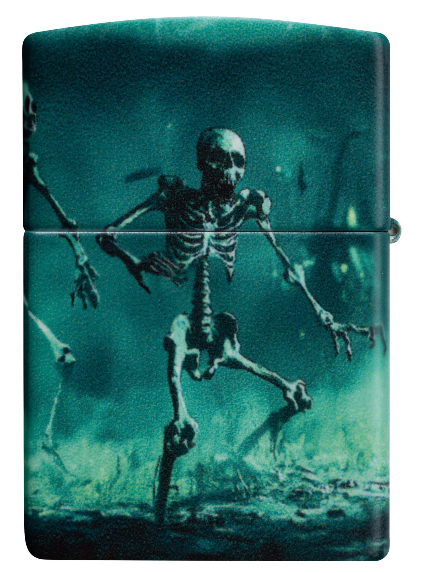 Un grupo de esqueletos baila alrededor de un caldero burbujeante en este encendedor clásico 540° Color con un diseño espeluznante, tratado con nuestro acabado especial Glow-in-the-Dark para darle un toque extra de magia.