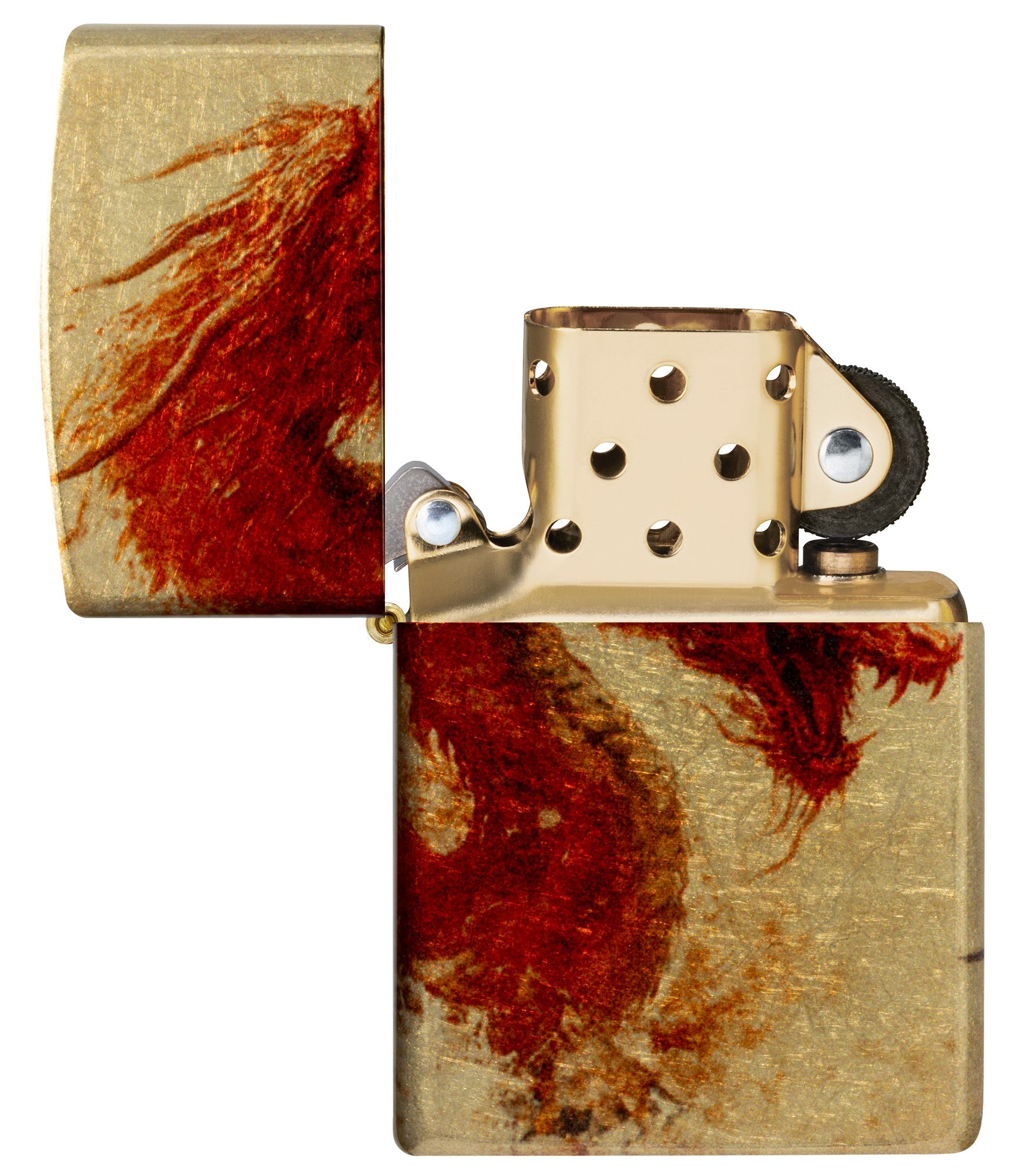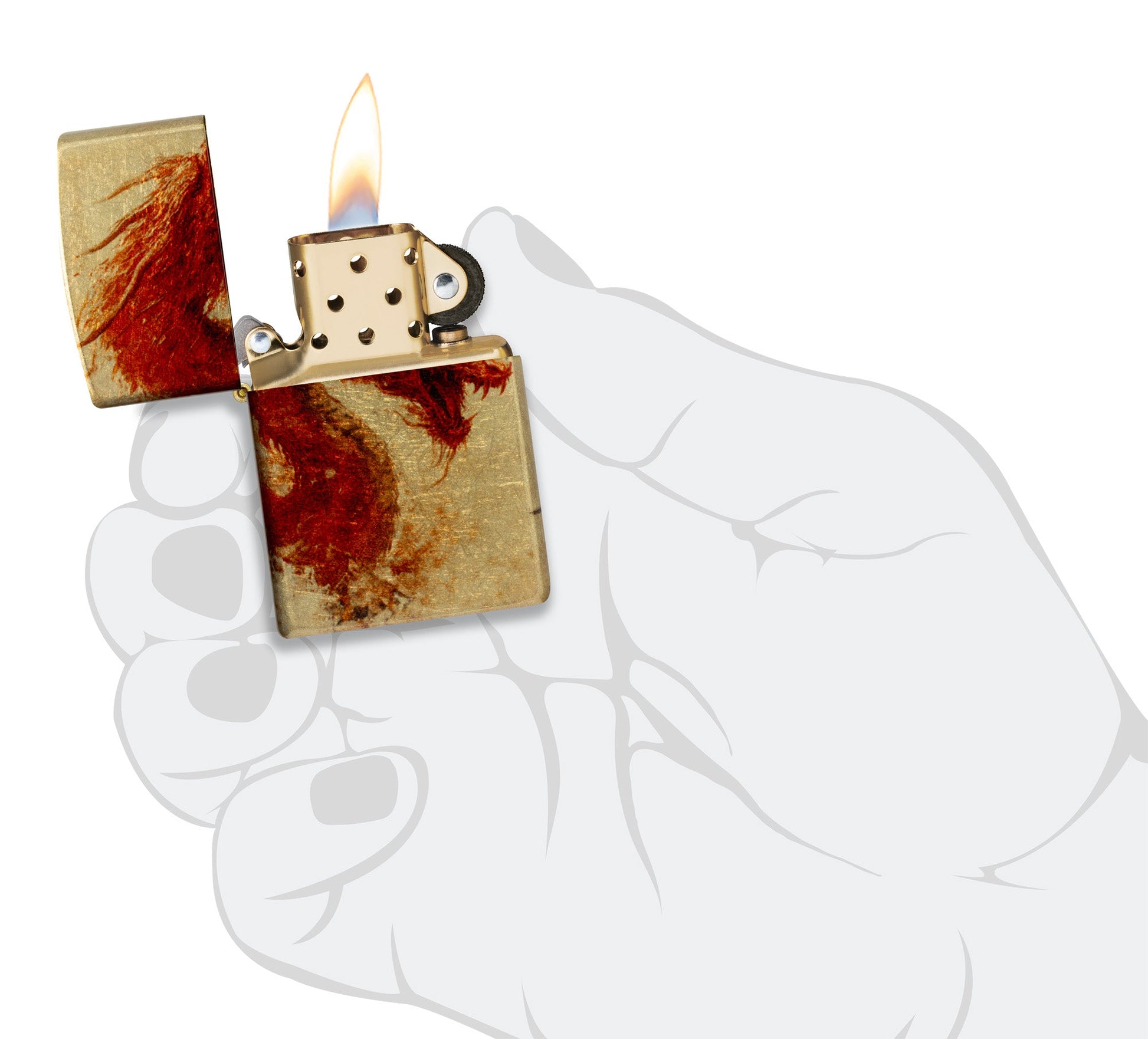 Aproveche el poder del poderoso dragón con este clásico encendedor Tumbled Brass. El hipnotizante diseño 540 Fusion muestra un dragón ardiente y detallado que se transforma en un valiente samurái al otro lado de la pieza.
