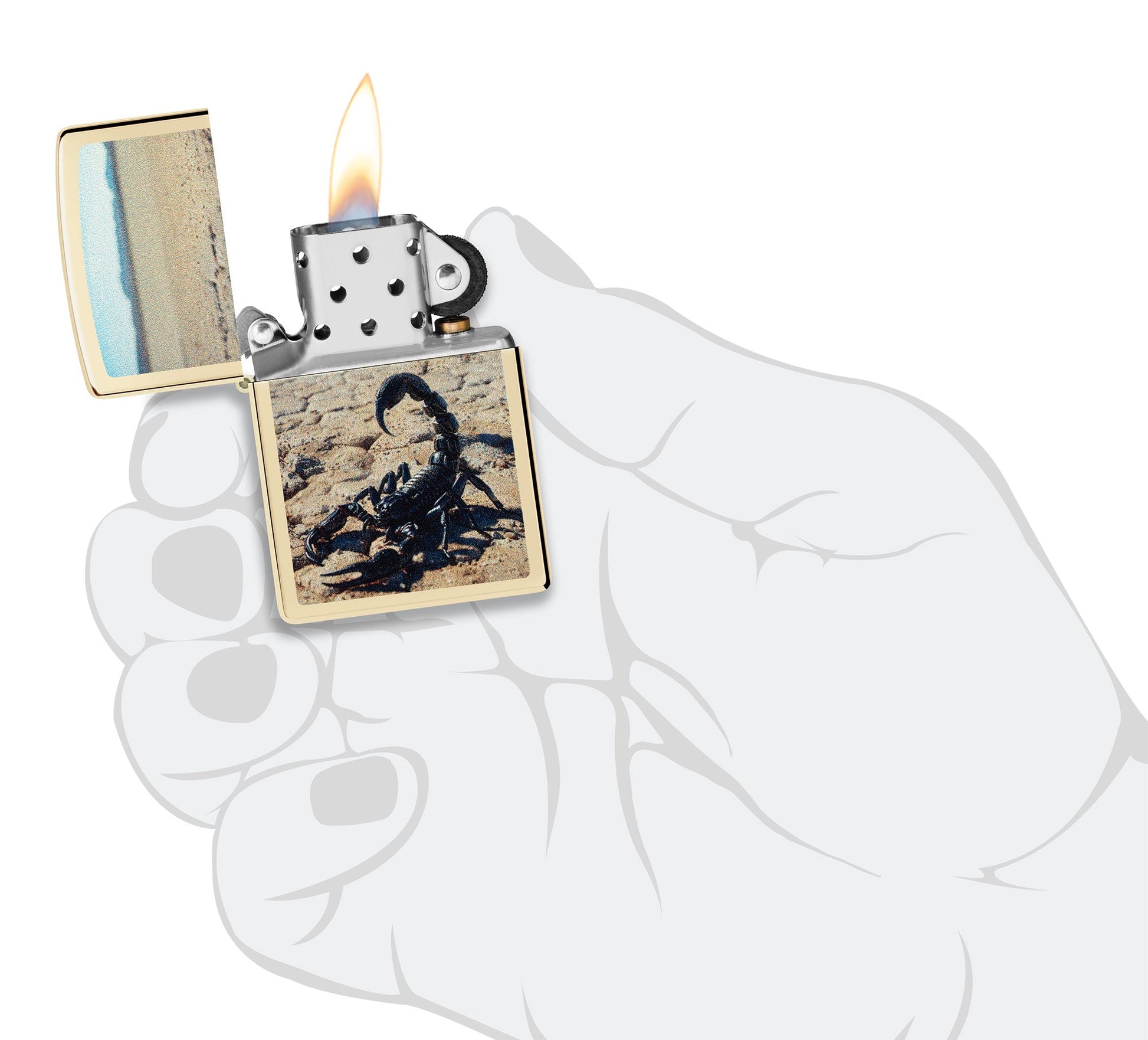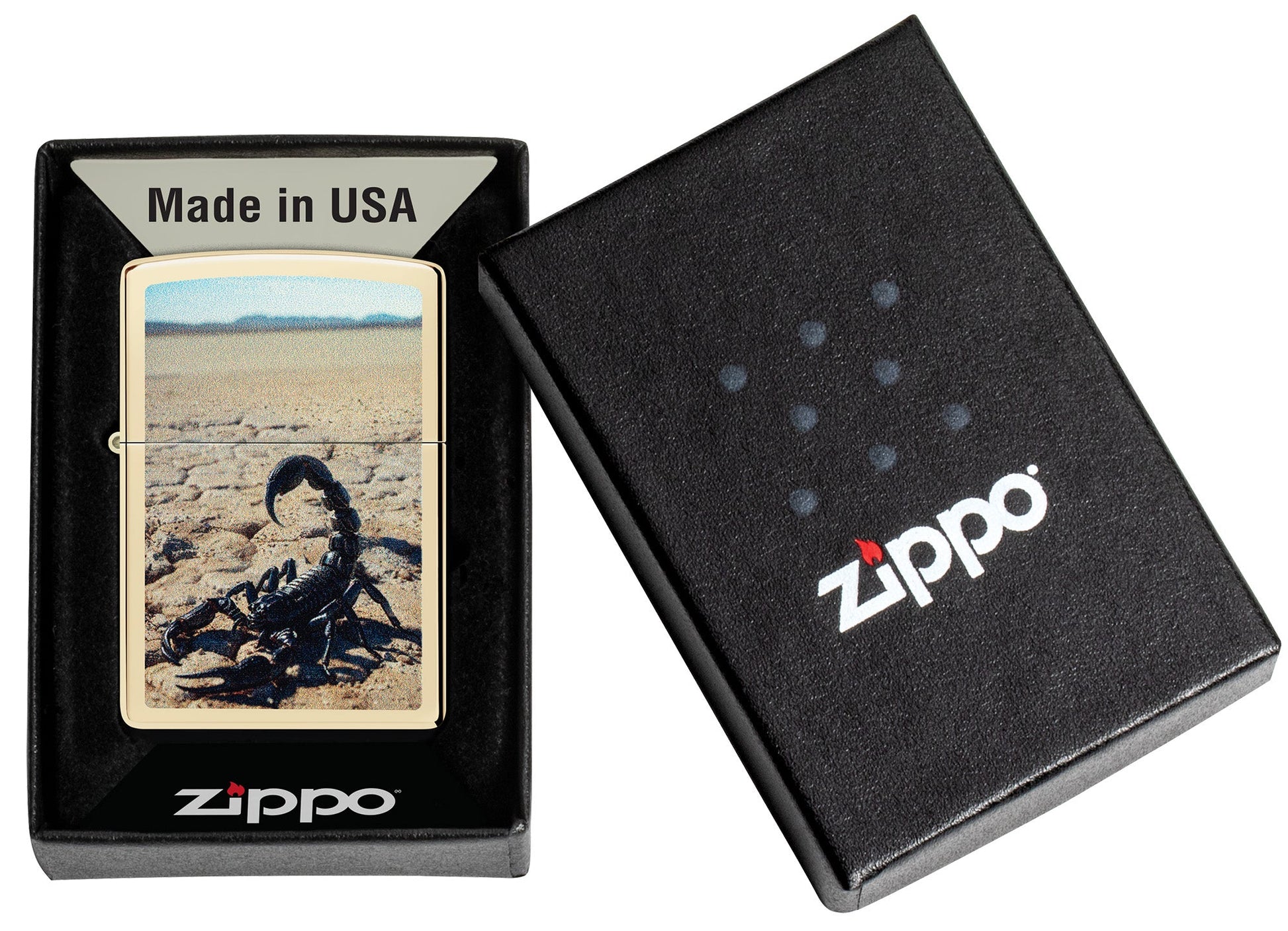 De pie sobre un paisaje desértico árido, un escorpión desafiante parece listo para atacar desde este clásico encendedor Champagne mediante un intenso diseño Color Image.