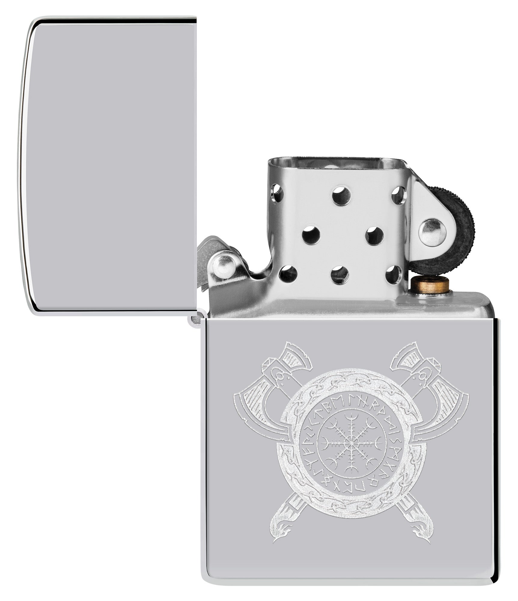 Flanqueado por un par de hachas, un intrincado escudo vikingo aparece en la superficie de este encendedor clásico de cromo de alto brillo en un detallado diseño Double Lustre.