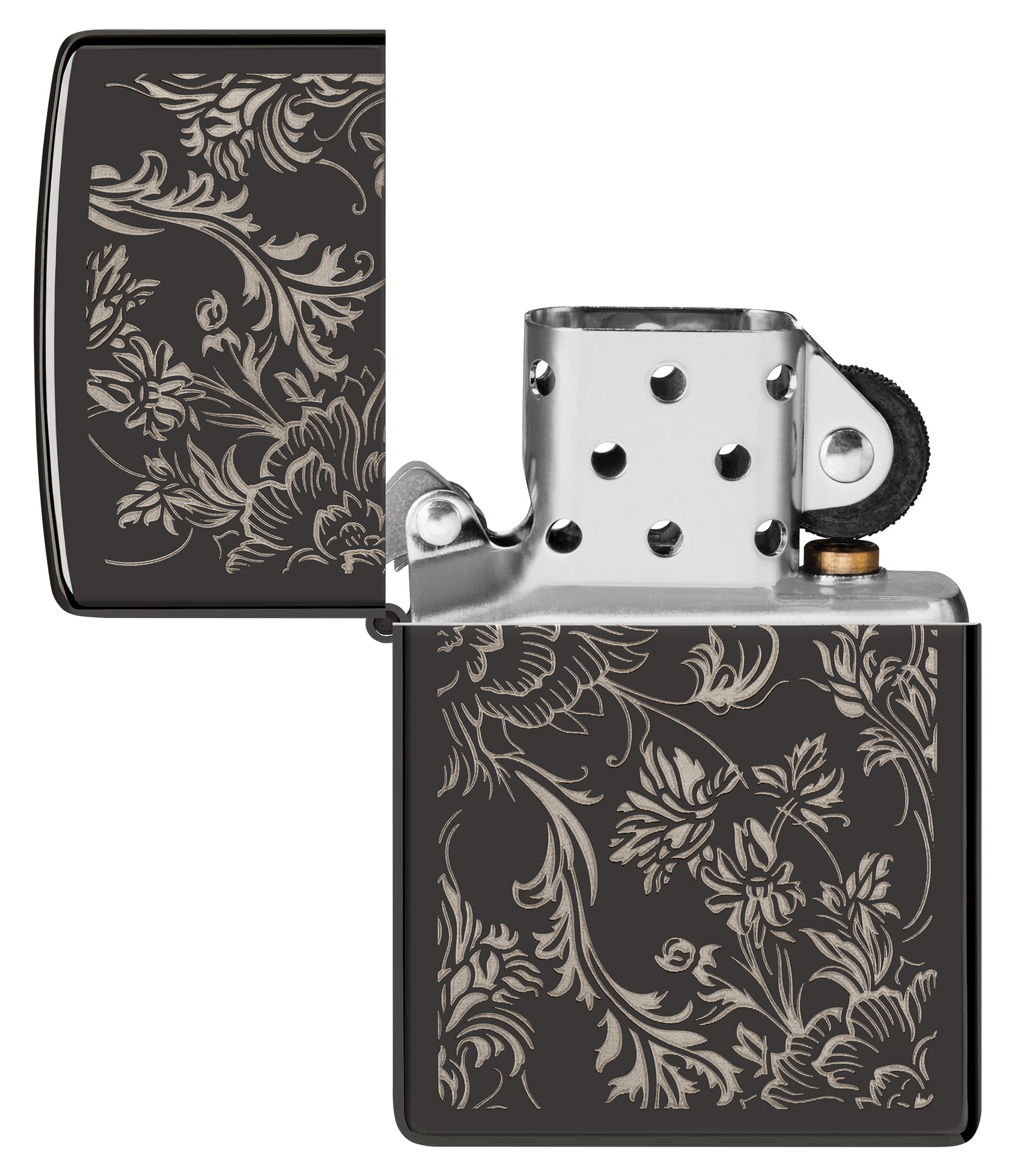 Añada un toque atemporal a su colección con este encendedor clásico en negro de alto brillo. Elegantes motivos florales se arremolinan sobre la superficie de la pieza en un intrincado diseño grabado con láser.