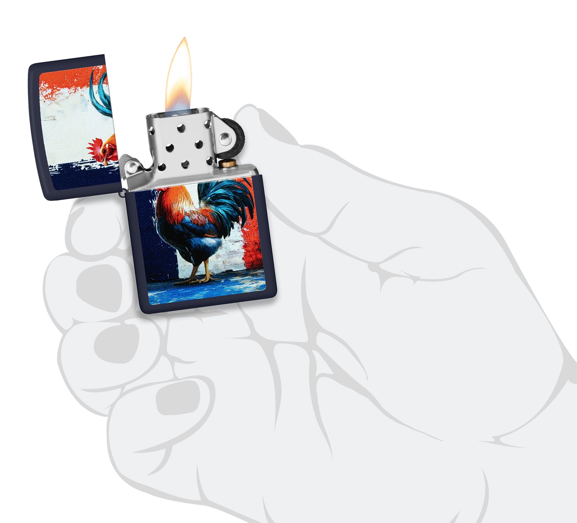 Un colorido gallo avanza con orgullo sobre la superficie de este clásico encendedor Navy Matte, en un vibrante diseño Color Image.