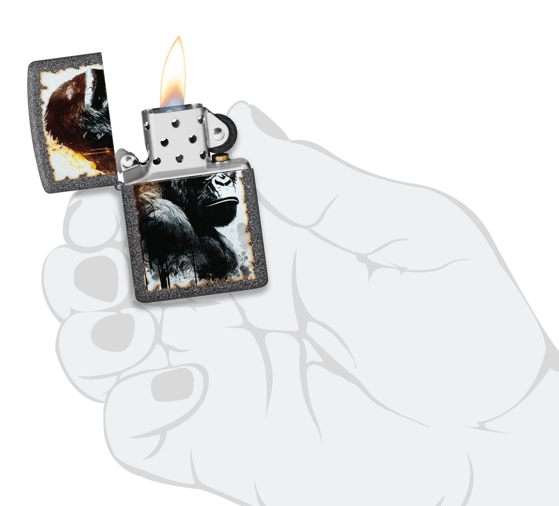 Un imponente gorila frunce el ceño en la superficie de este clásico encendedor Iron Stone en un potente diseño Color Image.