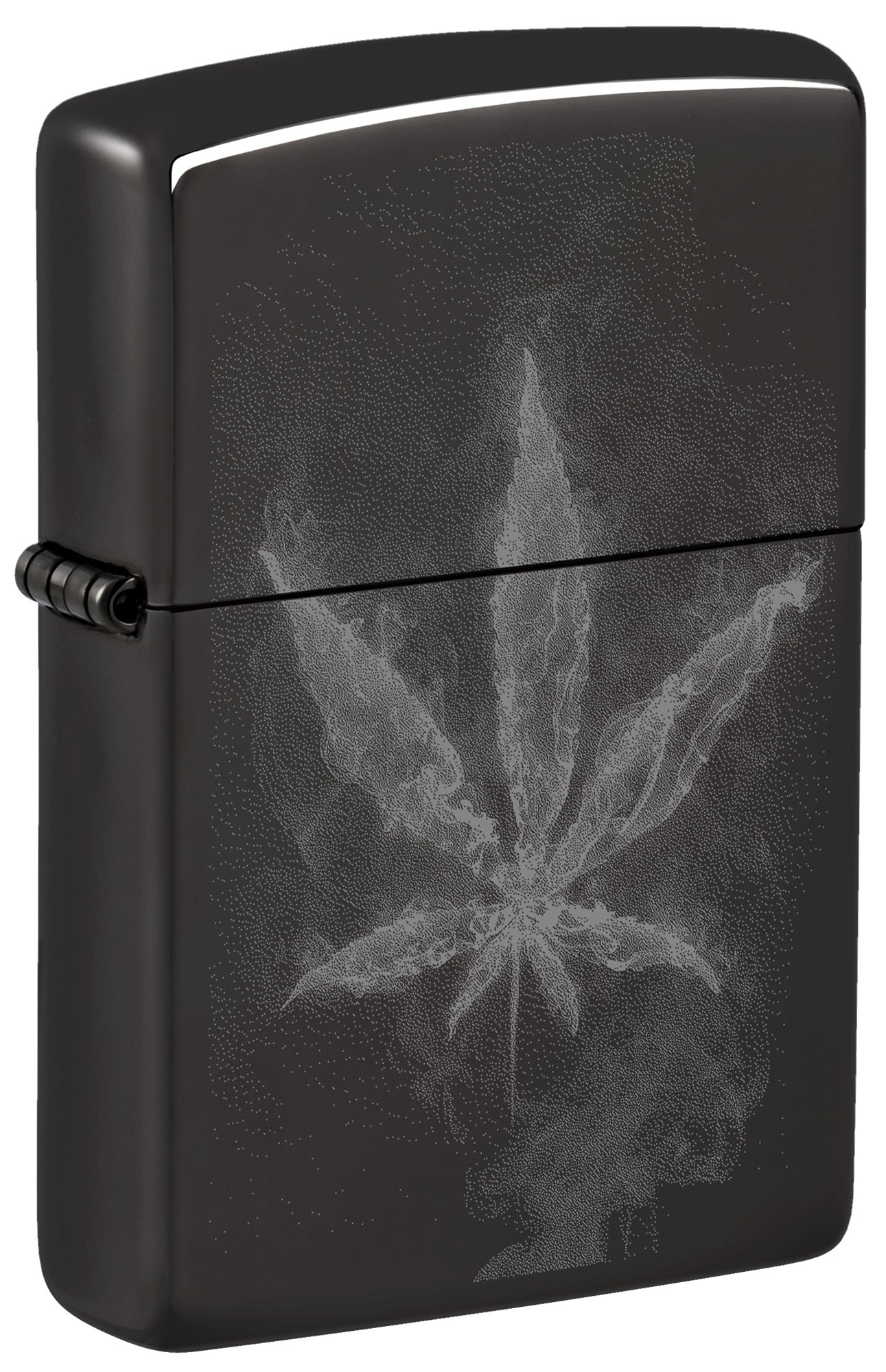 Una delicada hoja de cannabis se despliega en este encendedor clásico en negro de alto brillo con un diseño ahumado y sutil en Photo Image.
