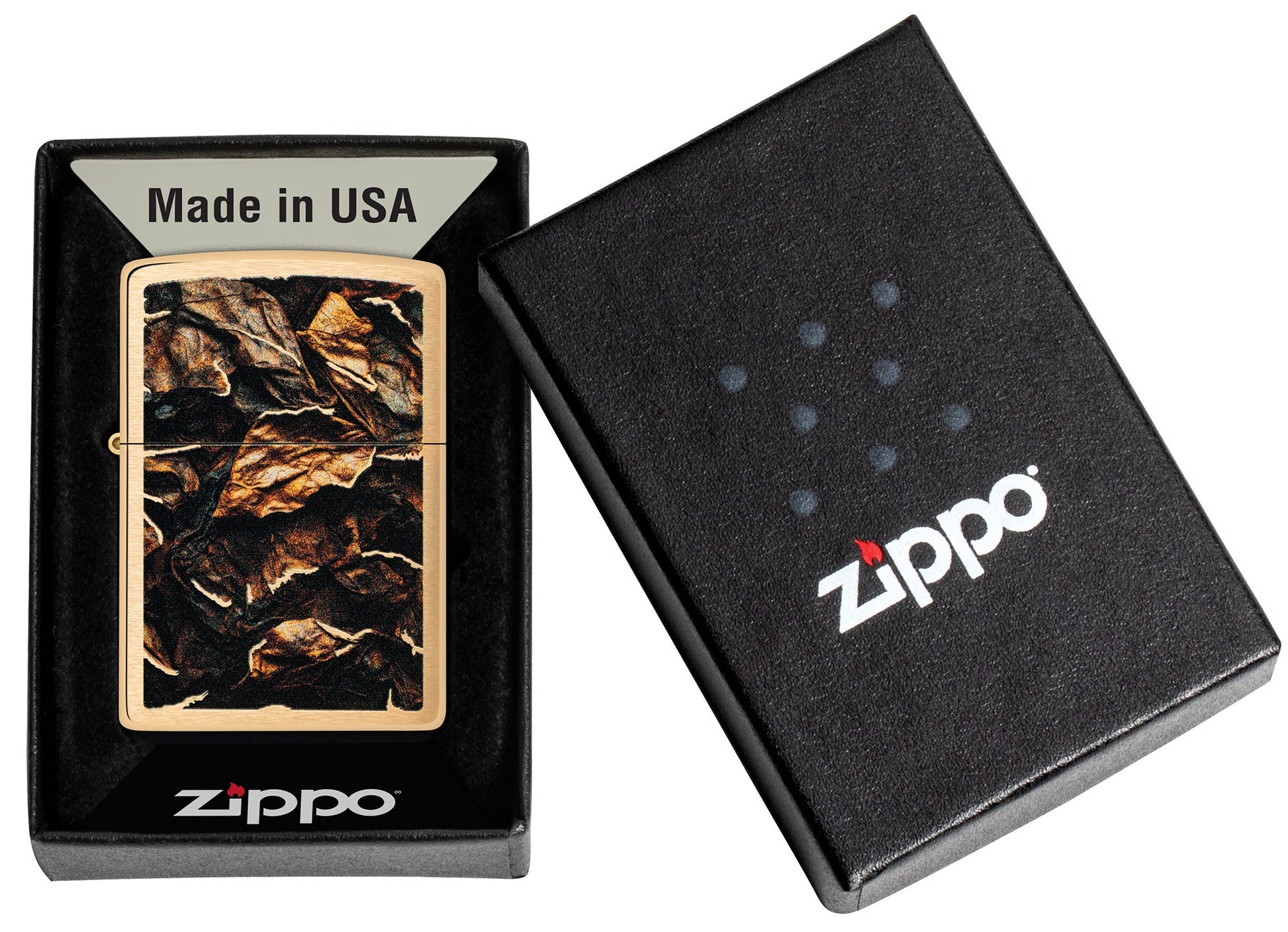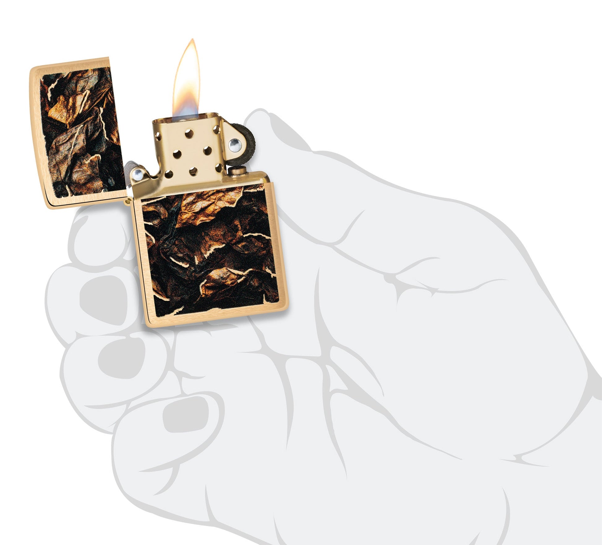 Este clásico encendedor Brushed Brass muestra una cosecha de hojas curadas en un relajante diseño Color Image.