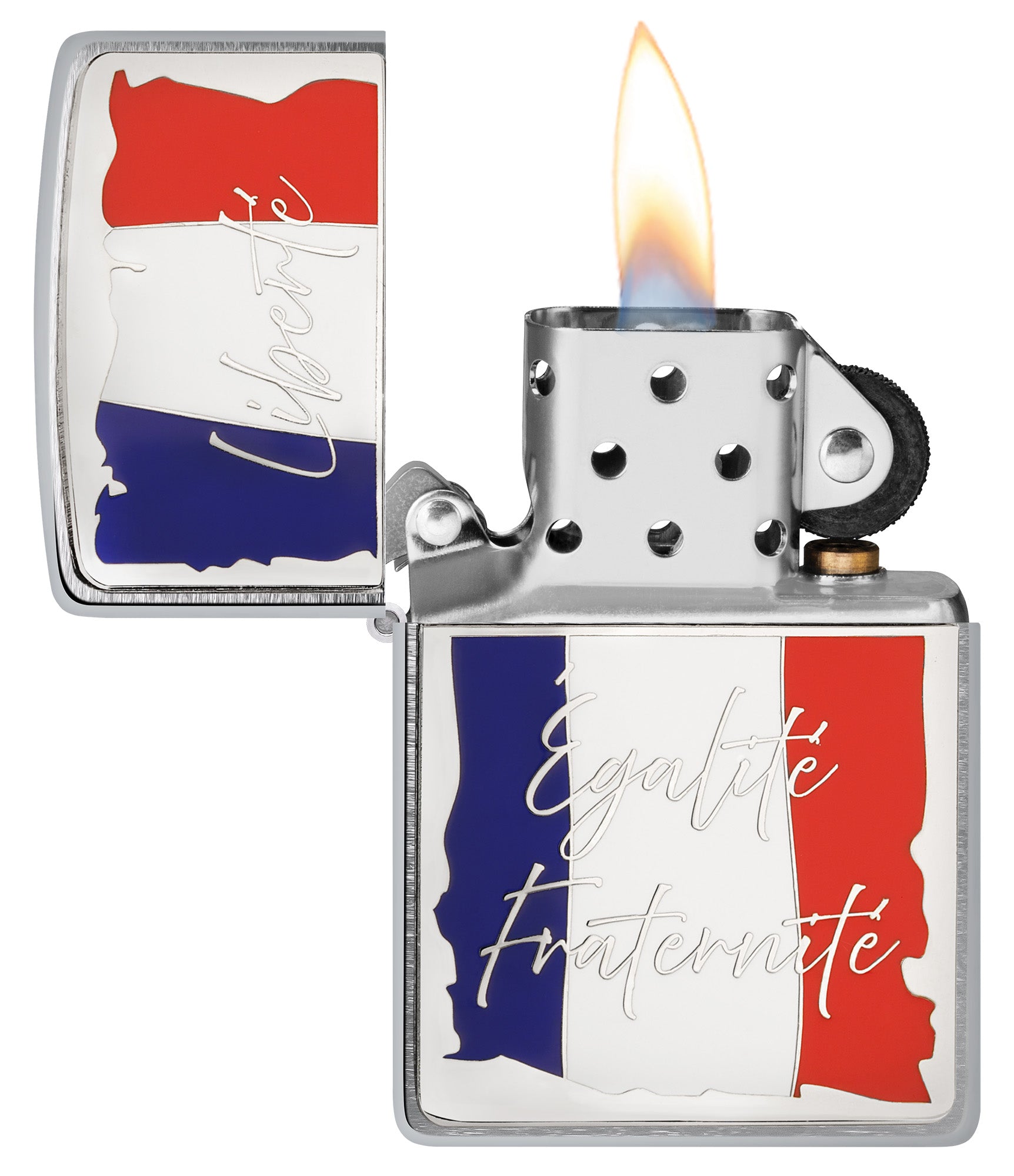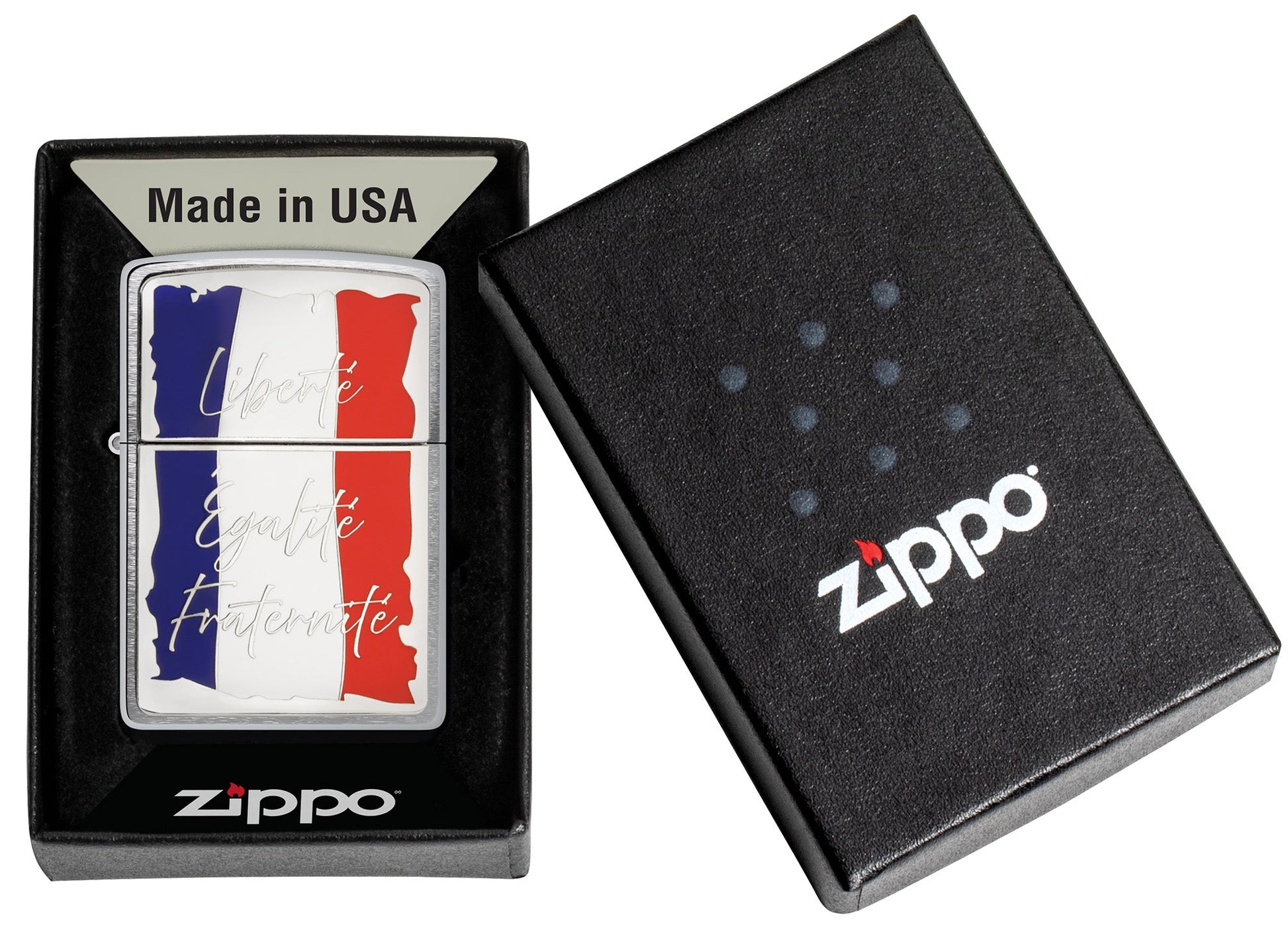 Abrace el espíritu francés con este encendedor clásico de cromo satinado. El emblema metálico adherido muestra la bandera francesa detrás del lema nacional: «Liberté, Egalité, Fraternité» que se traduce como Libertad, Igualdad y Fraternidad.
