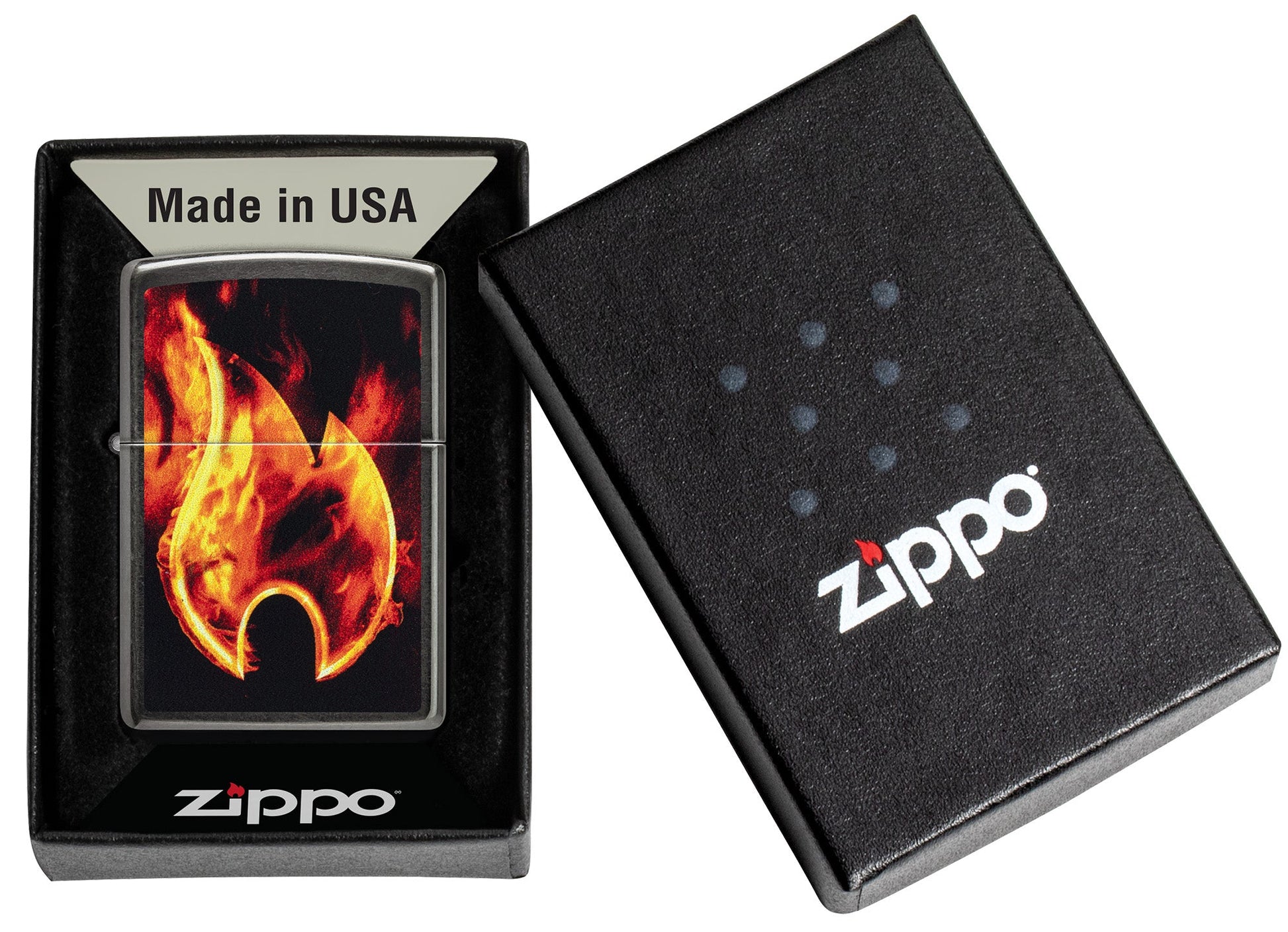 Añada una chispa ardiente a su colección con este encendedor clásico gris. El icono de la llama de Zippo está inmerso en fuego en el vibrante diseño a todo color.