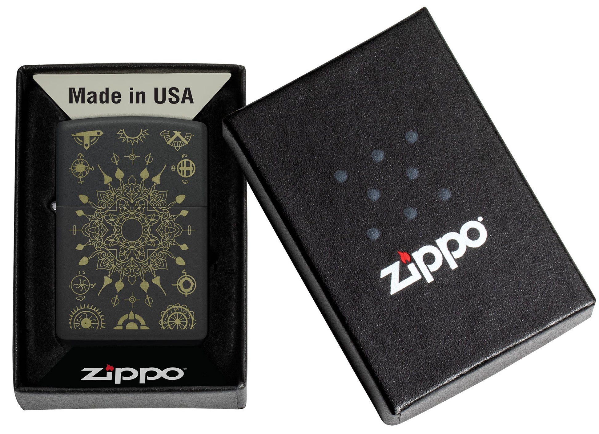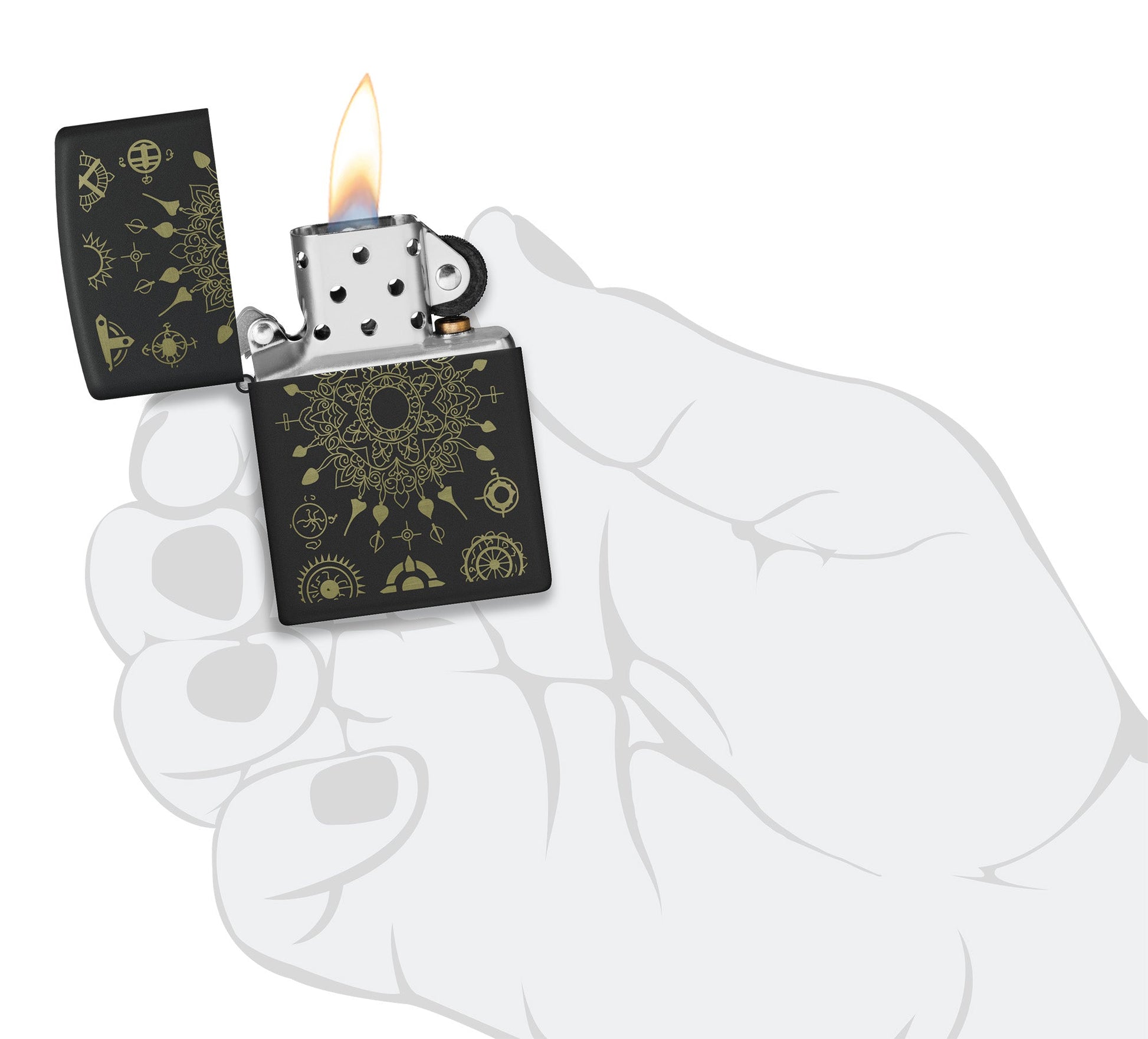 Añada calma y serenidad a su colección con este clásico encendedor Black Matte. Un hipnotizante motivo de mandala aparece grabado meticulosamente con láser para mostrar ricos tonos latón bajo el acabado del encendedor.