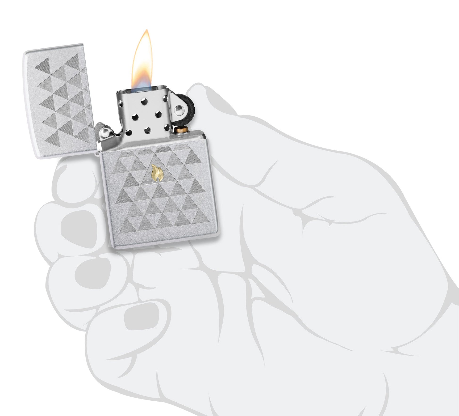 Este clásico encendedor Satin Chrome presenta un hipnotizante motivo de triángulos en un nítido diseño Auto Two-Tone, centrado en el icono de la llama de Zippo en tono latón.