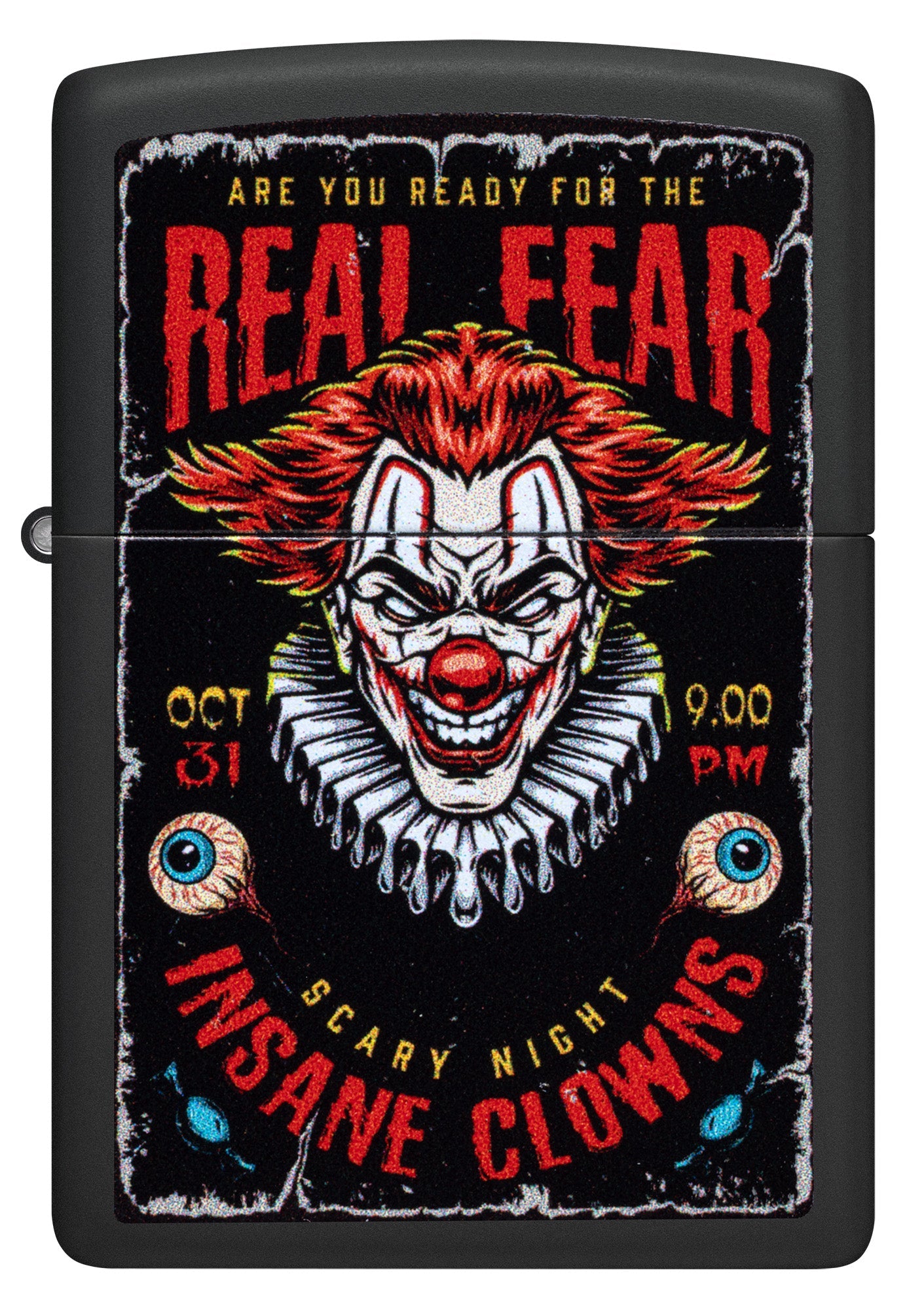 El terror y la emoción de Halloween perduran con este encendedor clásico negro mate. El inquietante diseño a todo color imita un cartel vintage con un payaso aterrador.