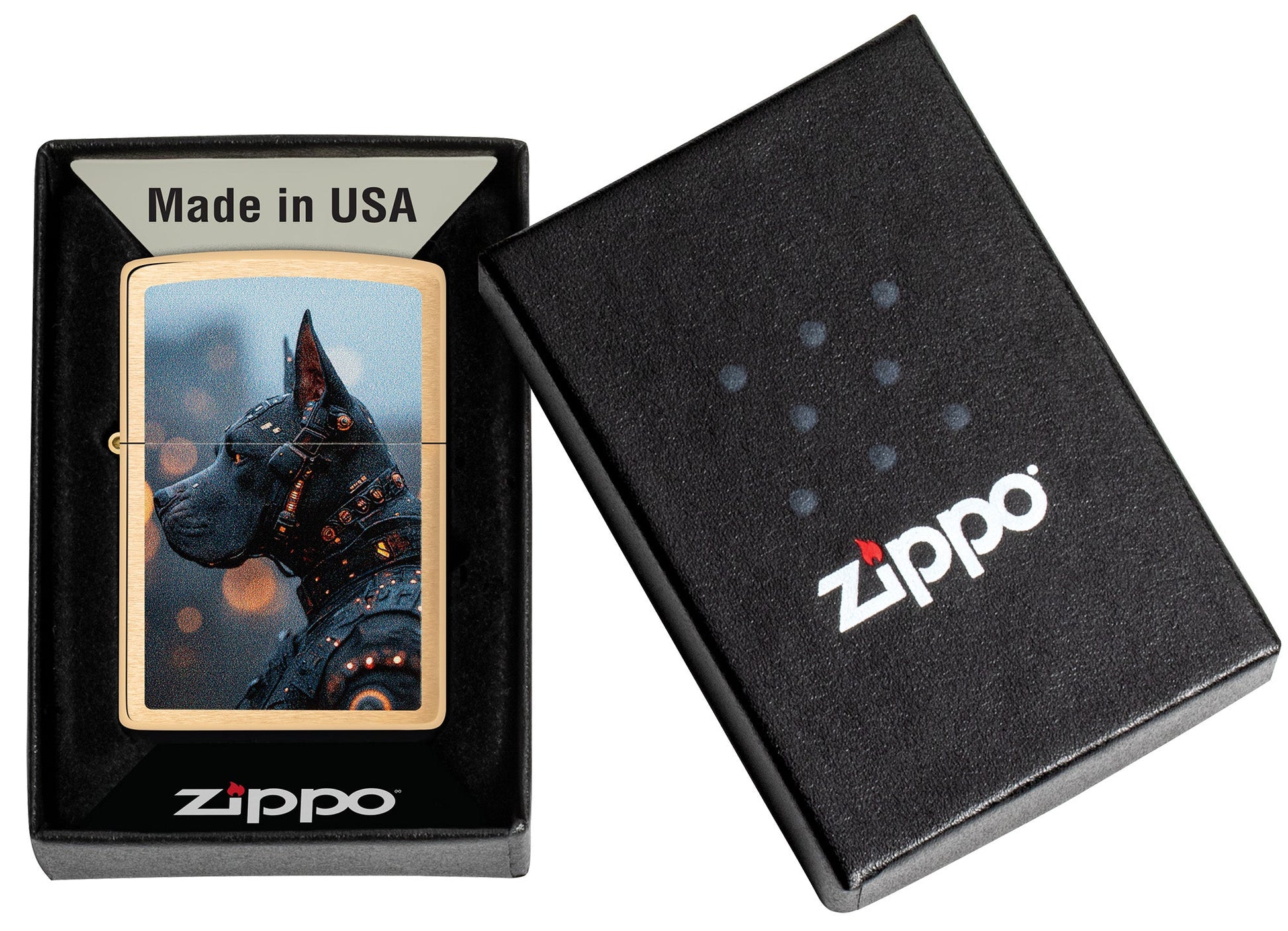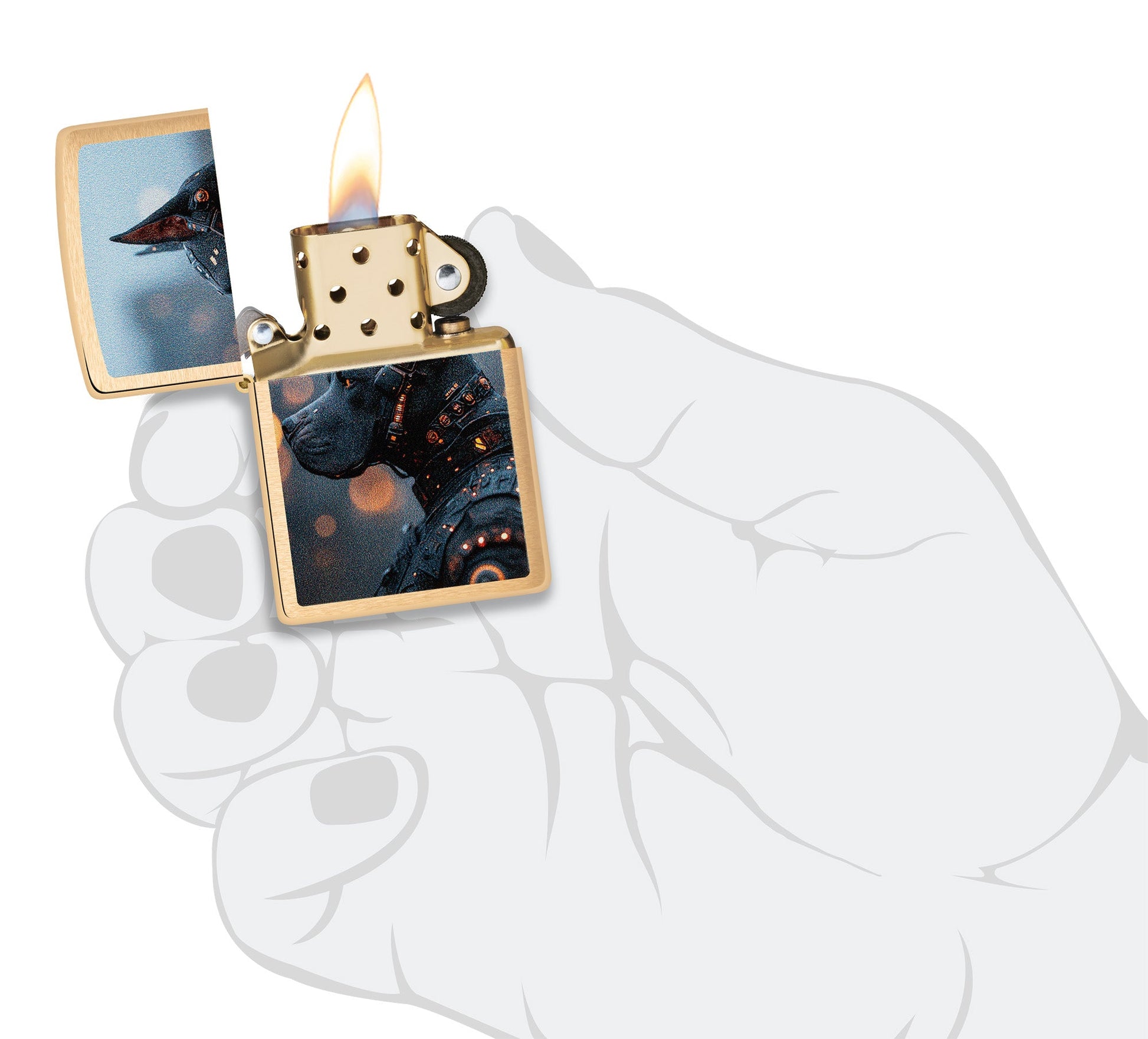 Este clásico encendedor Brushed Brass presenta un perro mecánico en un diseño futurista Color Image.