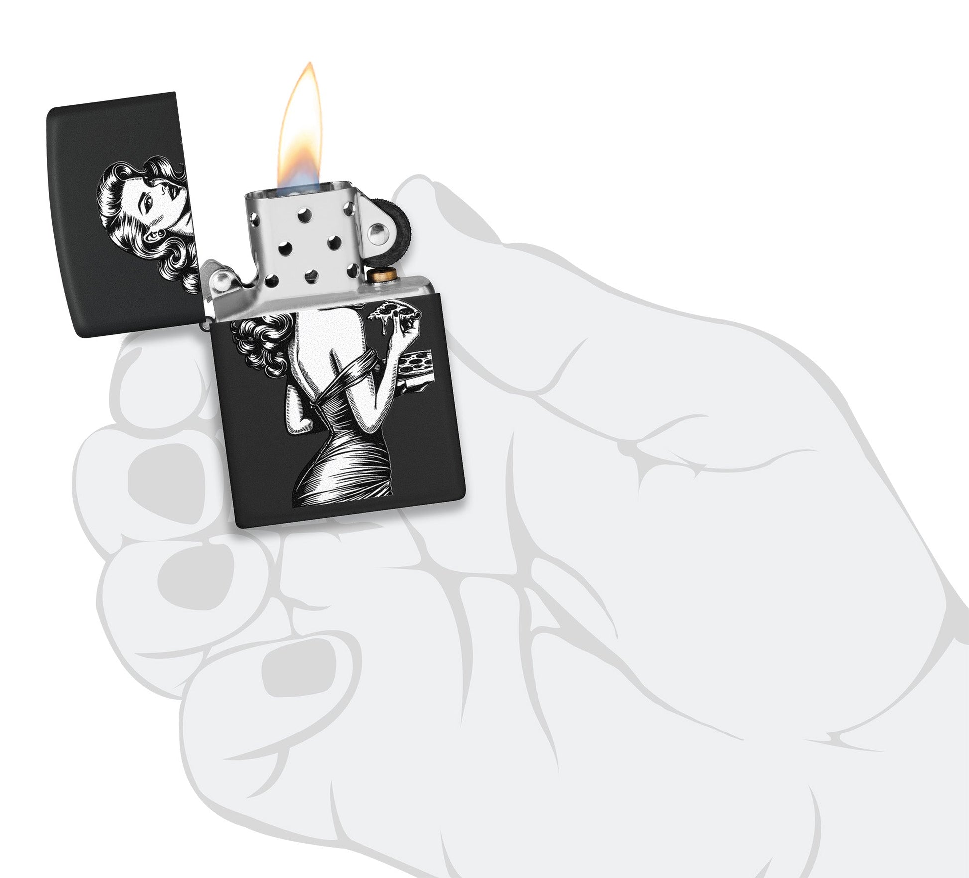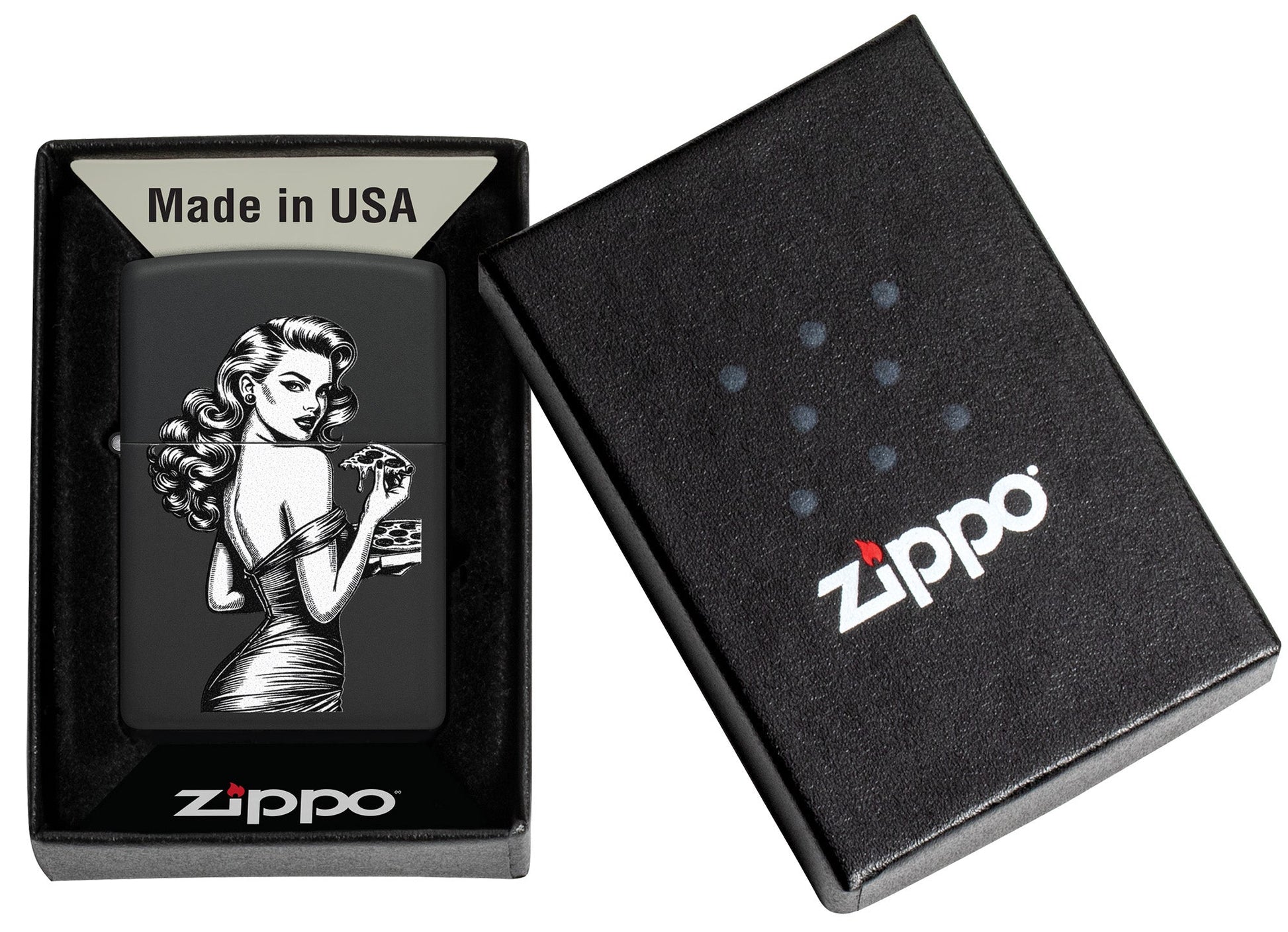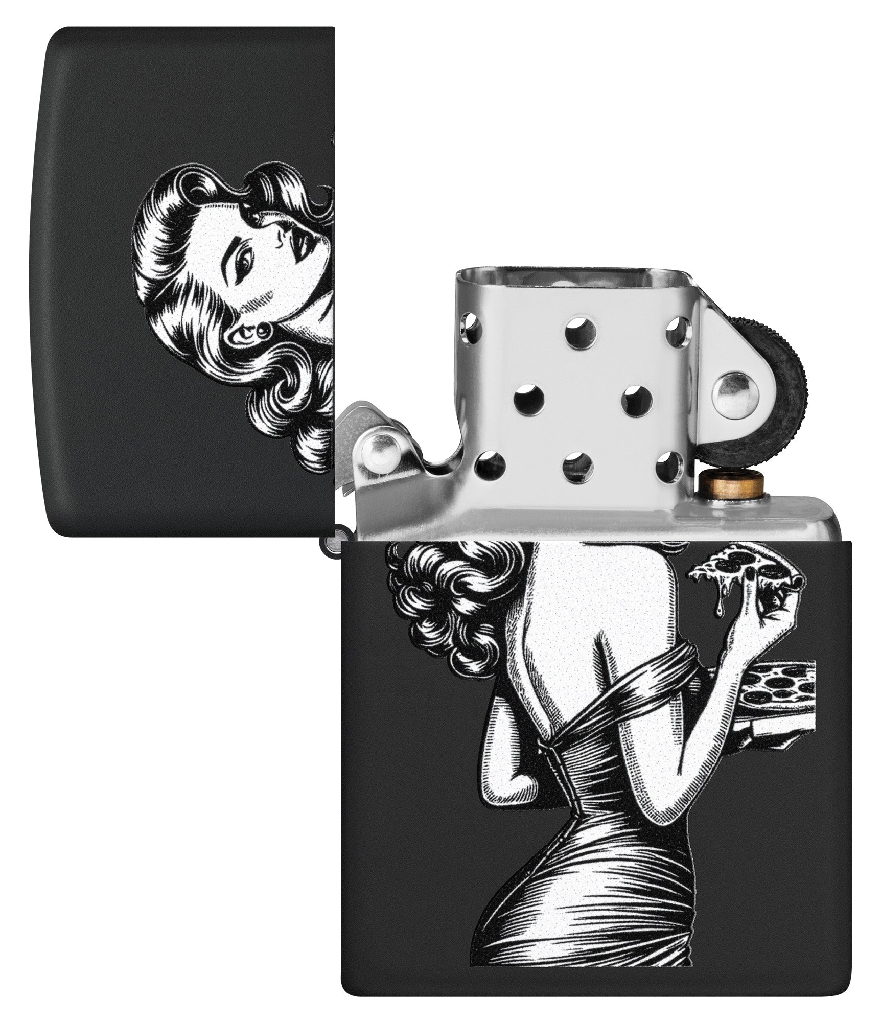 Una hermosa modelo pinup posa con una deliciosa porción de pizza en este encendedor clásico negro mate con un diseño de inspiración vintage a todo color.
