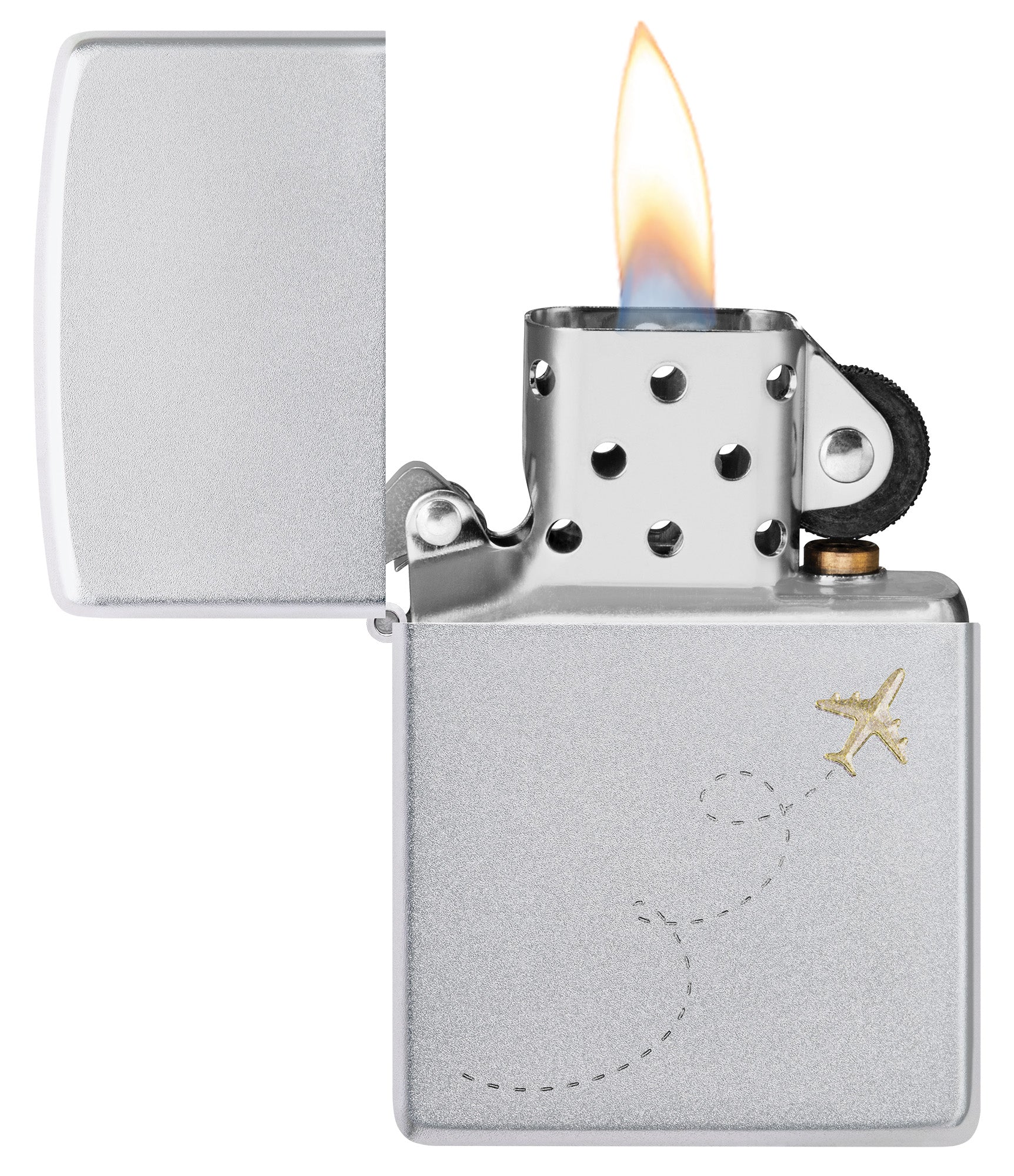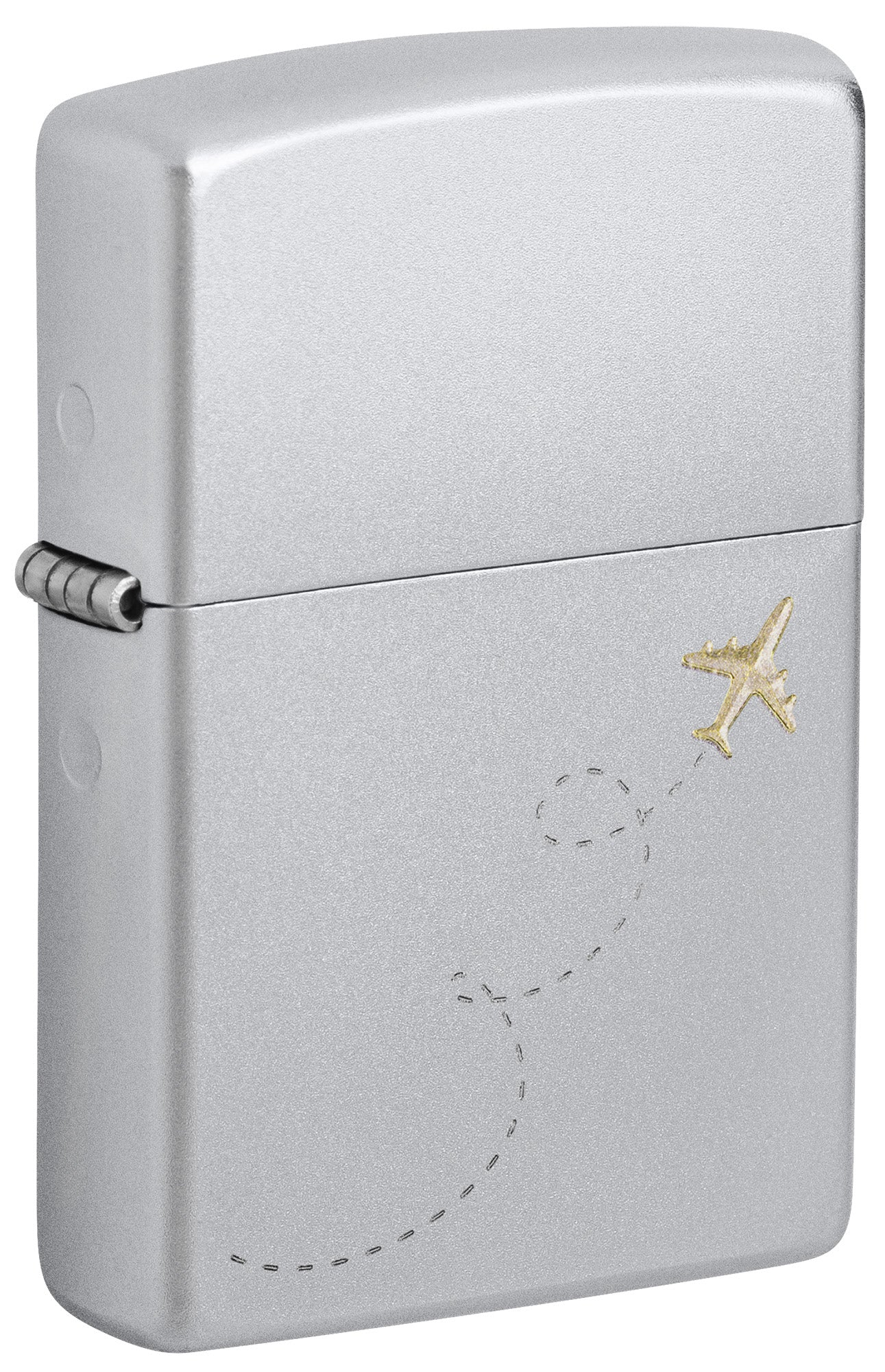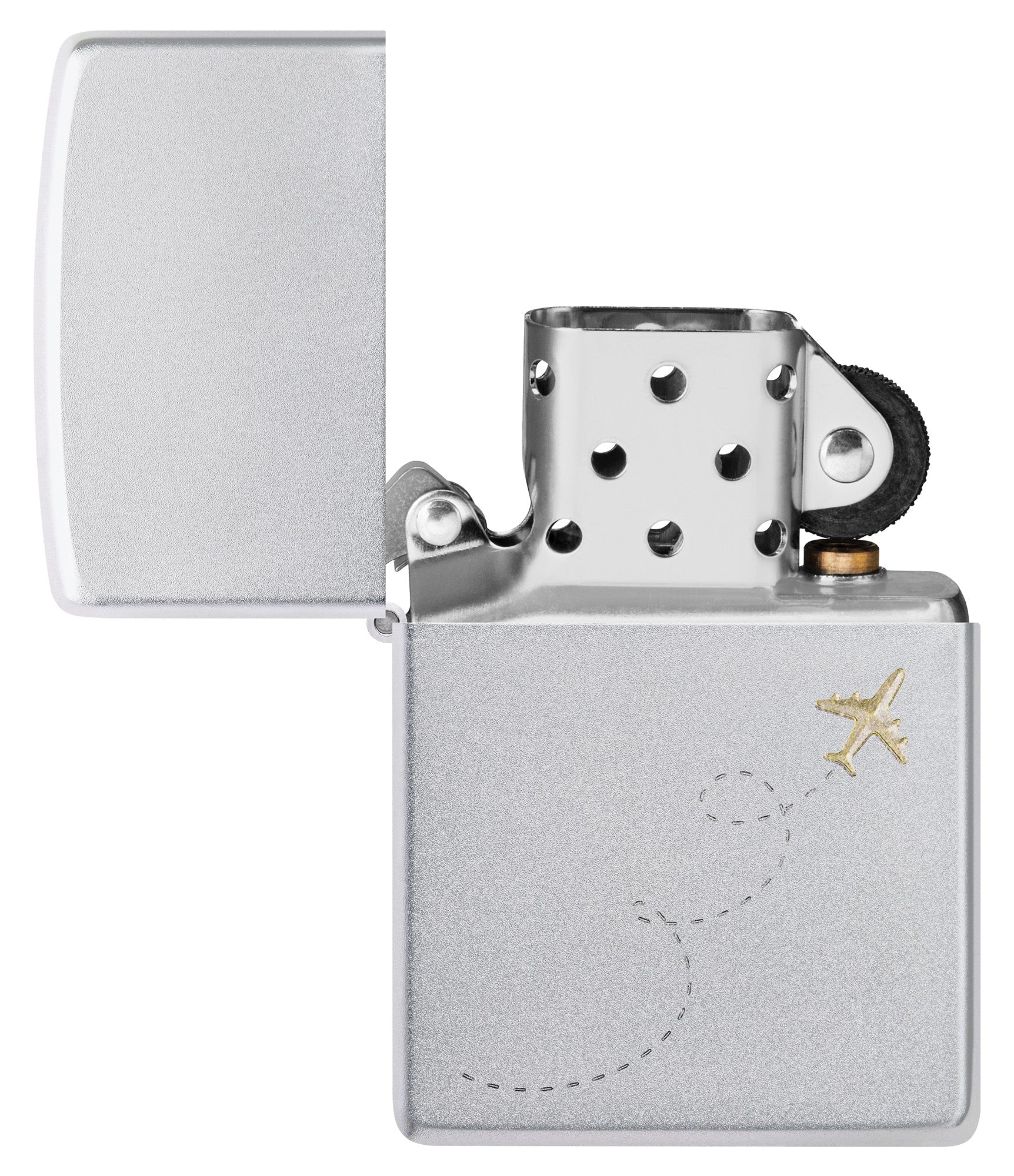 Acompañe sus viajes con este clásico encendedor Satin Chrome. El diseño minimalista Auto Two-Tone muestra un avión y su ruta de vuelo en elegantes tonos latón y cromo.