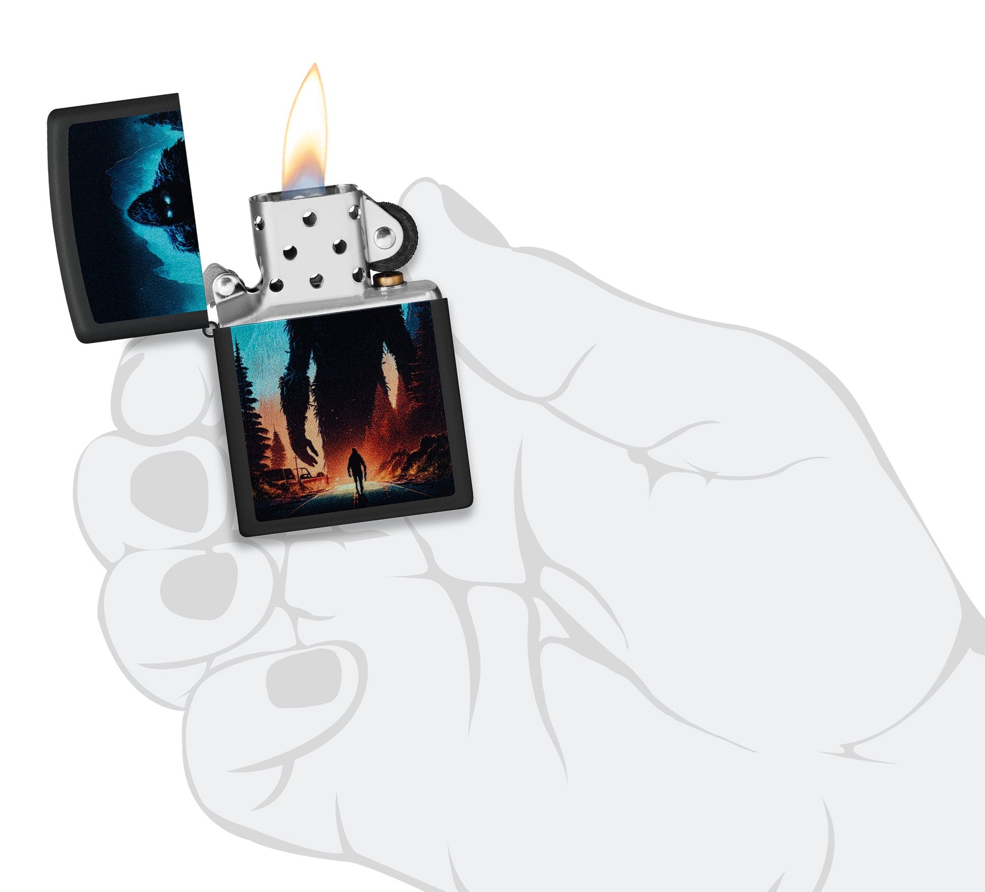 Un enorme sasquatch se alza sobre una carretera iluminada por la luna en este encendedor clásico negro mate. El espeluznante diseño a todo color brilla bajo la luz ultravioleta mediante nuestro proceso especial Black Light.