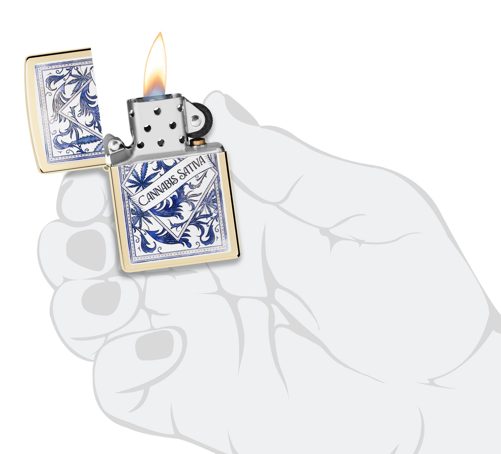 Con tonos azules serenos y motivos de vegetación en espiral, una elegante etiqueta de farmacia antigua para cannabis sativa decora este clásico encendedor Champagne en un relajante diseño Color Image.