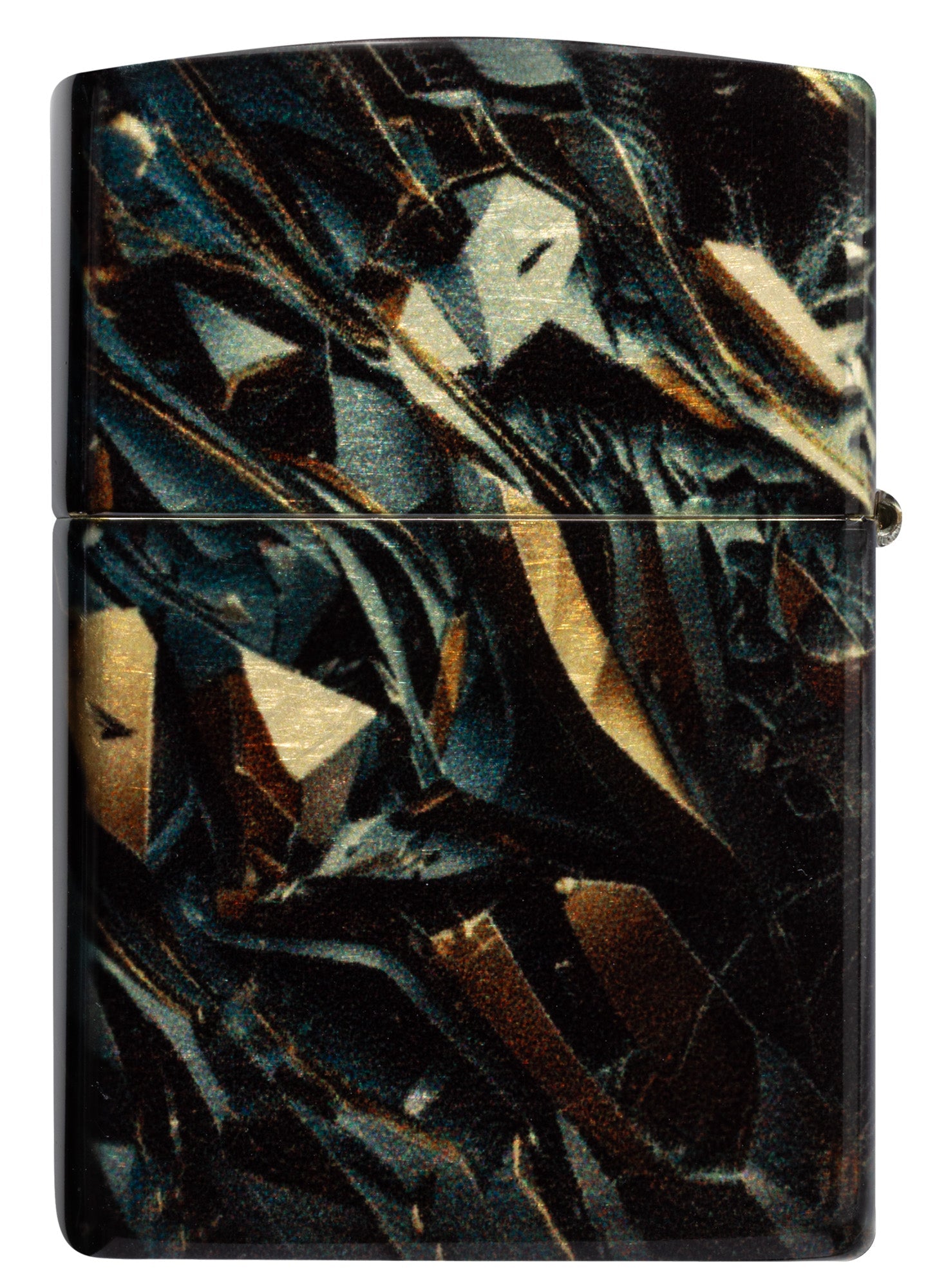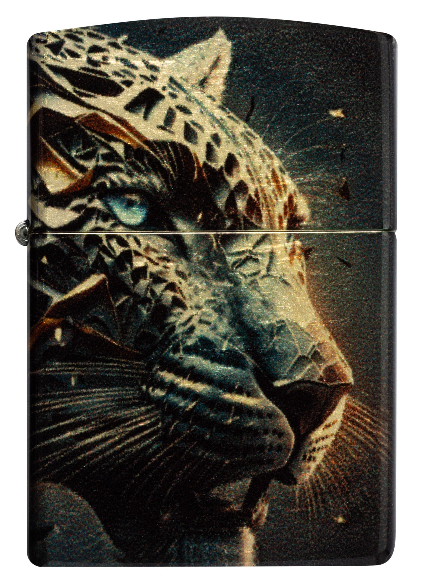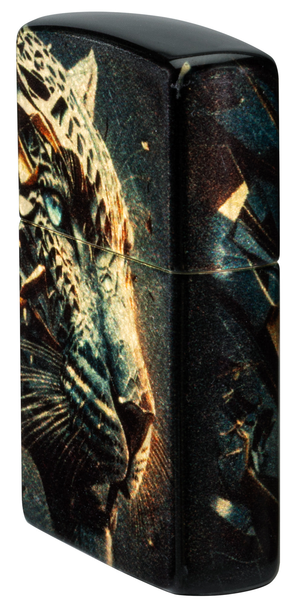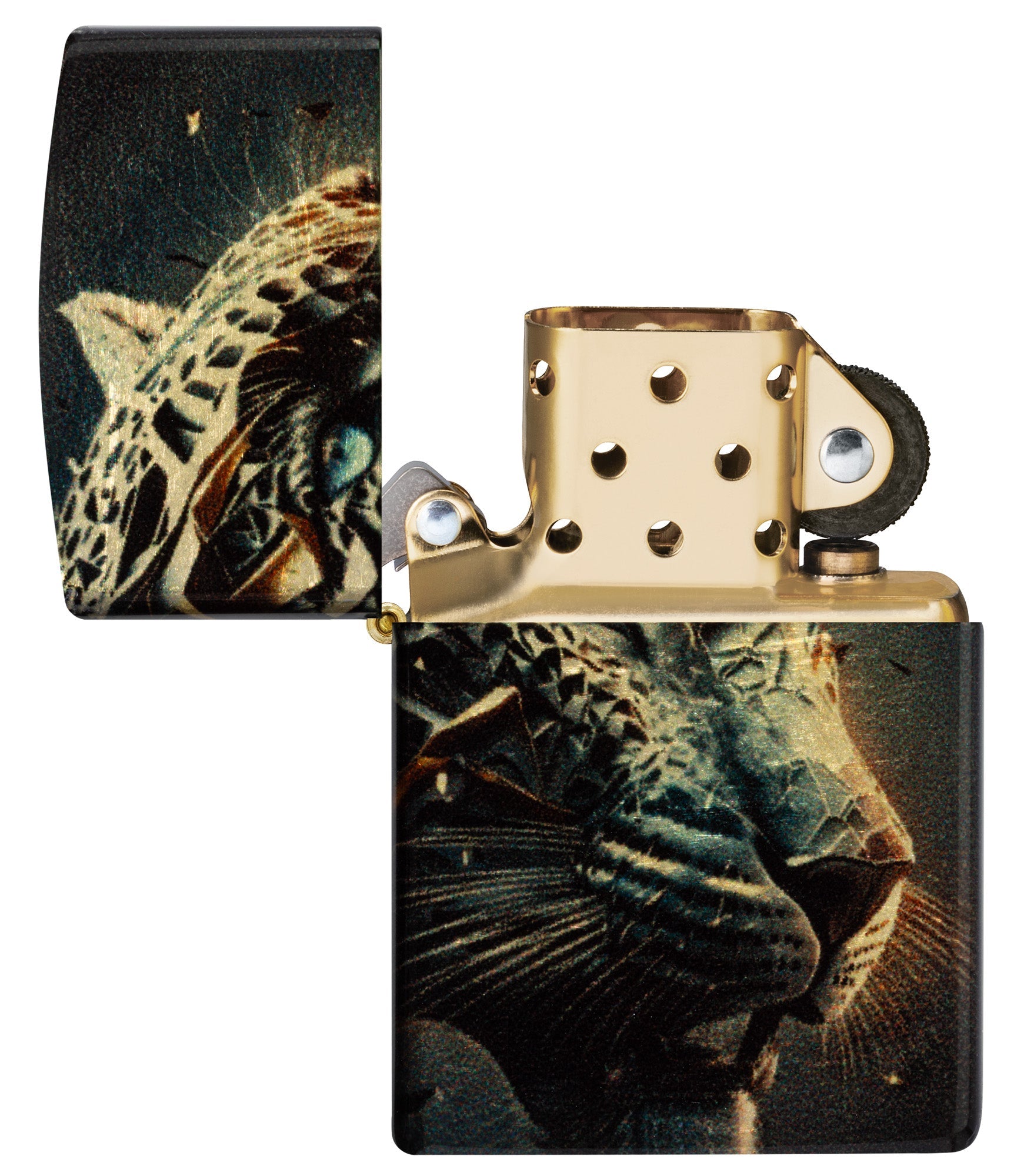 Brillantes fragmentos de metal retorcido convergen para formar la feroz cabeza de una pantera en este encendedor clásico de latón pulido con un deslumbrante diseño 540° Fusion.