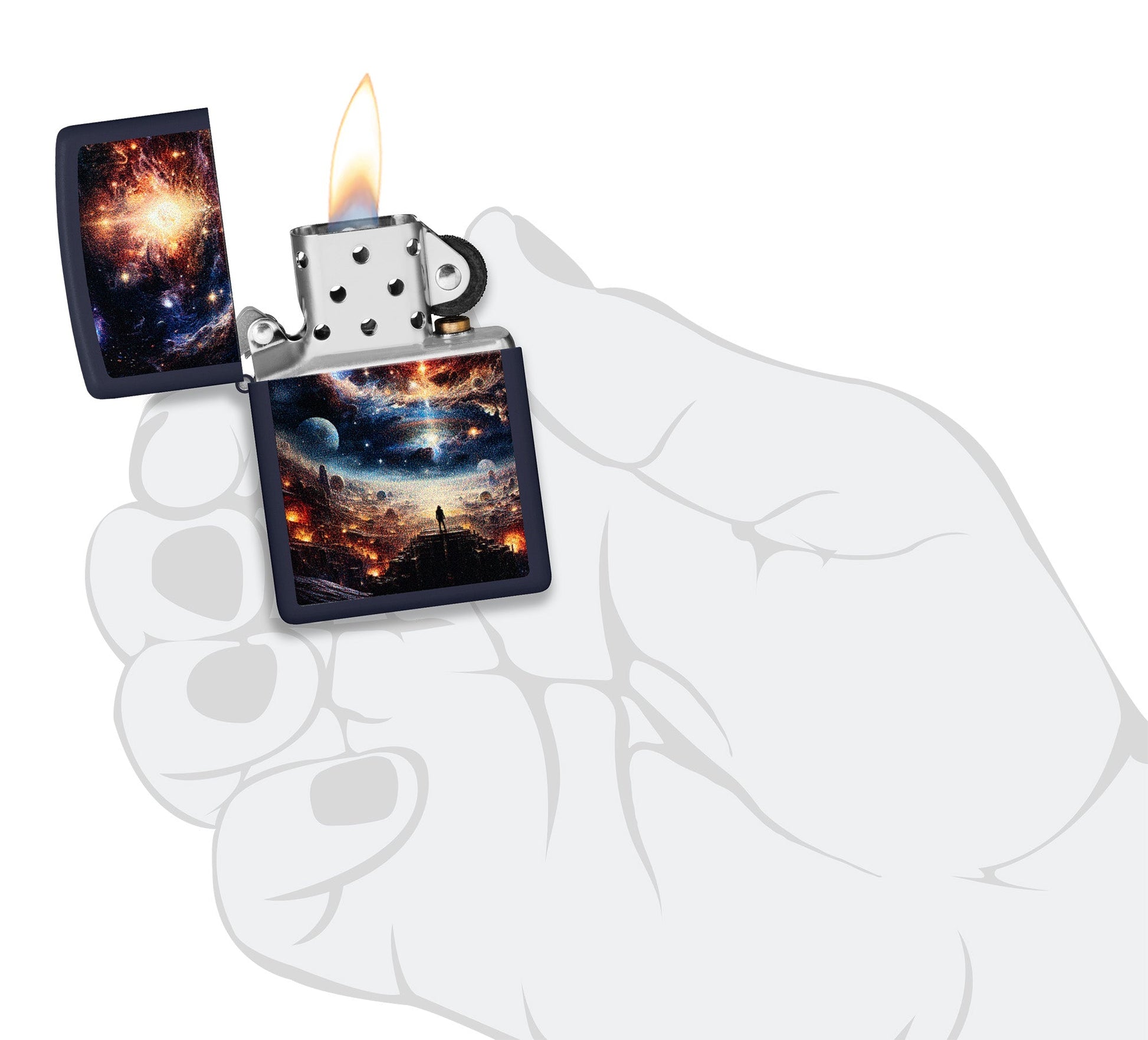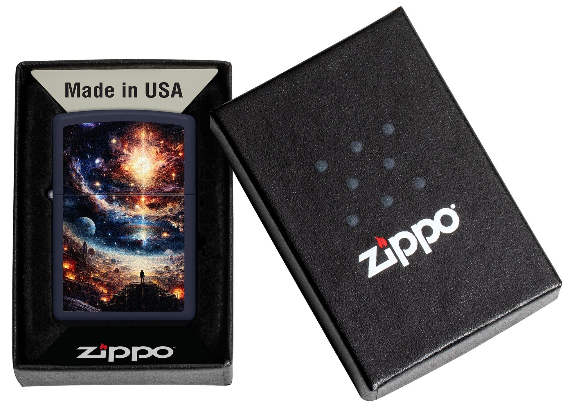 Estrellas, planetas y galaxias iluminan el cielo de un paisaje de otro mundo en este clásico encendedor Navy Matte con un hipnótico diseño Color Image.