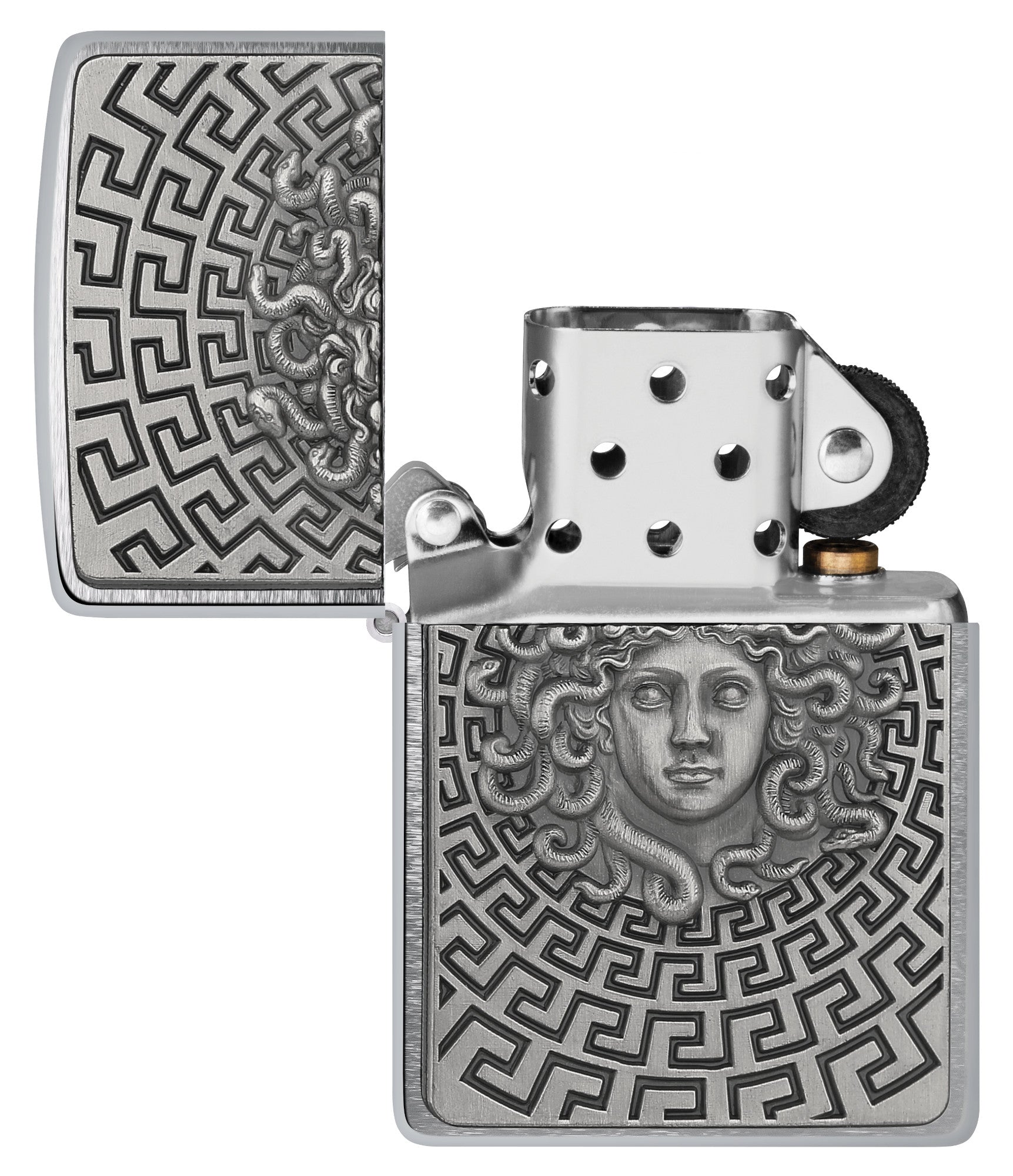 Capaz de convertir en piedra incluso a los mortales más poderosos, el rostro de Medusa también se considera un símbolo de protección y escudo contra el mal. Este clásico encendedor Brushed Chrome presenta la cabeza de Medusa sobre un fondo geométrico hipnotizante en un intrincado emblema metálico grabado.