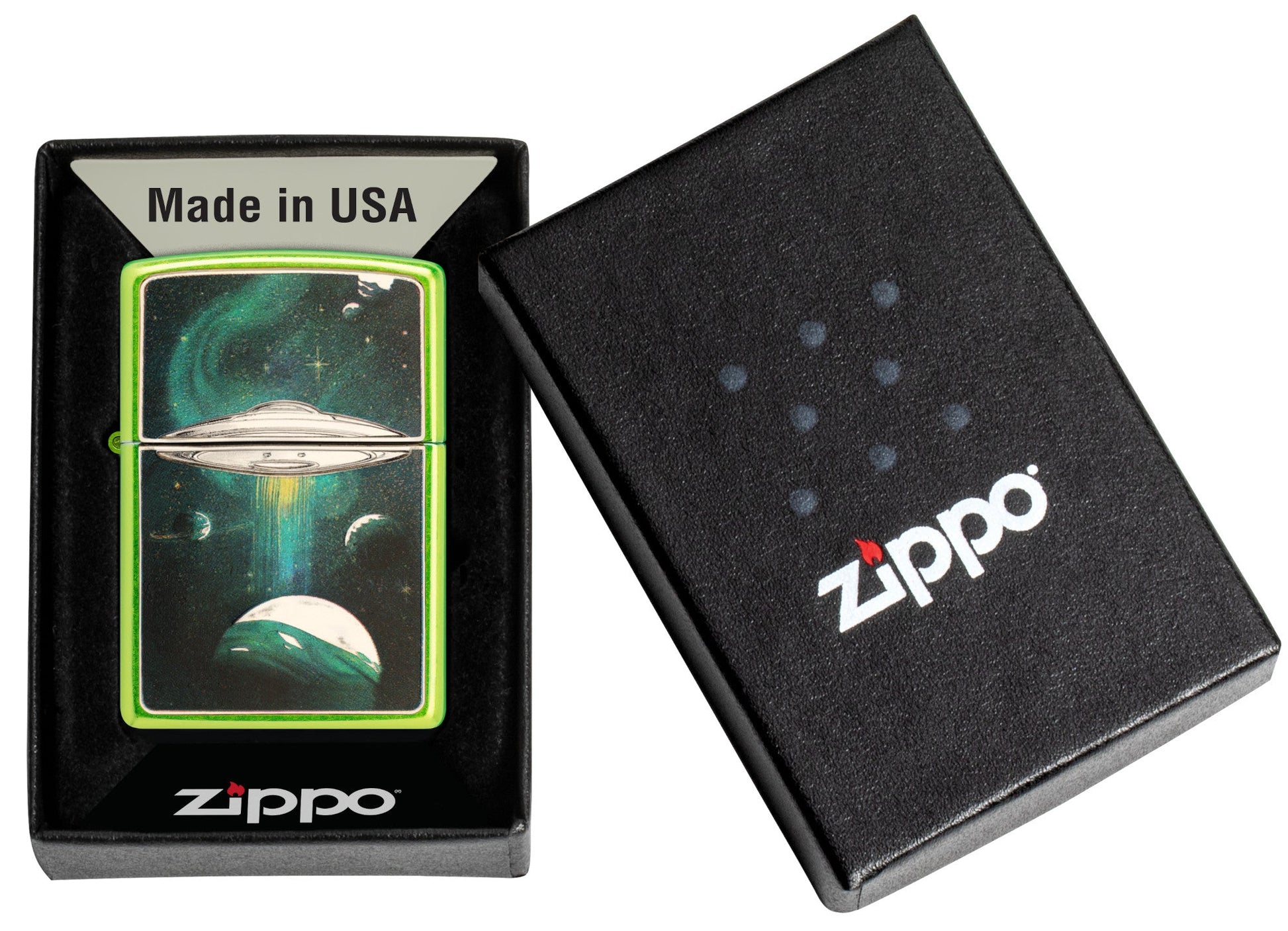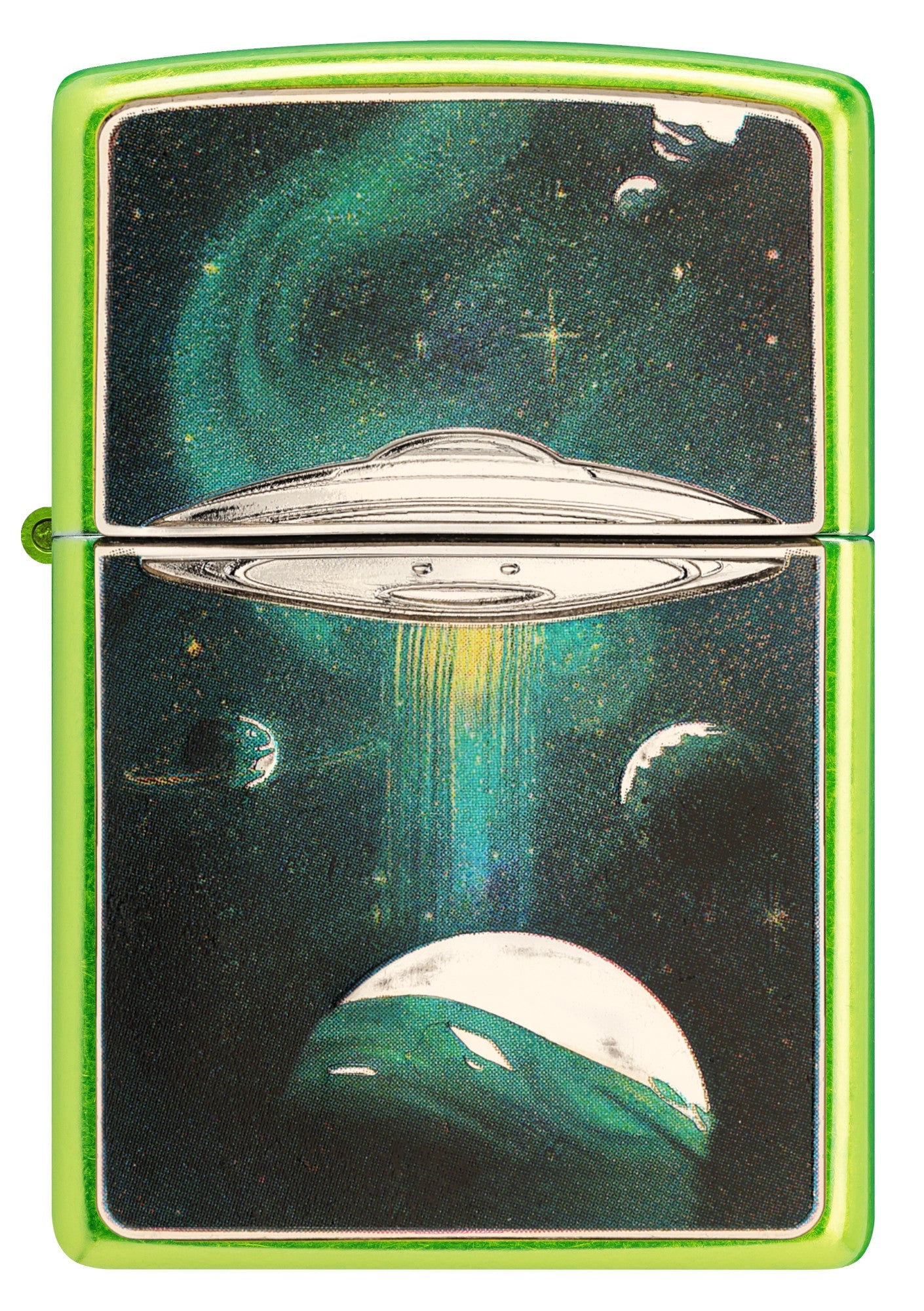 Este encendedor clásico Lurid es el fondo perfecto para un vibrante emblema metálico que muestra una nave alienígena lanzando un rayo de luz sobre un planeta desprevenido.