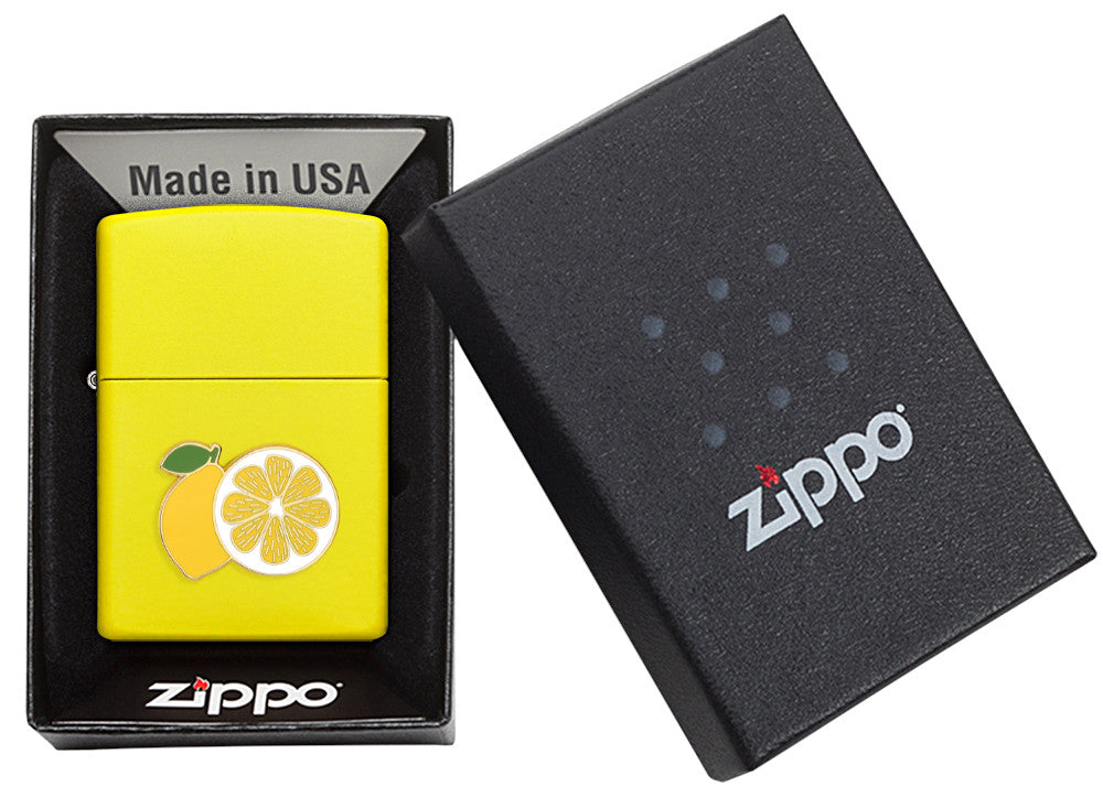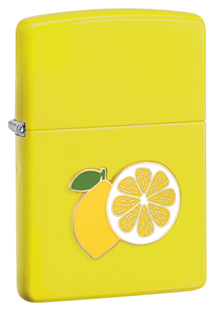 Este brillante y cítrico encendedor amarillo mate presenta un limón fresco y maduro sobre un vibrante emblema de metal y esmalte.