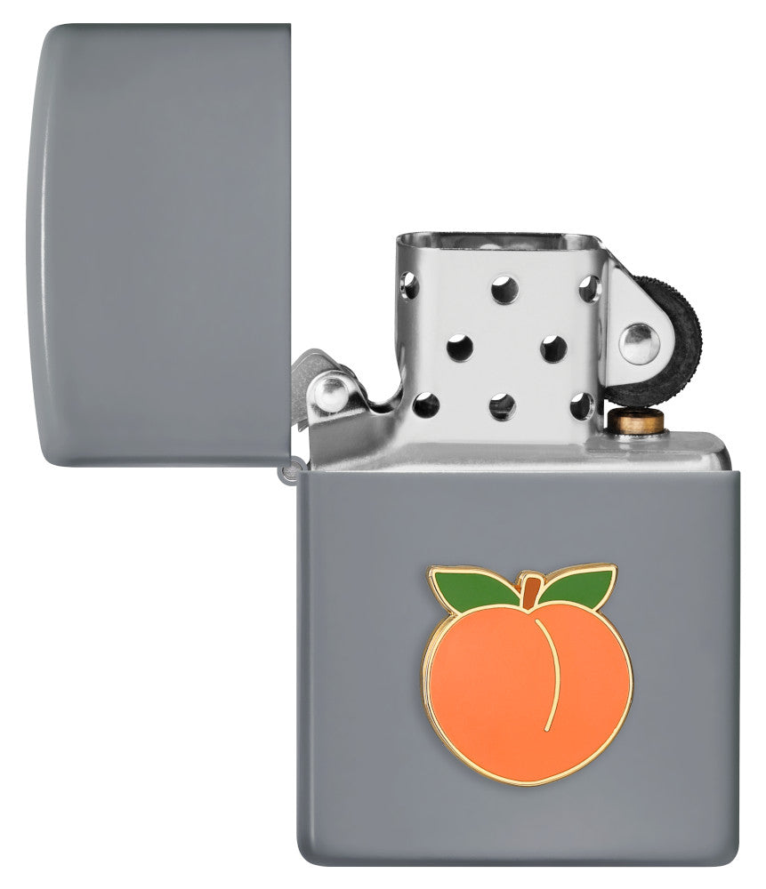 Un melocotón fresco y maduro cobra vida en la superficie de este clásico encendedor gris mate, sobre un vibrante emblema de metal y esmalte.