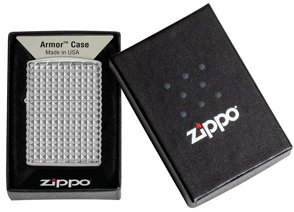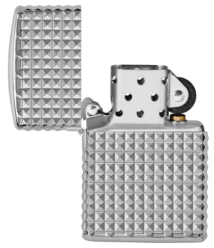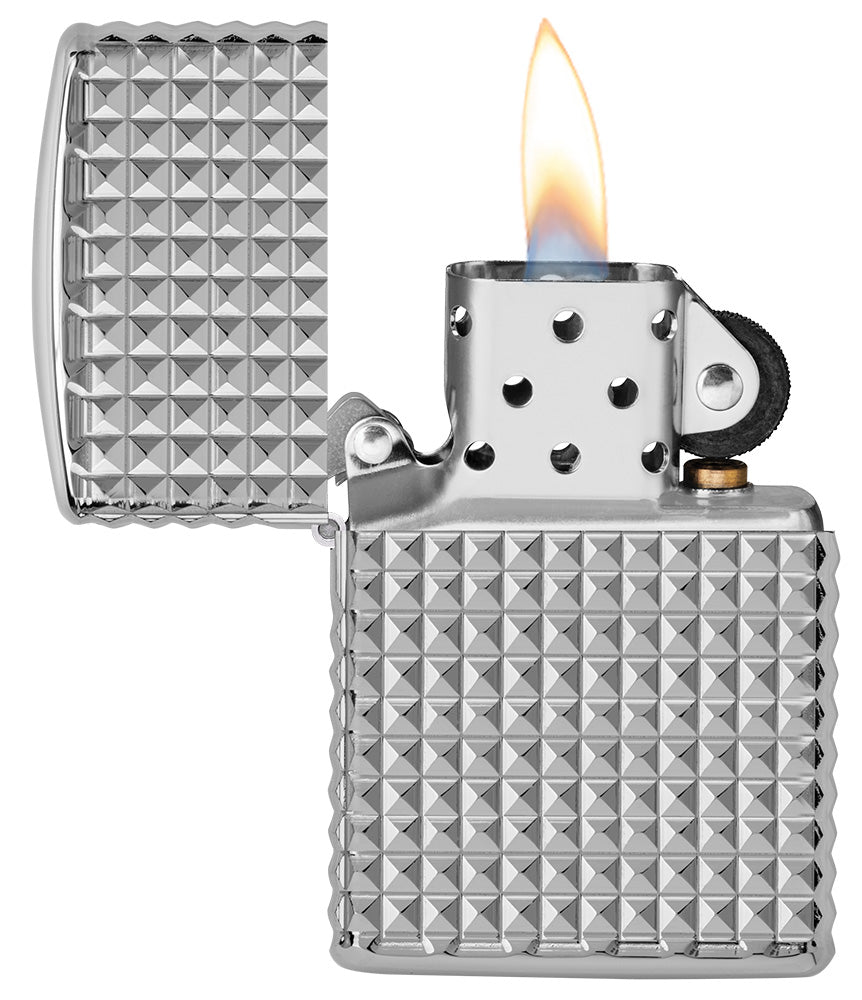 Para grabar este lujoso patrón de diamantes alrededor de todas las caras del encendedor Armor® High Polish Chrome se ha utilizado nuestro proceso MultiCut.
