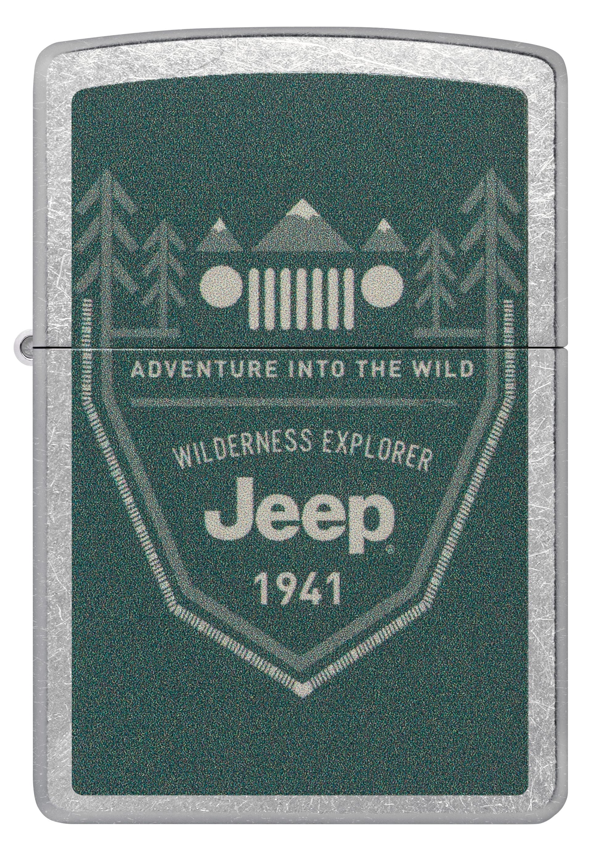 Aventúrese en la naturaleza con este encendedor clásico Street Chrome. El diseño minimalista Color Image representa la icónica parrilla de Jeep entre un paisaje salvaje de color verde bosque y está anclado por el logotipo de Jeep y el año de fundación.