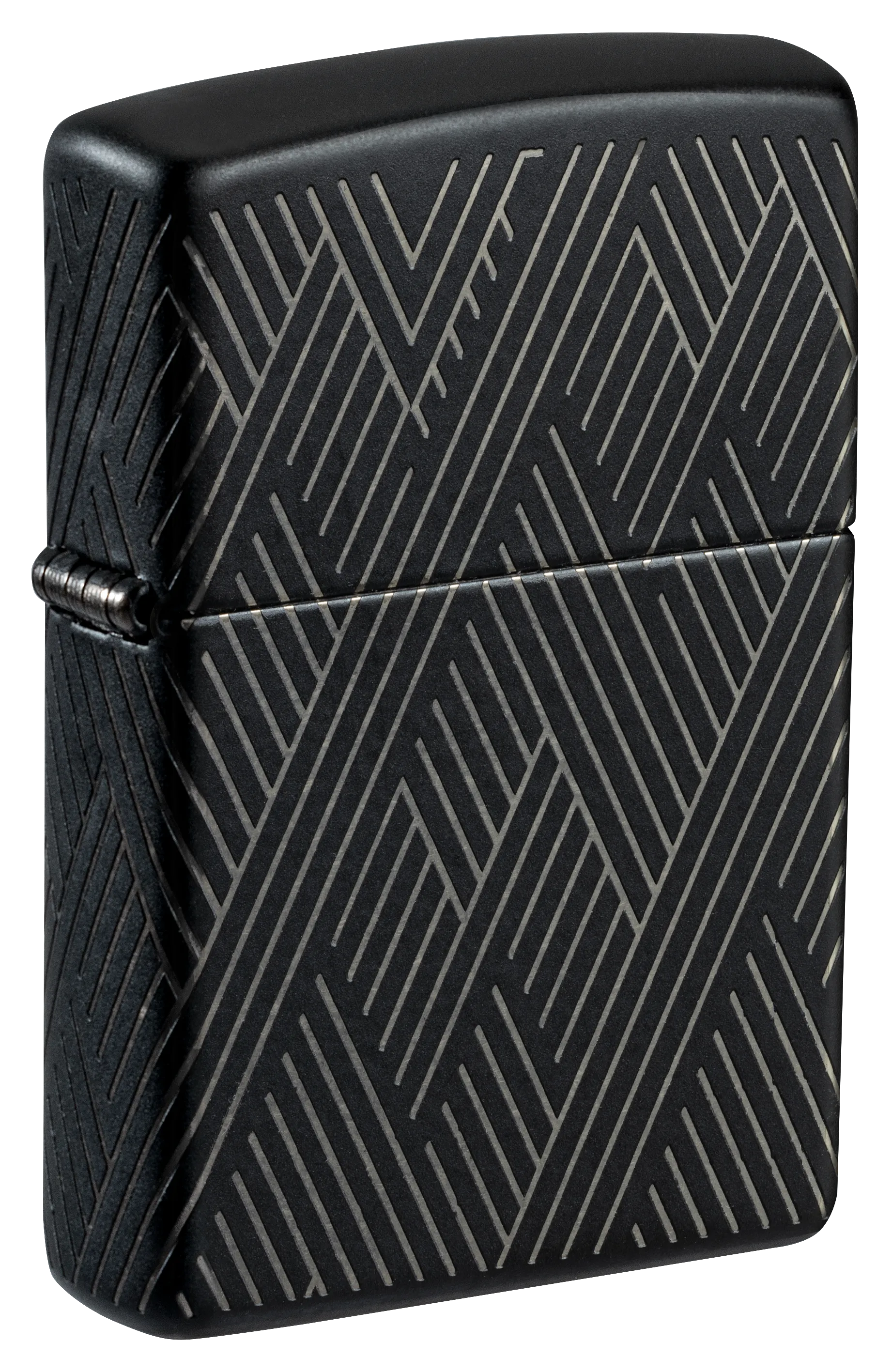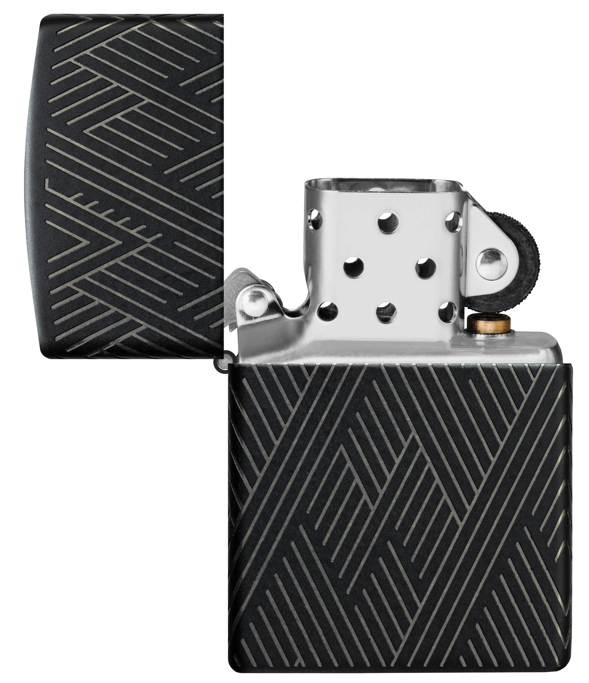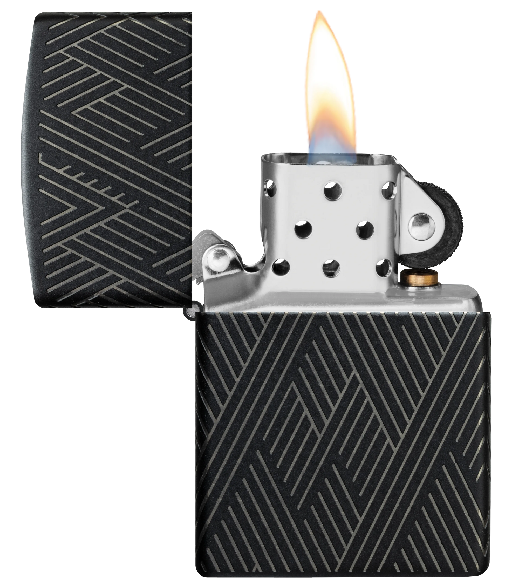 Líneas concisas y paralelas forman un fascinante patrón en todos los lados de este clásico encendedor Black Matte en un intrincado diseño Laser 360°, que permite que los tonos cromados de la carcasa del encendedor contrasten de maravilla con el suave acabado mate.
