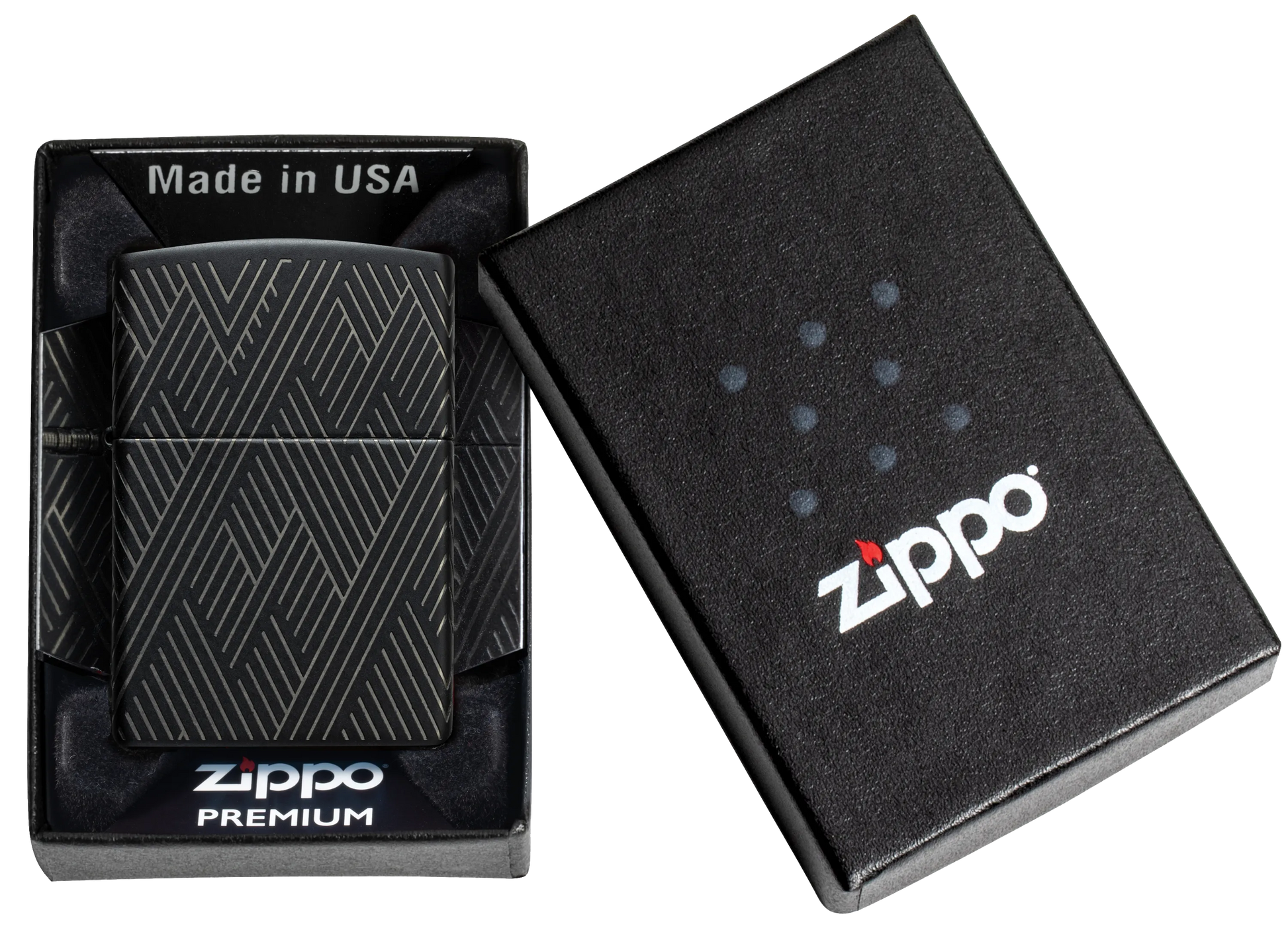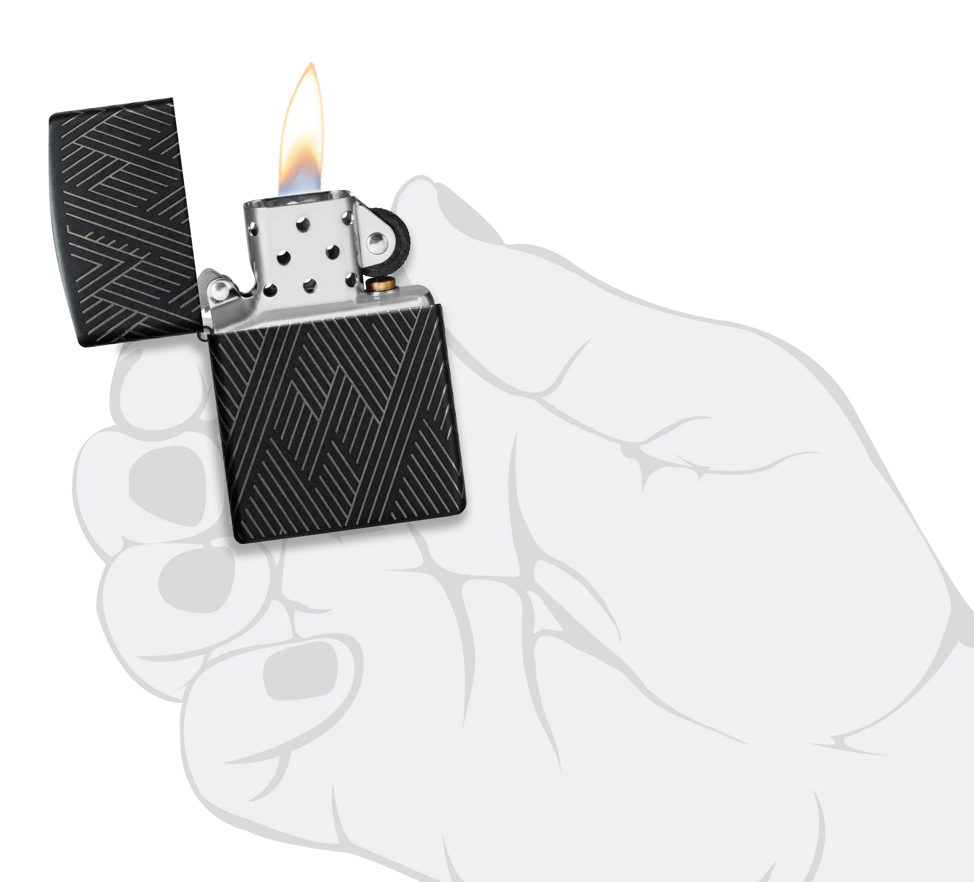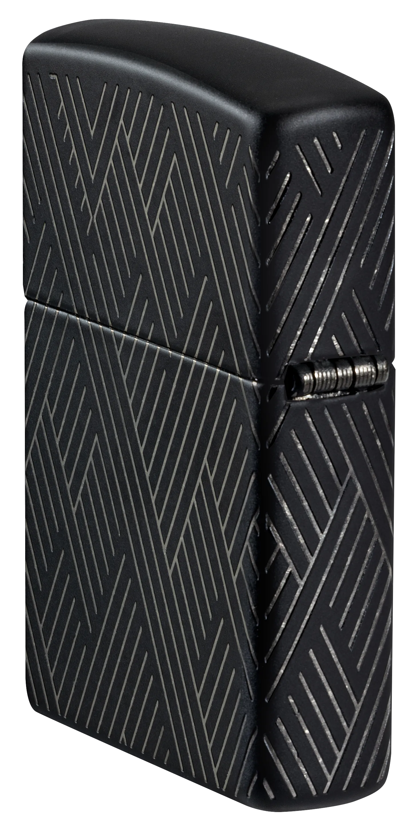 Líneas concisas y paralelas forman un fascinante patrón en todos los lados de este clásico encendedor Black Matte en un intrincado diseño Laser 360°, que permite que los tonos cromados de la carcasa del encendedor contrasten de maravilla con el suave acabado mate.