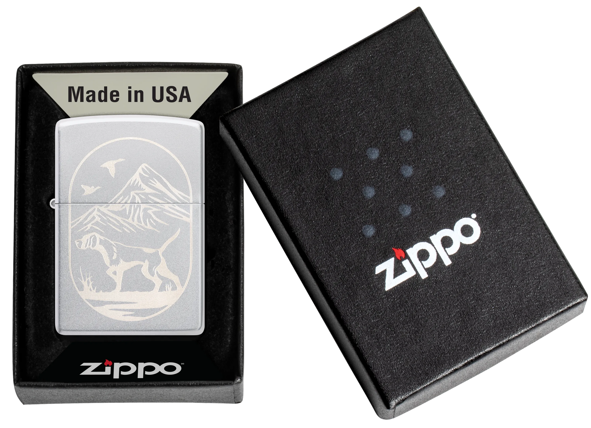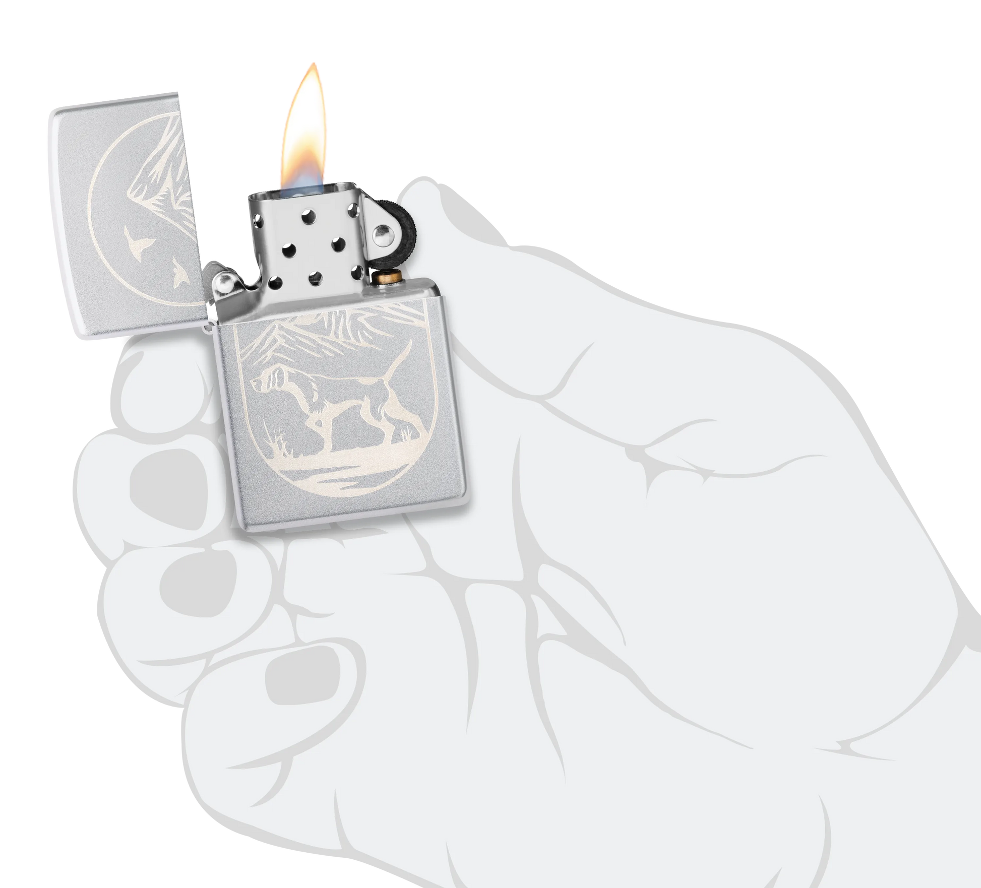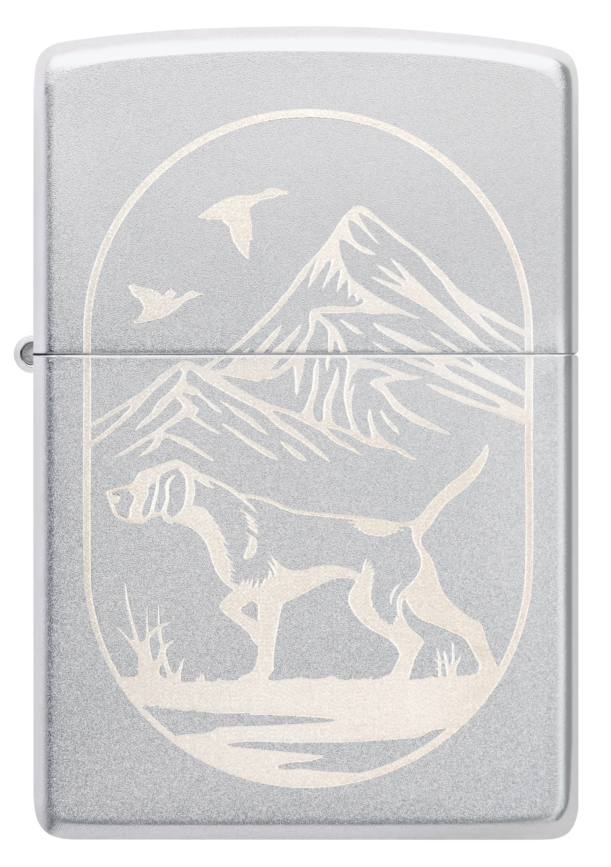 Llévese este clásico encendedor Satin Chrome en su próxima salida de caza. Con un paisaje montañoso como fondo, un fiel sabueso sigue un rastro de olor por la superficie del encendedor en un diseño Laser Engrave monocromático.