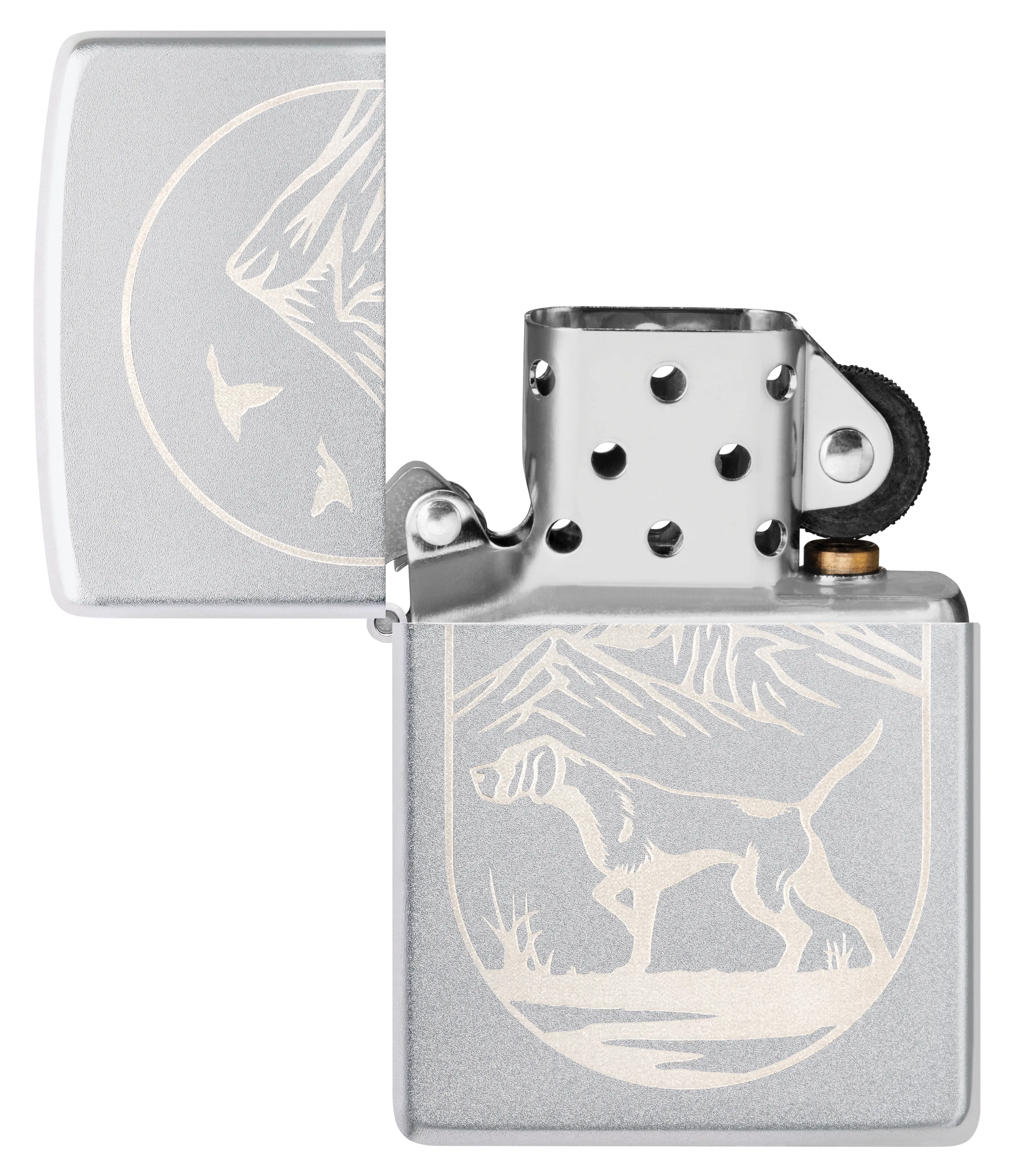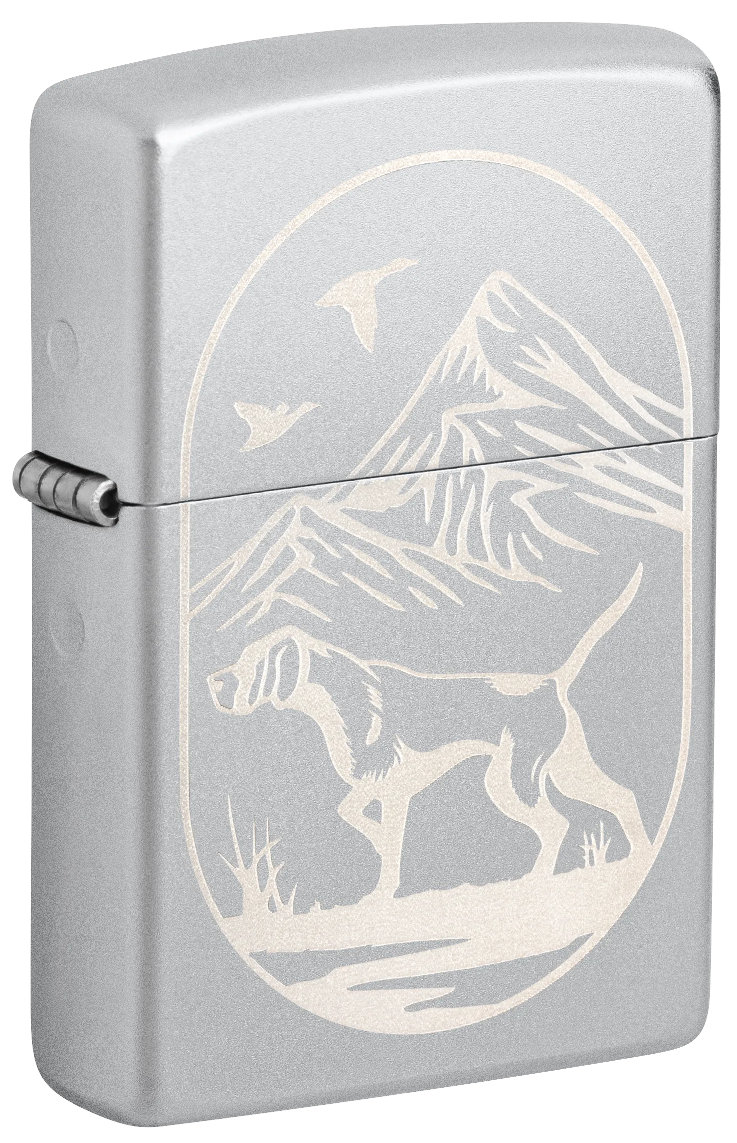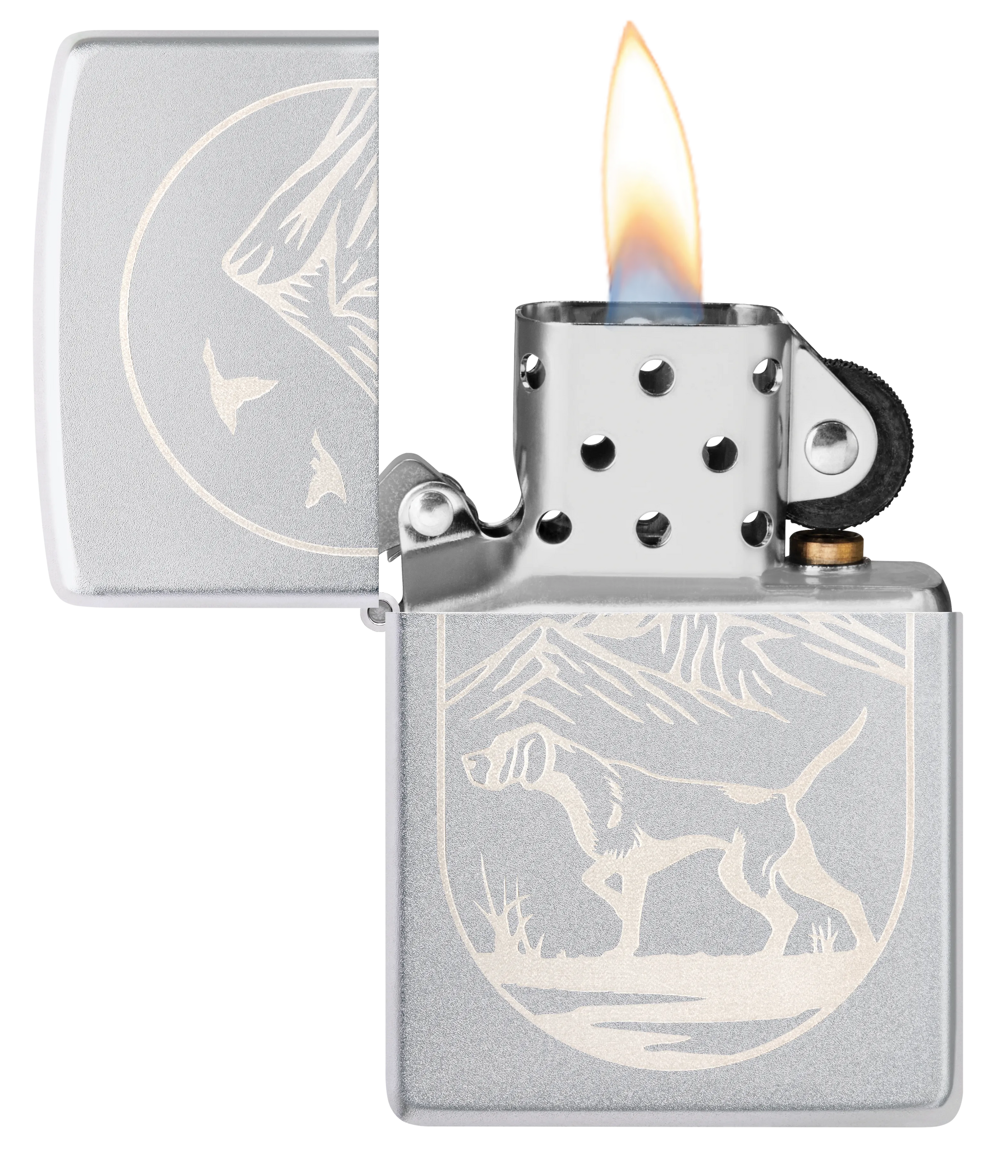 Llévese este clásico encendedor Satin Chrome en su próxima salida de caza. Con un paisaje montañoso como fondo, un fiel sabueso sigue un rastro de olor por la superficie del encendedor en un diseño Laser Engrave monocromático.