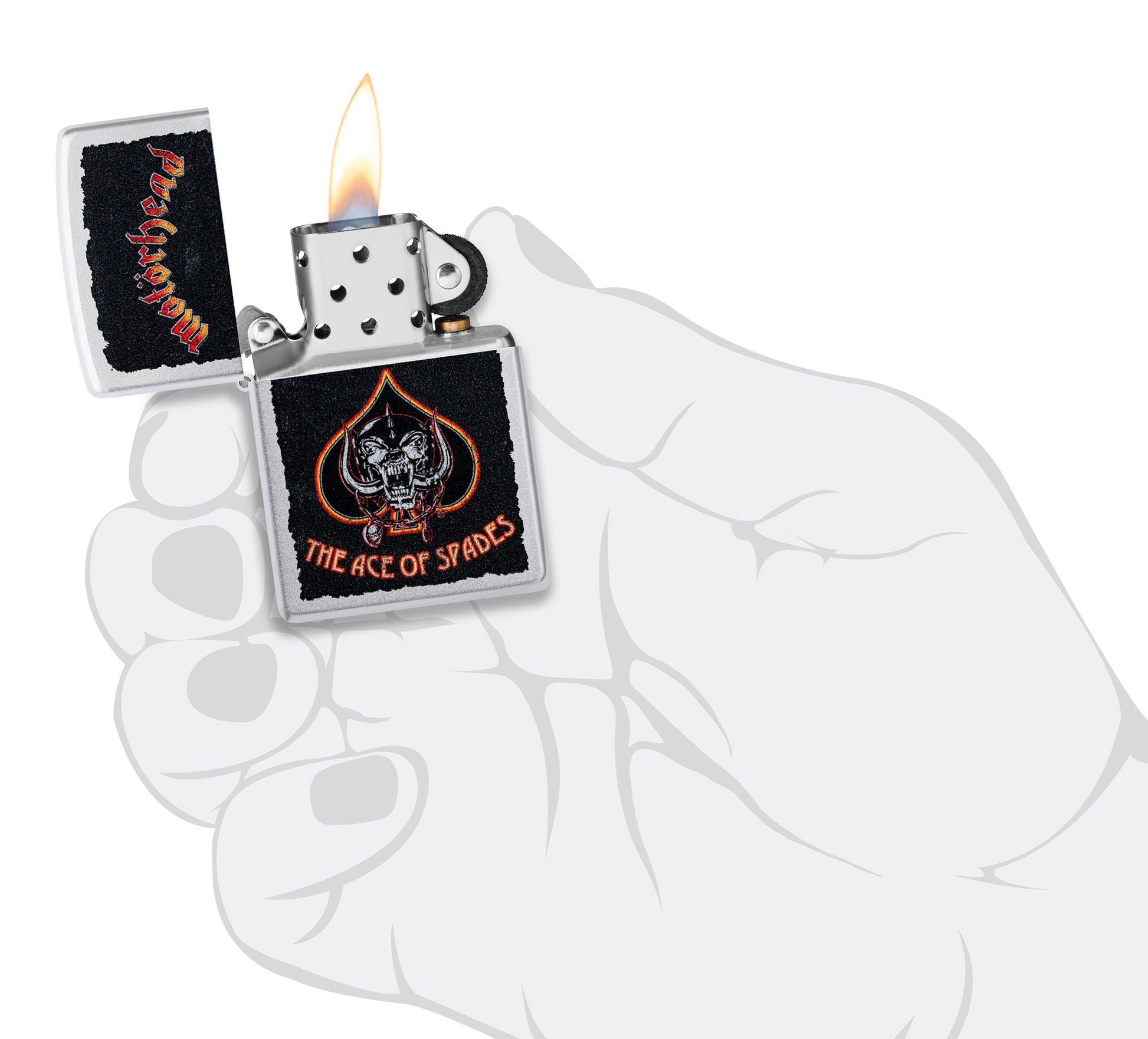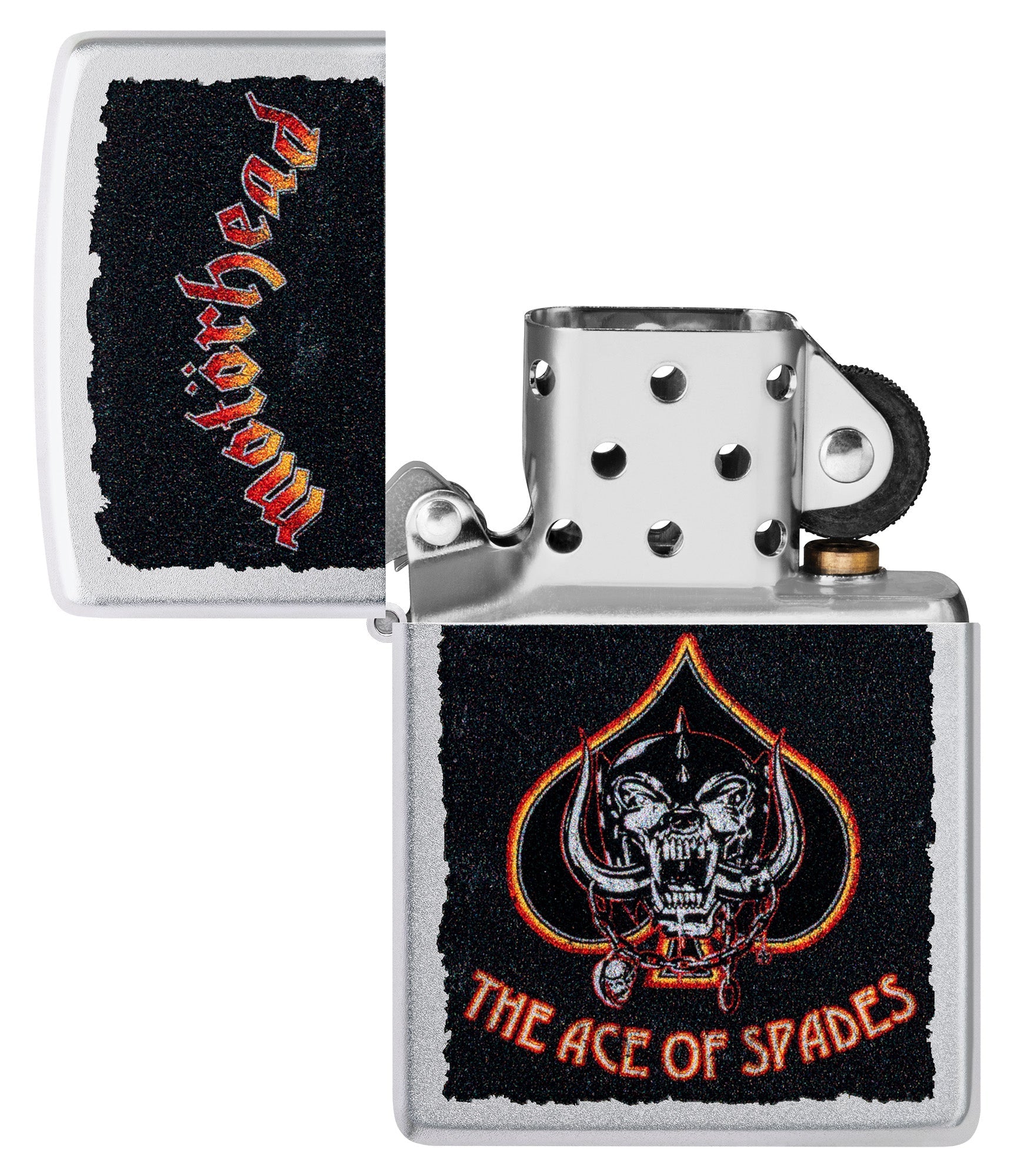 Revive la música de Motörhead con este clásico encendedor Satin Chrome. El logotipo de la banda y su emblemática mascota, Warpig, aparecen junto a la inscripción «The Ace of Spades» en un emocionante diseño a todo color.