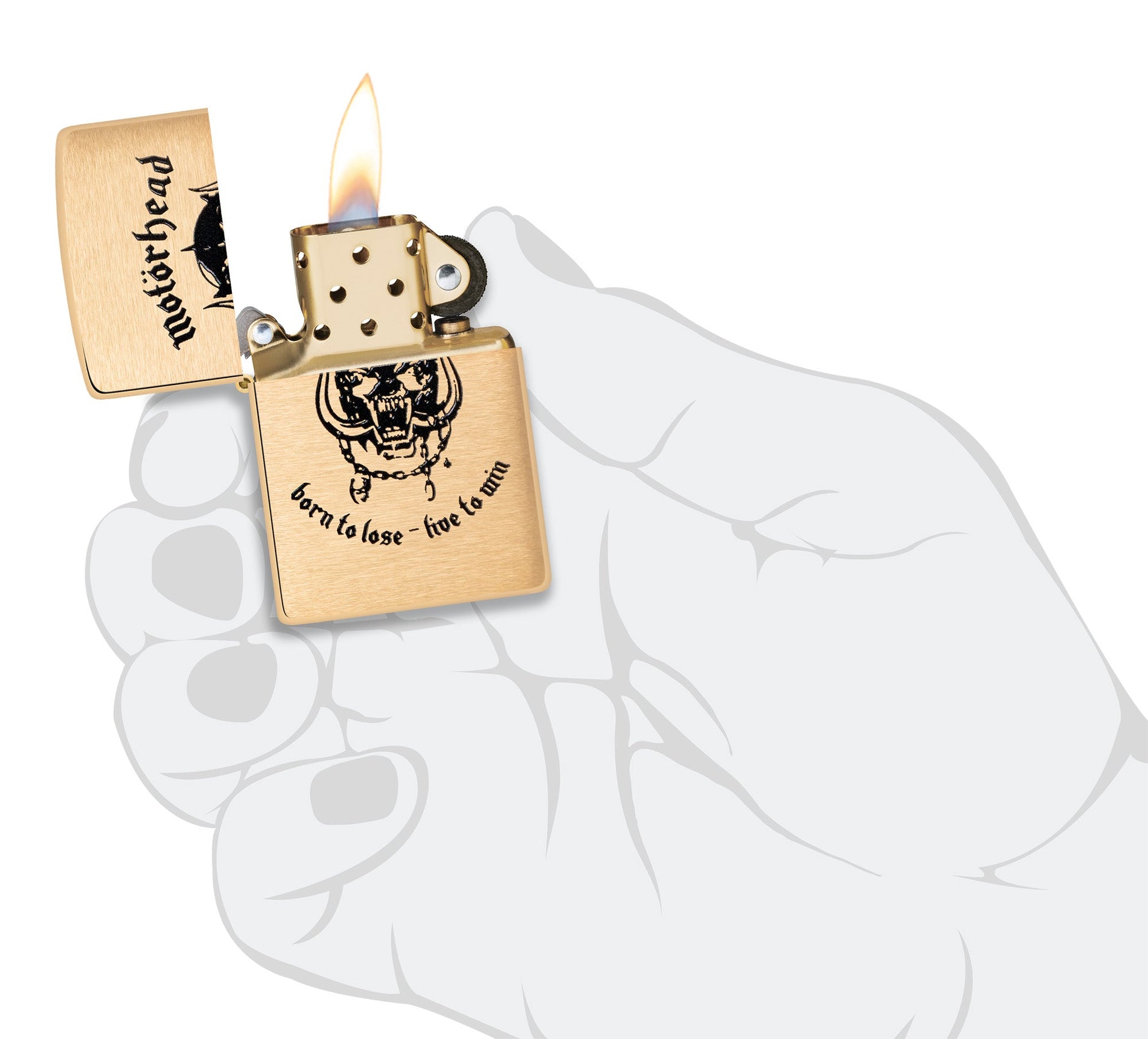Revive la música de Motörhead con este clásico encendedor de latón cepillado. Warpig, el emblemático logotipo de la banda, aparece debajo del nombre de la banda con la inscripción «Born to lose - live to win» (Nacido para perder, vive para ganar) en un sencillo diseño en color.